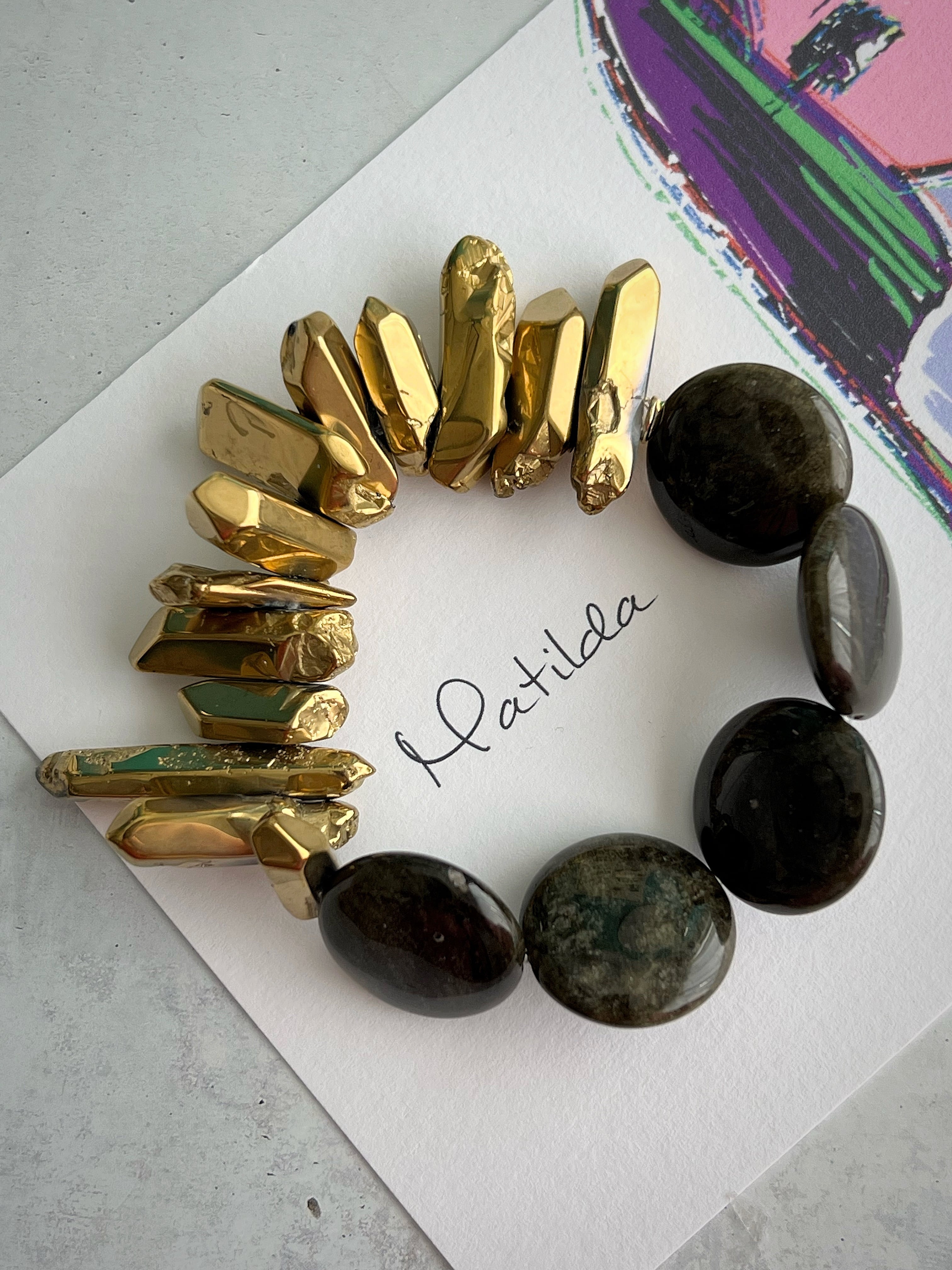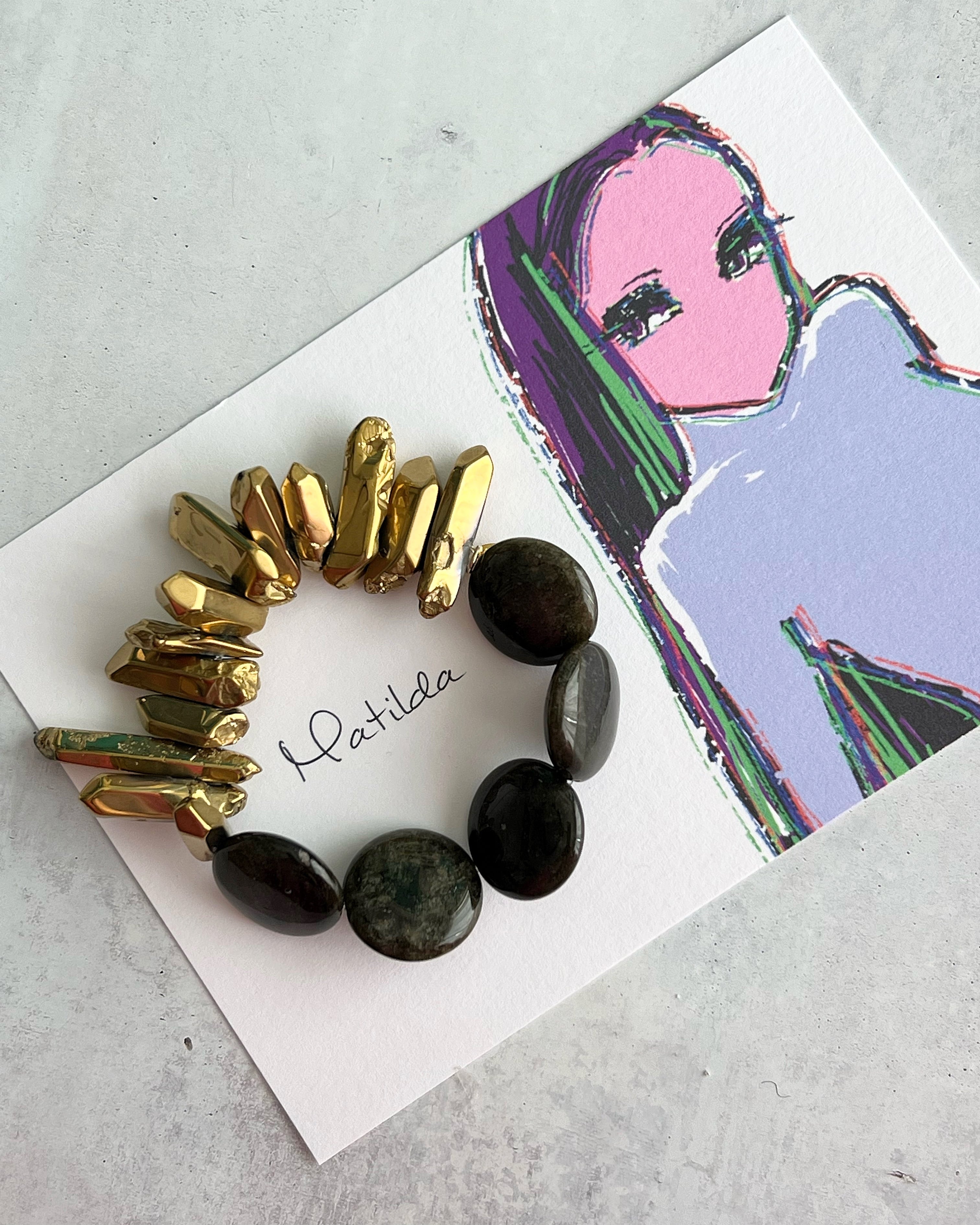 ベルベットのように緻密な肌触りと艶めく黒に鬱金色のインクルージョンやシラーの輝きがまたたく官能的なゴールデンオブシディアンと、自然の結晶のシェイプを生かしゴールドコーティングを施したクールなクリスタルをあわせて。