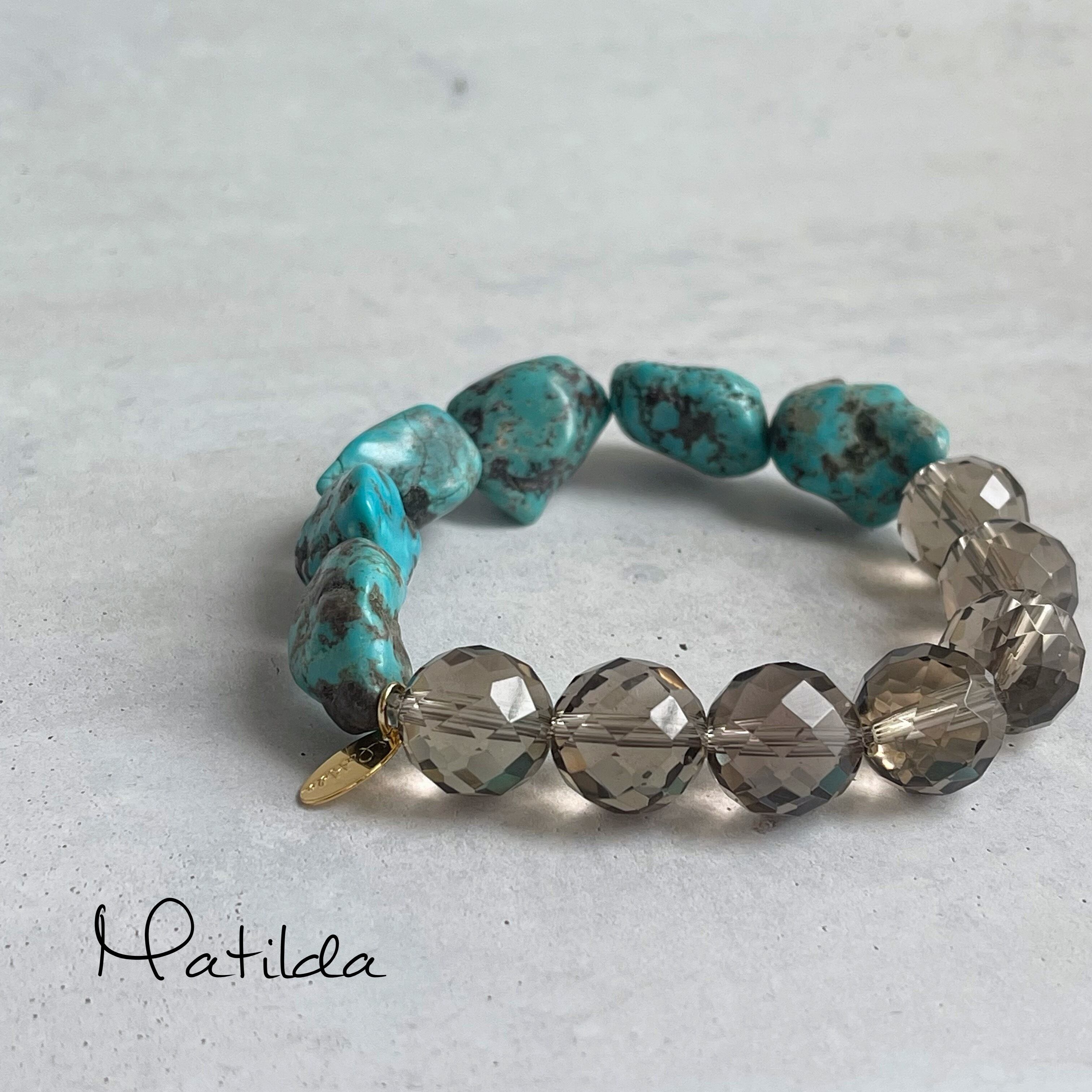 マットなブルーグリーンに自然なシェイプが野生的なターコイズと多面体カットとクリアカラーが都会的なスモーキークォーツの対比が、お互いを引き立て合う、クールな印象のブレスレット。