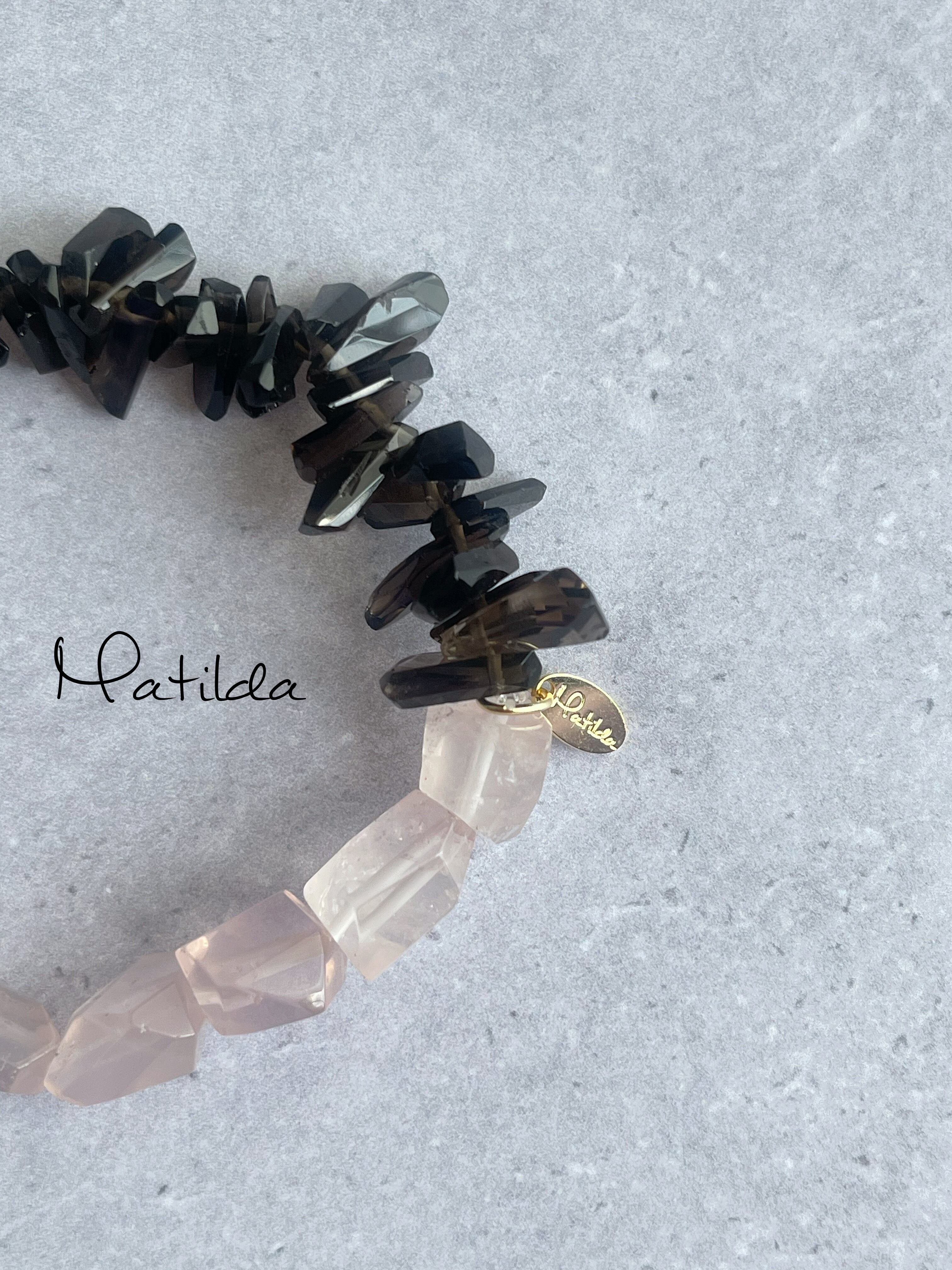 ごく淡い薄紅色が儚げなローズクォーツと、透明感が美しいタンブルカットのスモーキークォーツを組み合わせて。