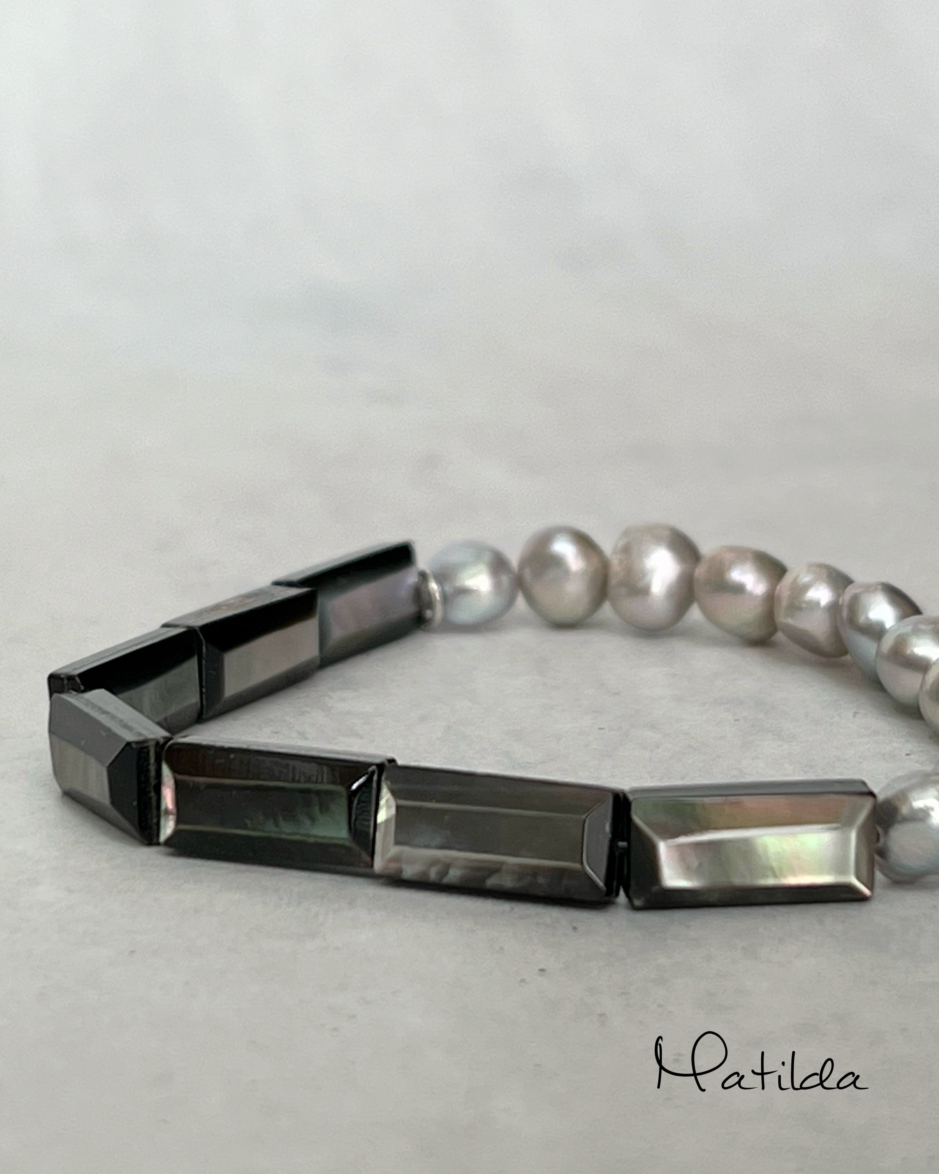 深い虹色の光沢が艶かしいブラックシェルとクラッシィなシルバーの淡水パールをペアに。