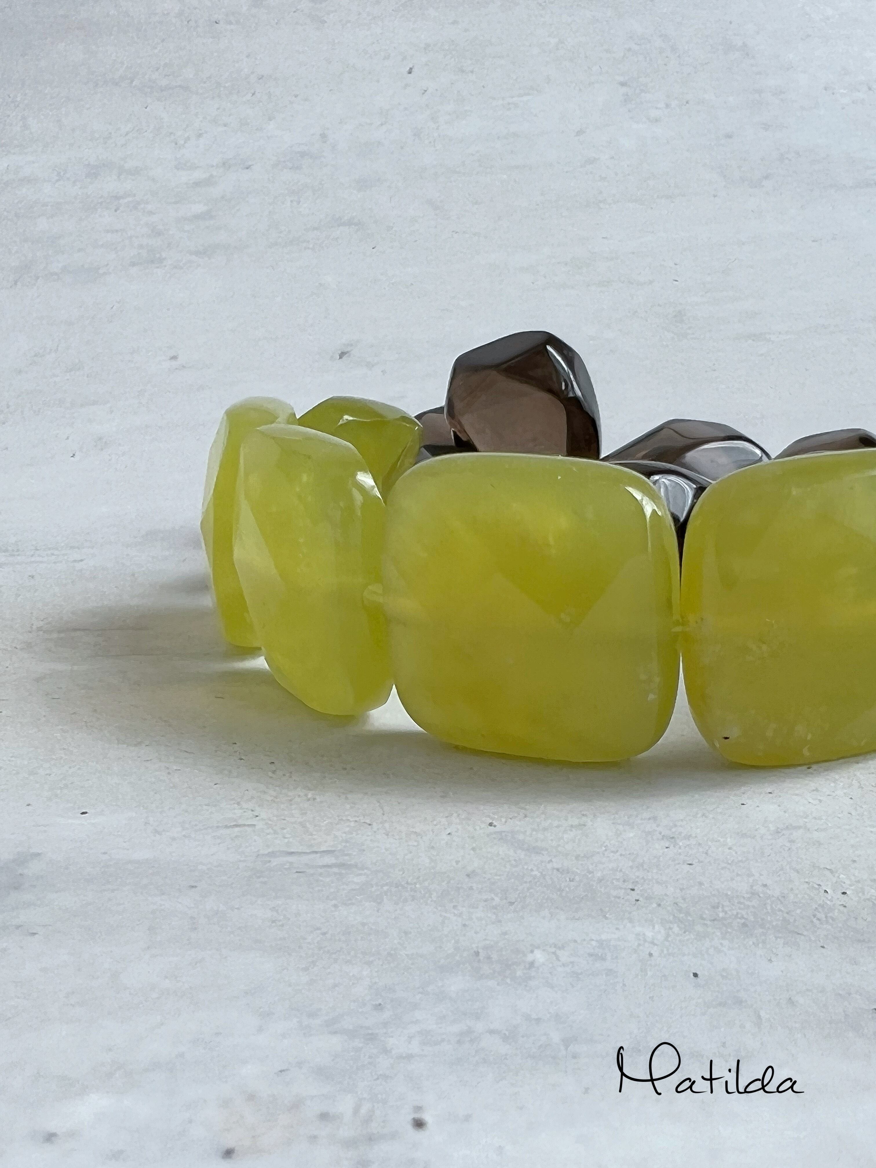 果汁たっぷりのみずみずしい果物のようなオリーブジェイドのタブレットにジューシーな葡萄の果実のようなスモーキークォーツの愛らしいペア。かわいいけど甘すぎない、大人の女性をキュートに彩るブレスレット。