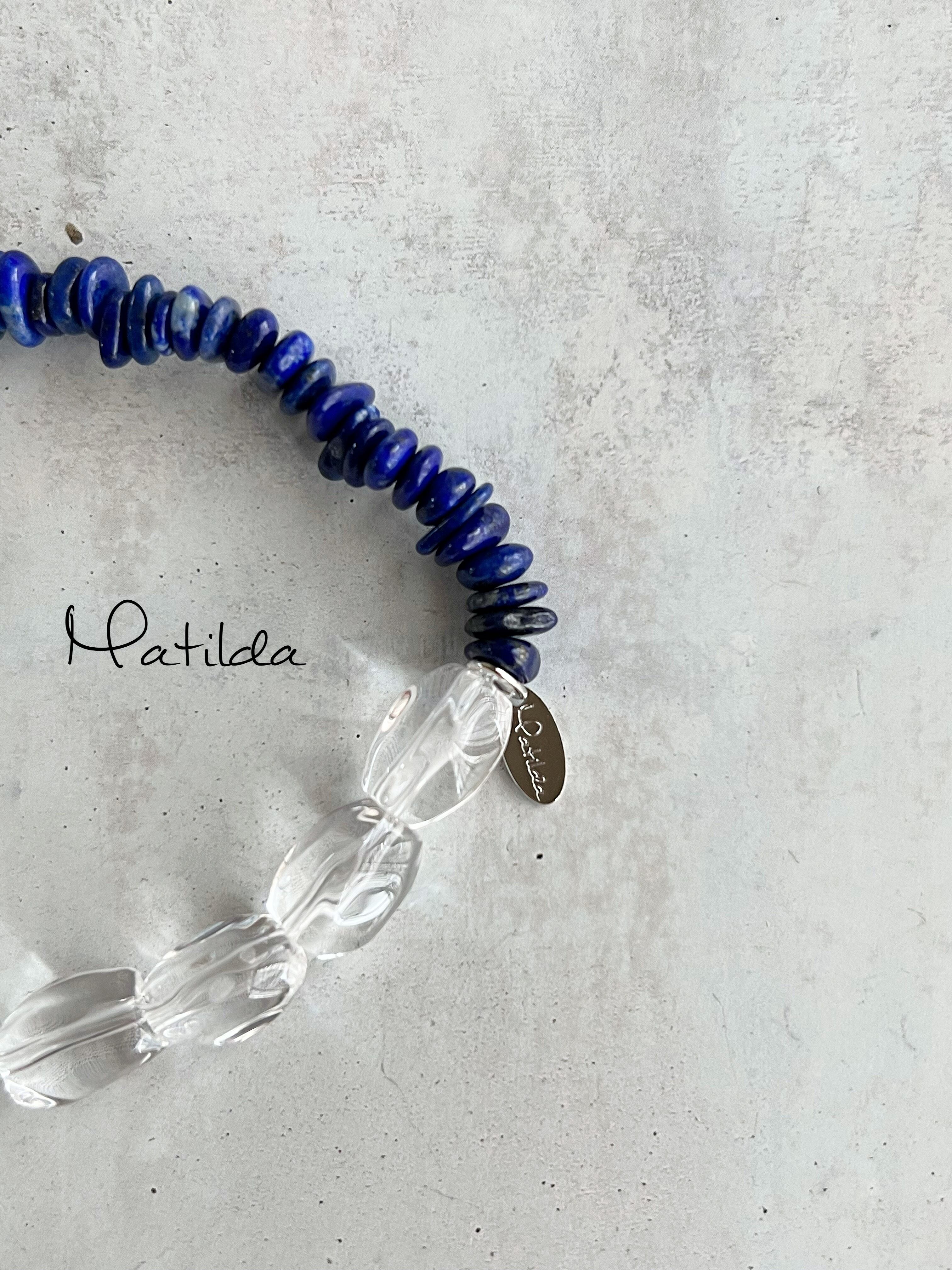 星降る夜空を艶やかなビーズに仕立てたラピスラズリに寄り添うのは、ひんやりと冷たく透き通る水晶たち。