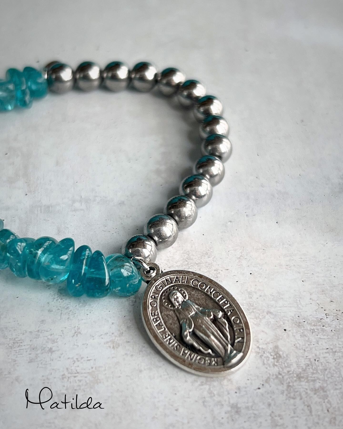 奔放な夏の海のようにクリアで鮮やかなシーグリーンのアパタイトをメタリックなヘマタイトが引き締める。