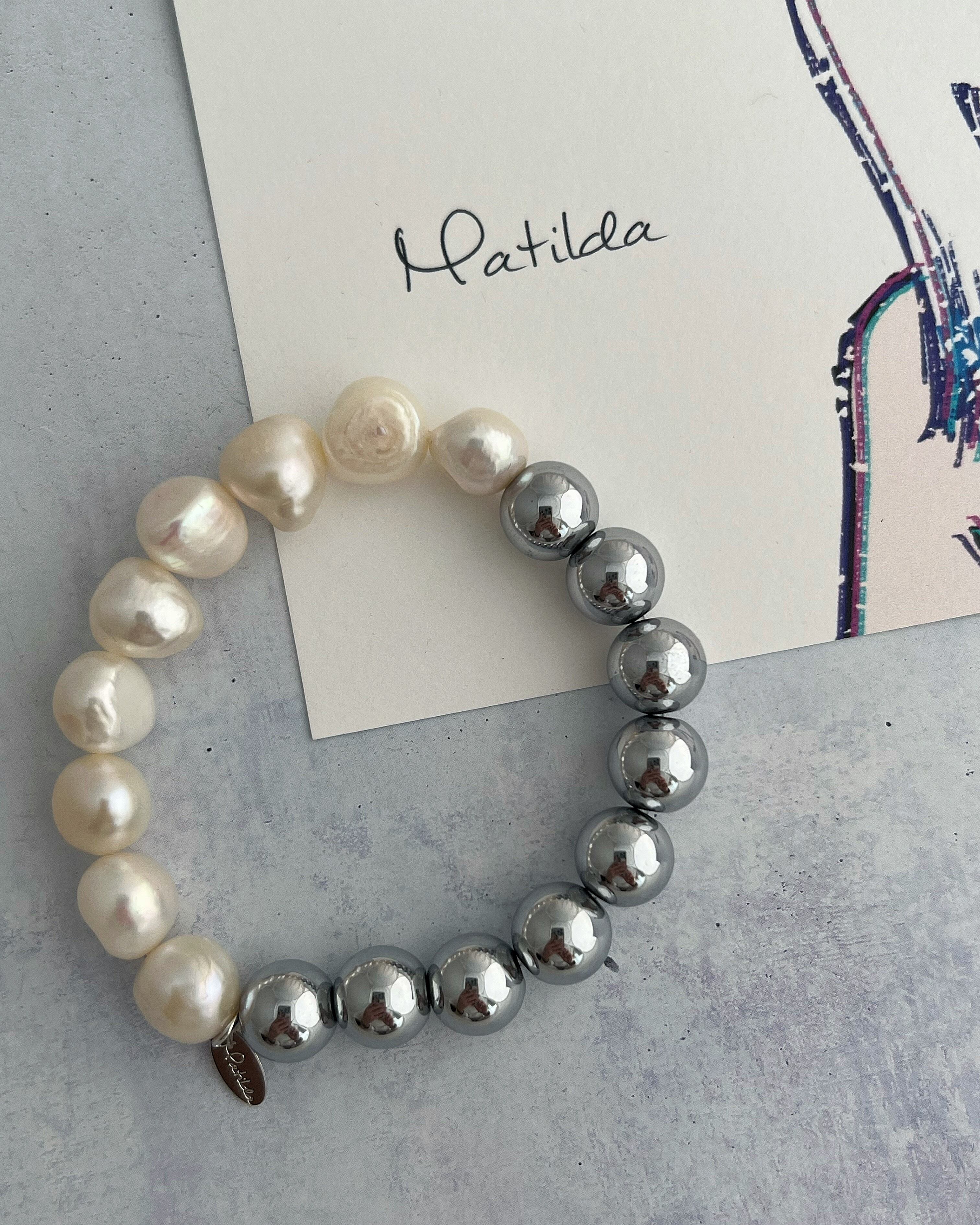 優雅な曲線が気ままにたゆたい、いたずらな淑女の微笑みのような淡水パールにクールでメタリックなシルバーブラックのヘマタイトを合わせて。