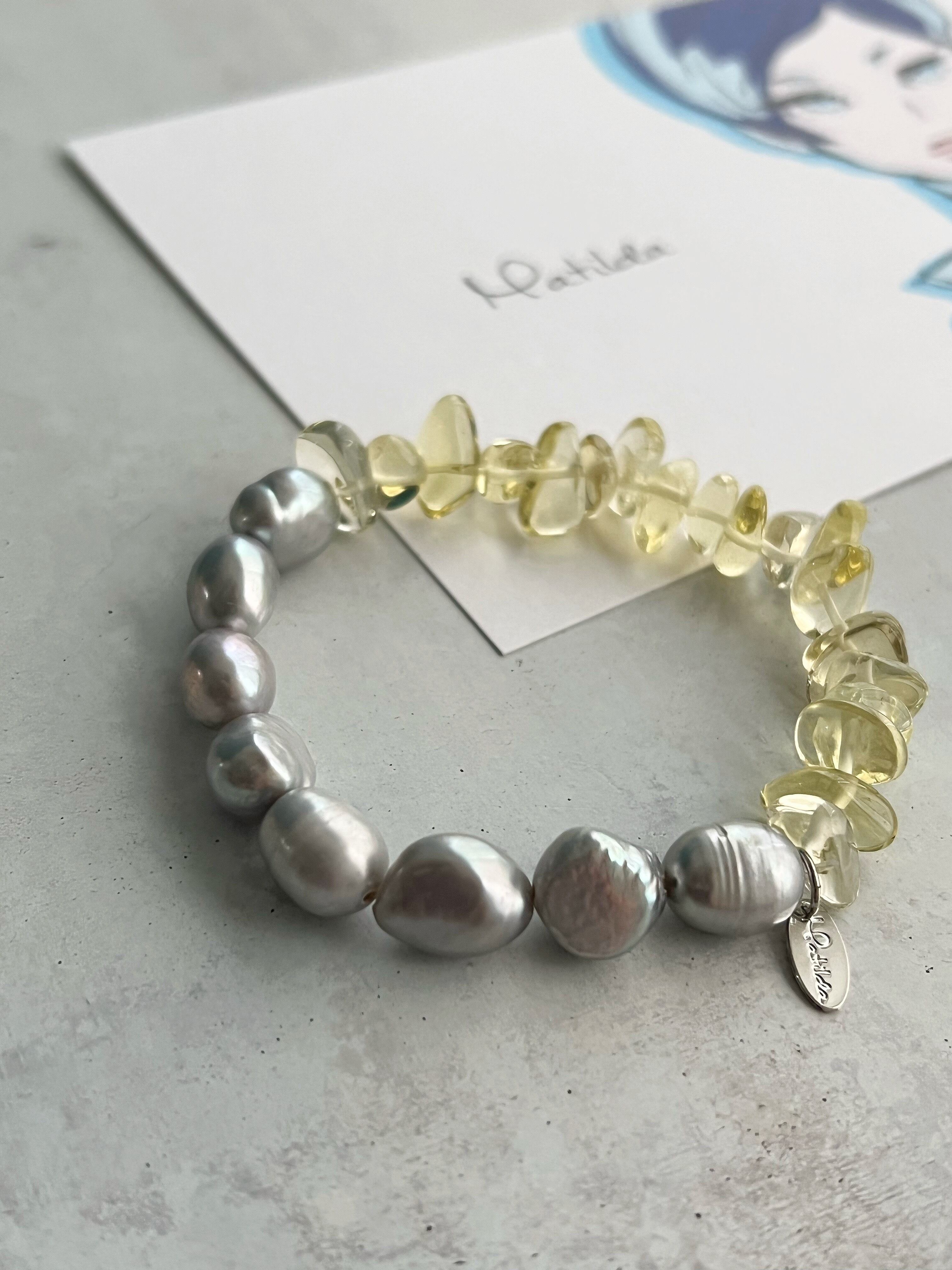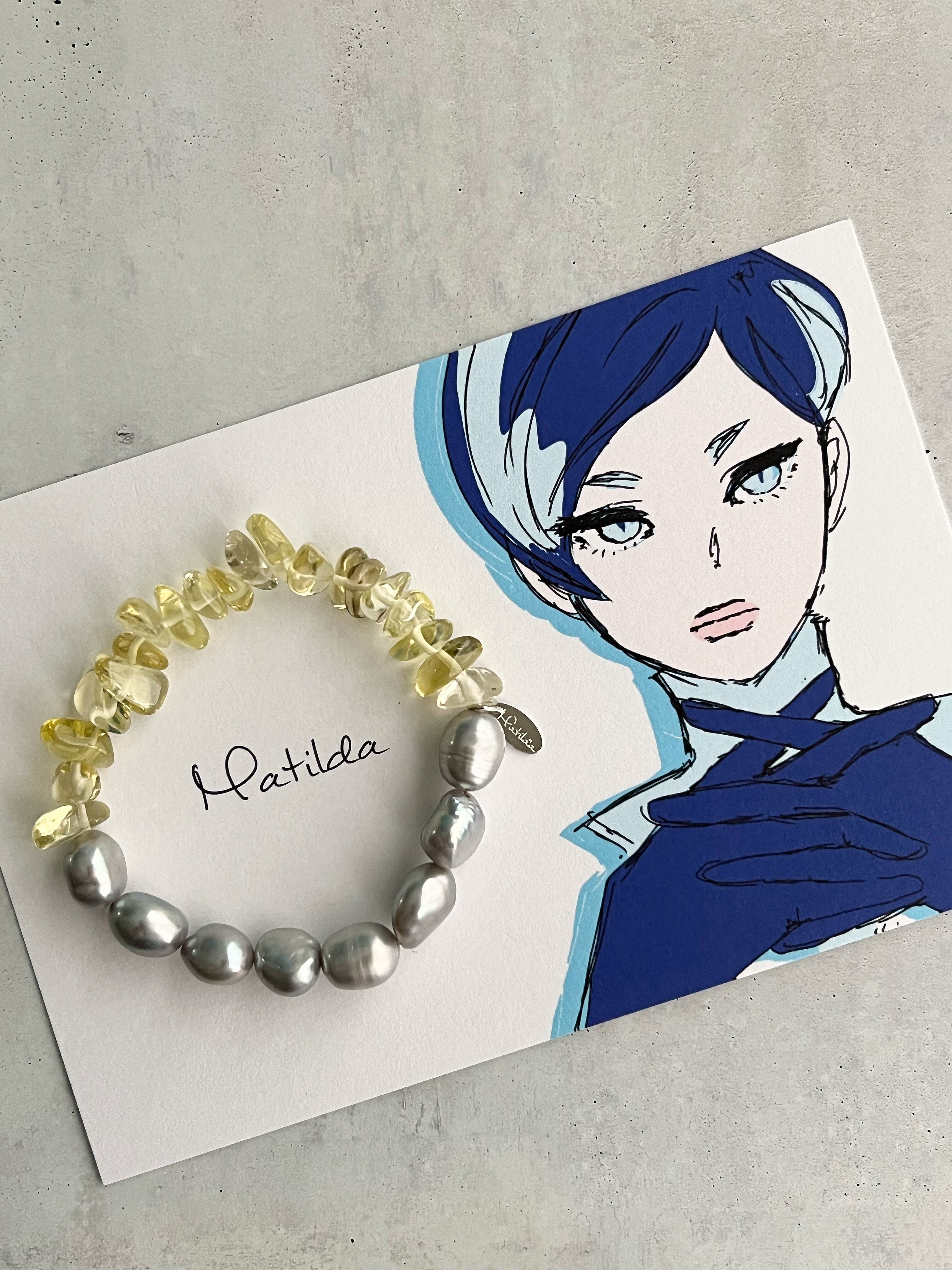 フェミニンな曲線にマットなシルバーカラーを纏わせて知的でシックなエッセンスをプラスした淡水パールに、クリアイエローのレモンクォーツチップが野に咲く花々のように可憐でフレッシュな可愛らしさを添えて。