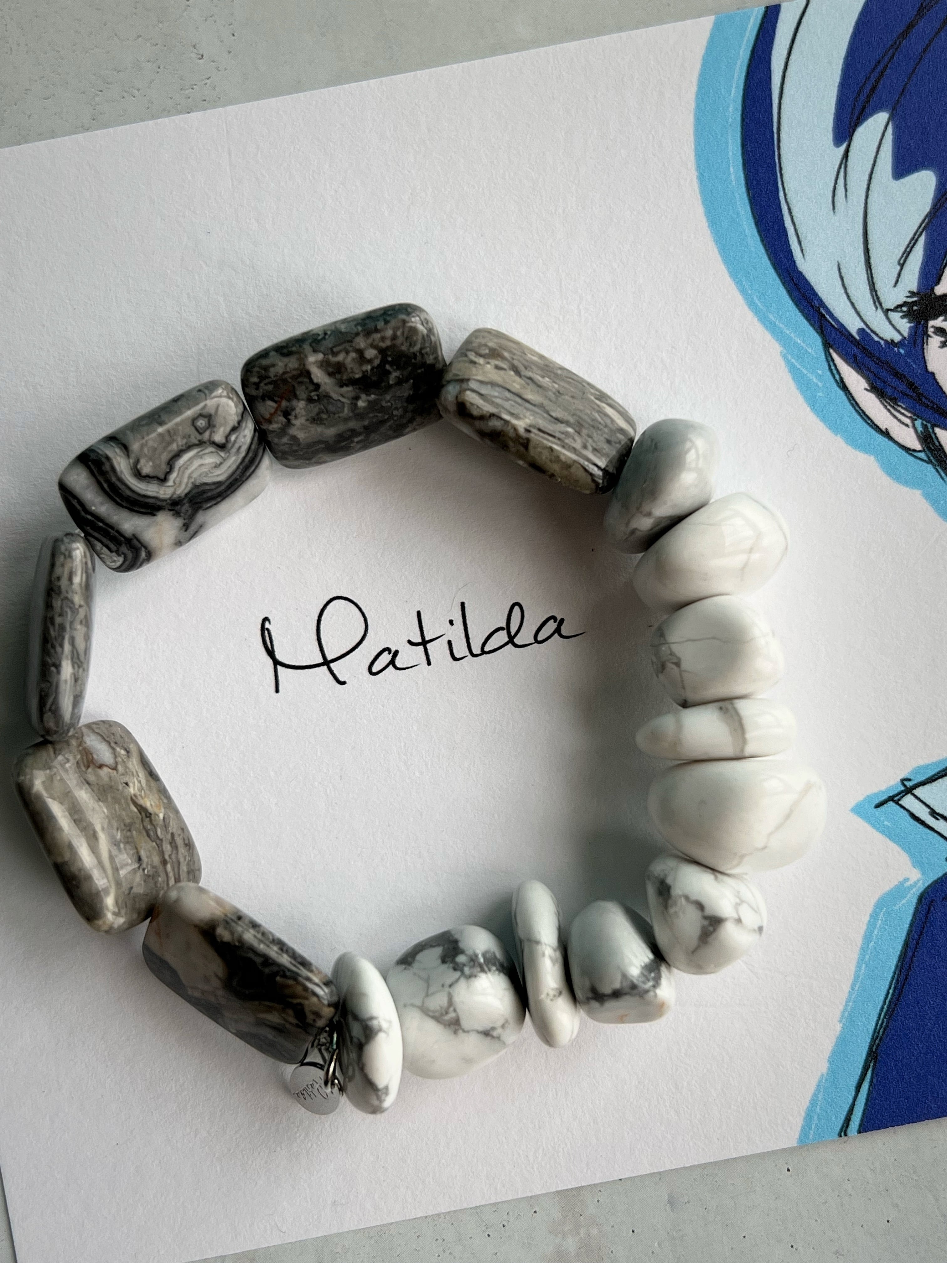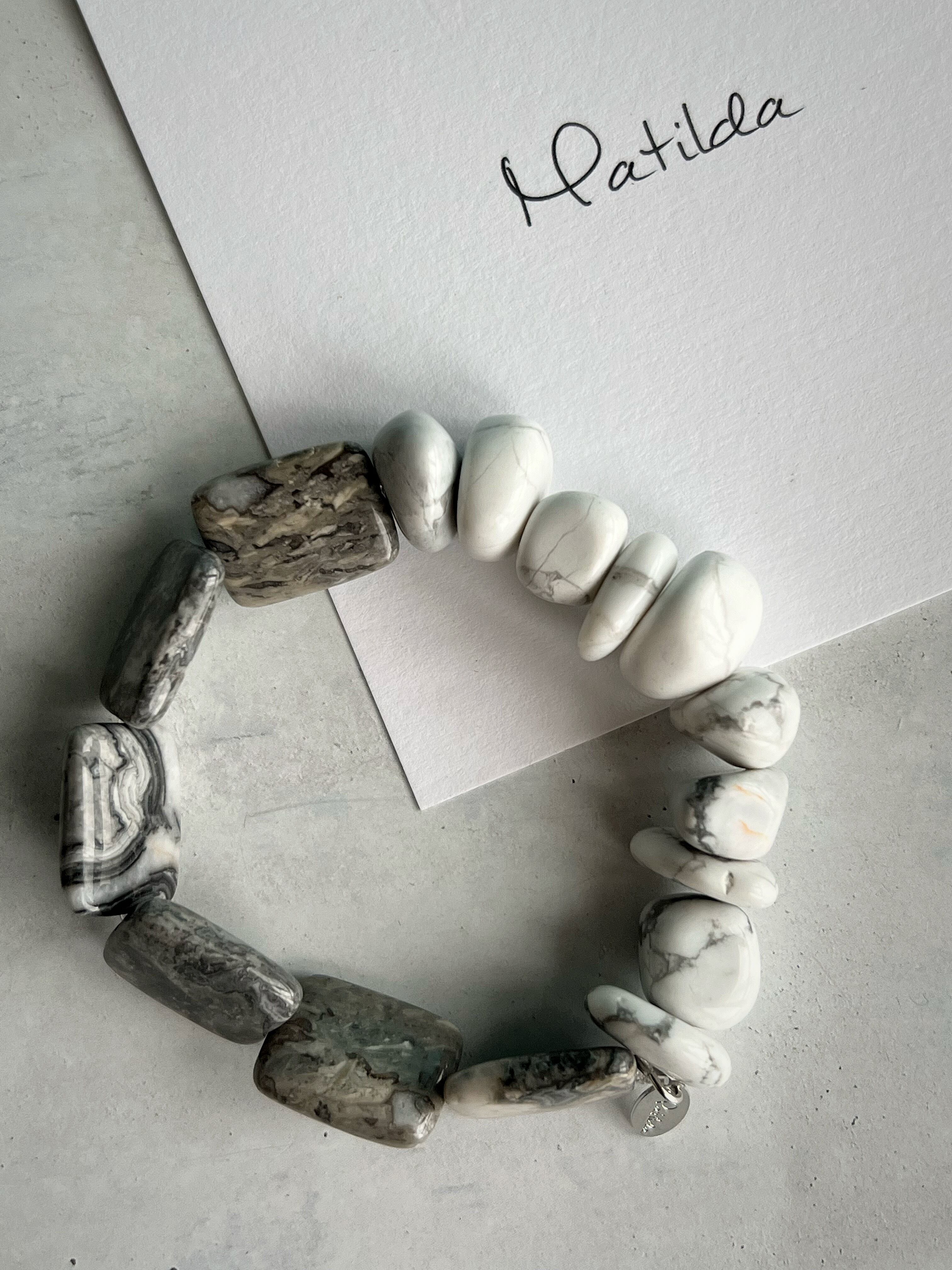 ホワイト×ブラックが繊細に絡み合う端正な石目を生かしたタブレット型のジャスパーに、艶のある乳白色とナチュラルな曲線がクリーンな色気を添えるハウライトを合わせて。