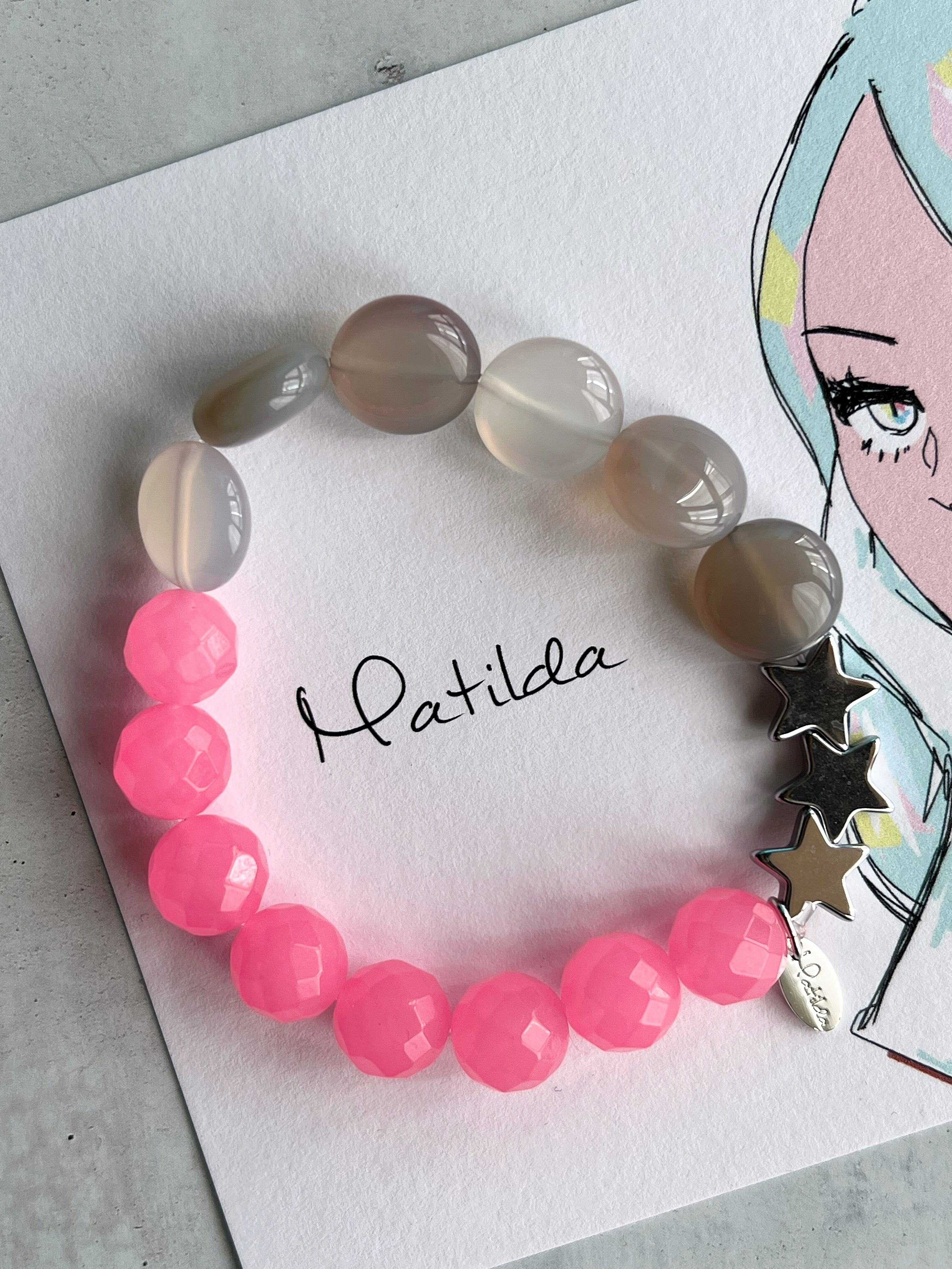今にも飛び跳ねていきそうに思い切りポップな気分にさせてくれるヴィヴィッドなグァバピンクのカラーリングを施したジェイドとやわらかなニュアンスのミルキーグレーのカルセドニーがぎゅっと手を繋いで。