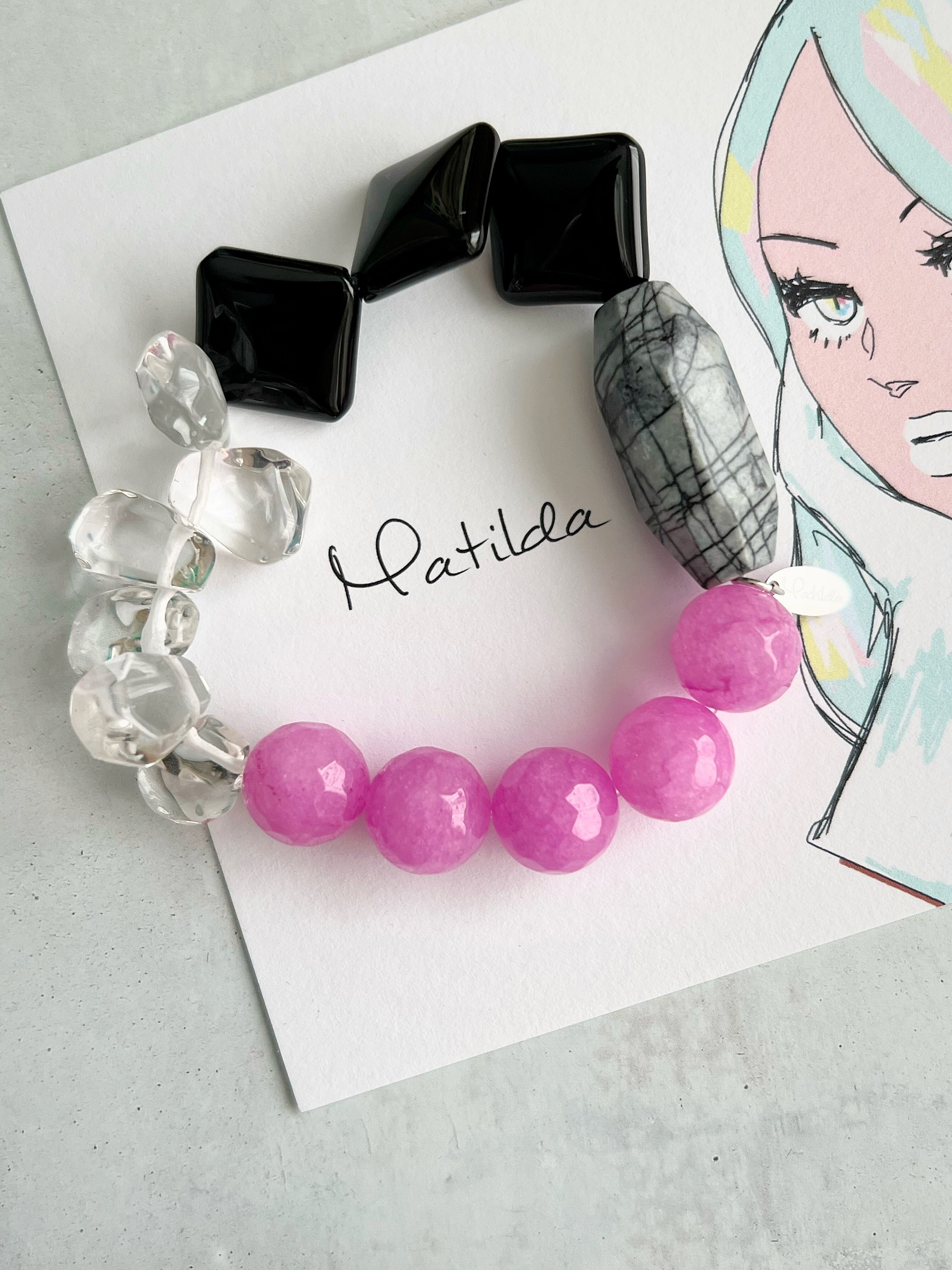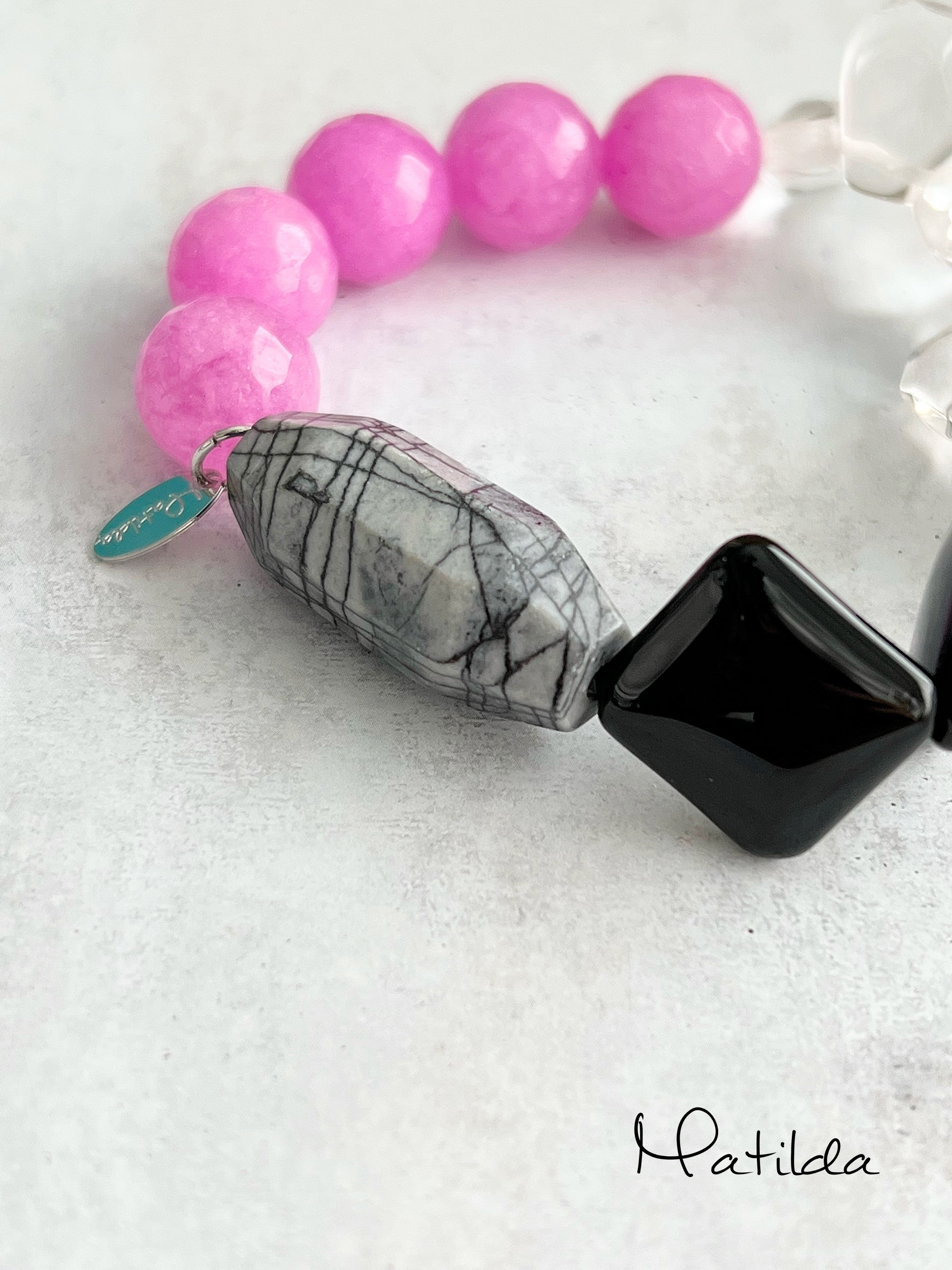 艶やかに磨き上げられたブラックオニキスのスクエアタブレット、主役級インパクトのヘキサゴンカットのゼブラジャスパー、透明な水晶のドロップが創り出すクールなモノクロームの世界で、コケティッシュなフューシャピンクに色づいたジェイドのビビッドなカラーが弾けて目を惹かれずにはいられない。