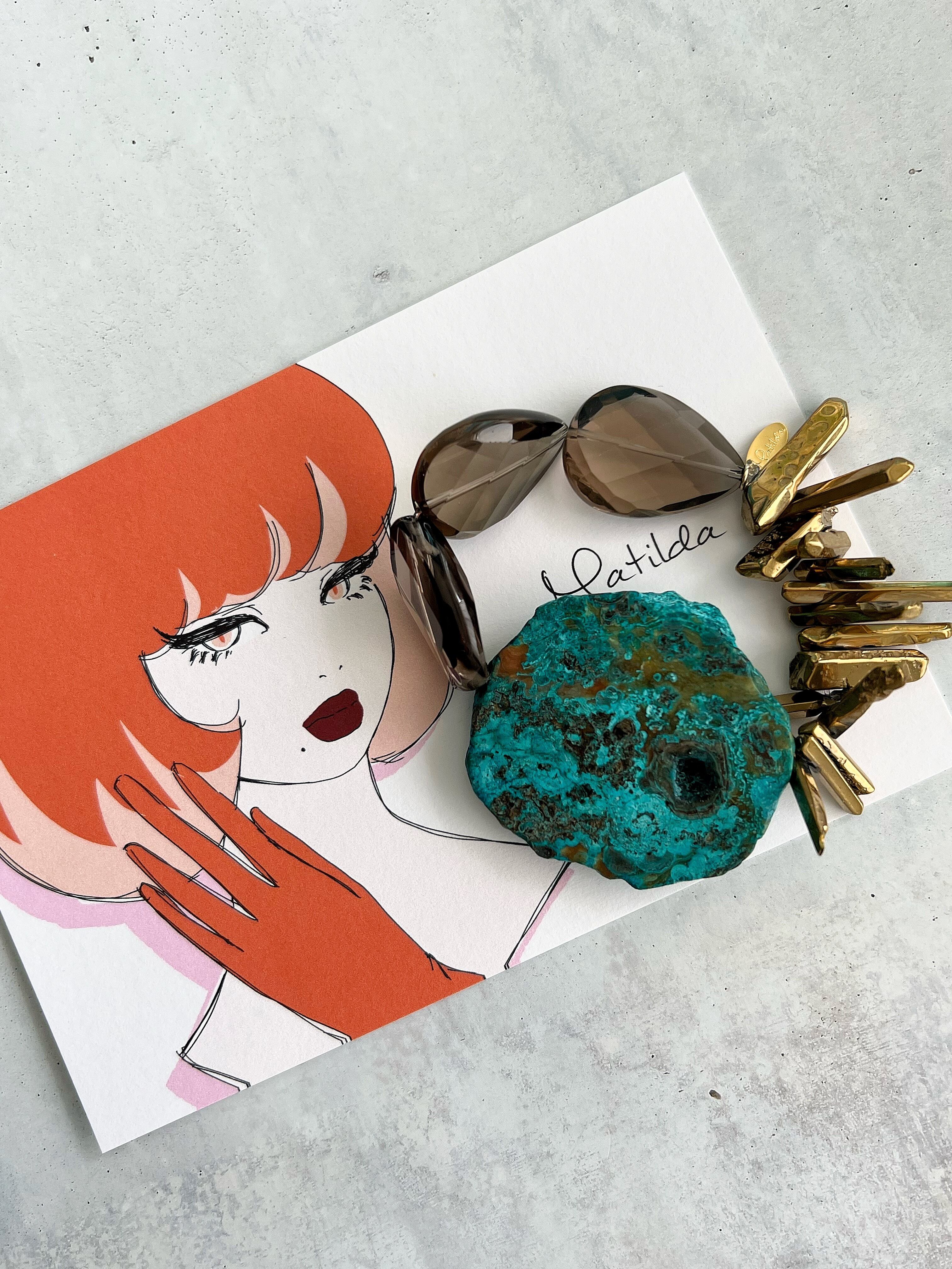 ジャスパーの存在感を際立たせるようにモードなゴールドコーティングを施した水晶が添わせ、大胆でワイルドなペアを端正なカッティングのクリアグレーのスモーキークォーツが繋いで大人の上質さをひと匙くわえて。