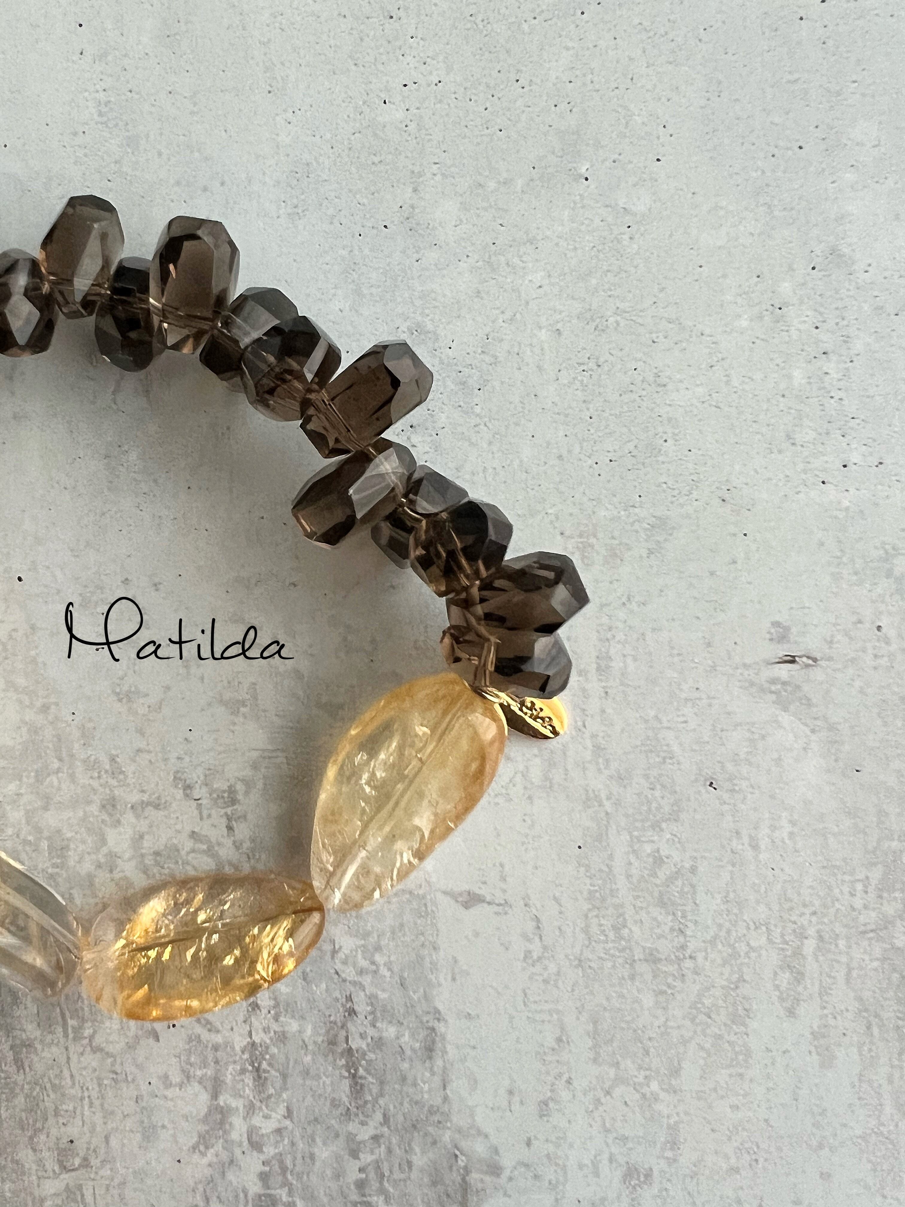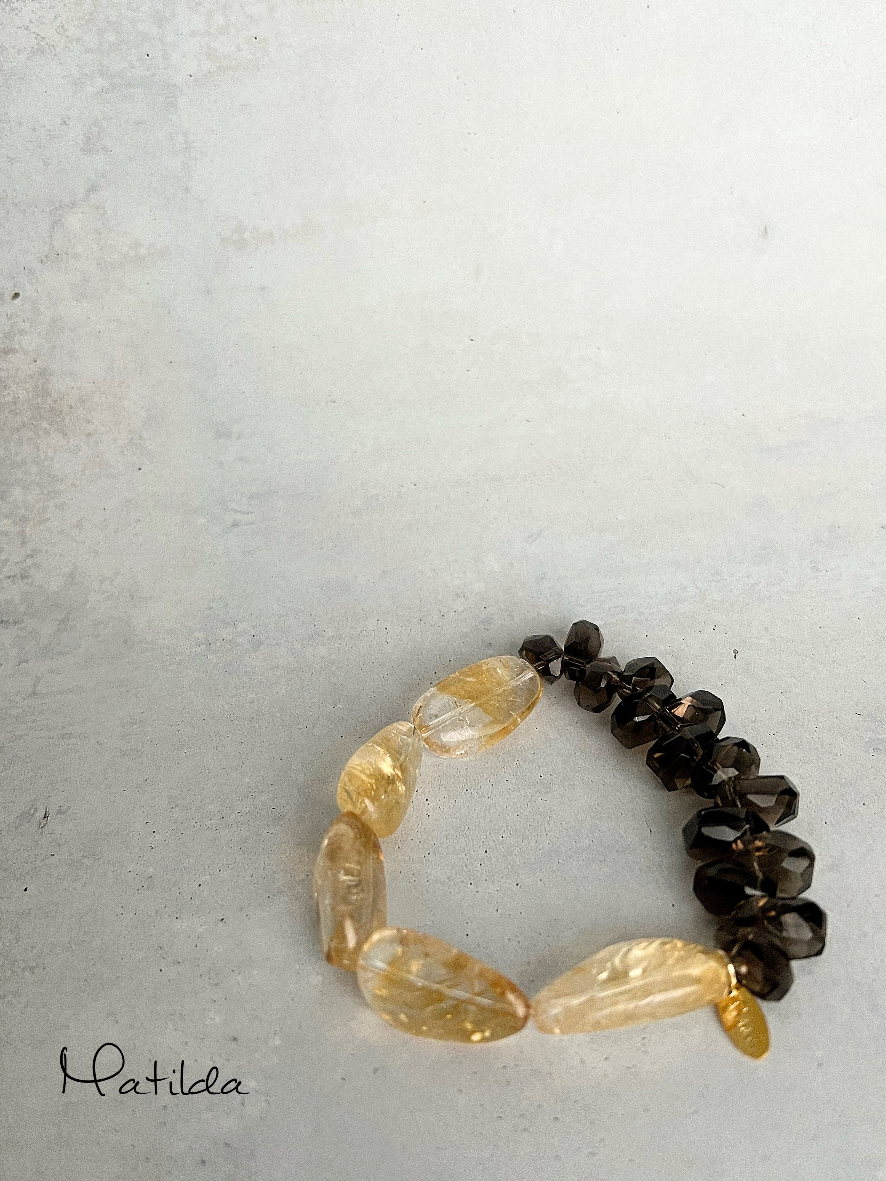 明けゆく朝の空、やわからかにそして鮮やかに輝く陽光を溶かし込んで清らかに透けるゴールデンイエローのシトリンと、穏やかなうす闇色があたたかな安らぎの時を告げる粒ぞろいのスモーキークォーツをペアリングしたブレスレット。