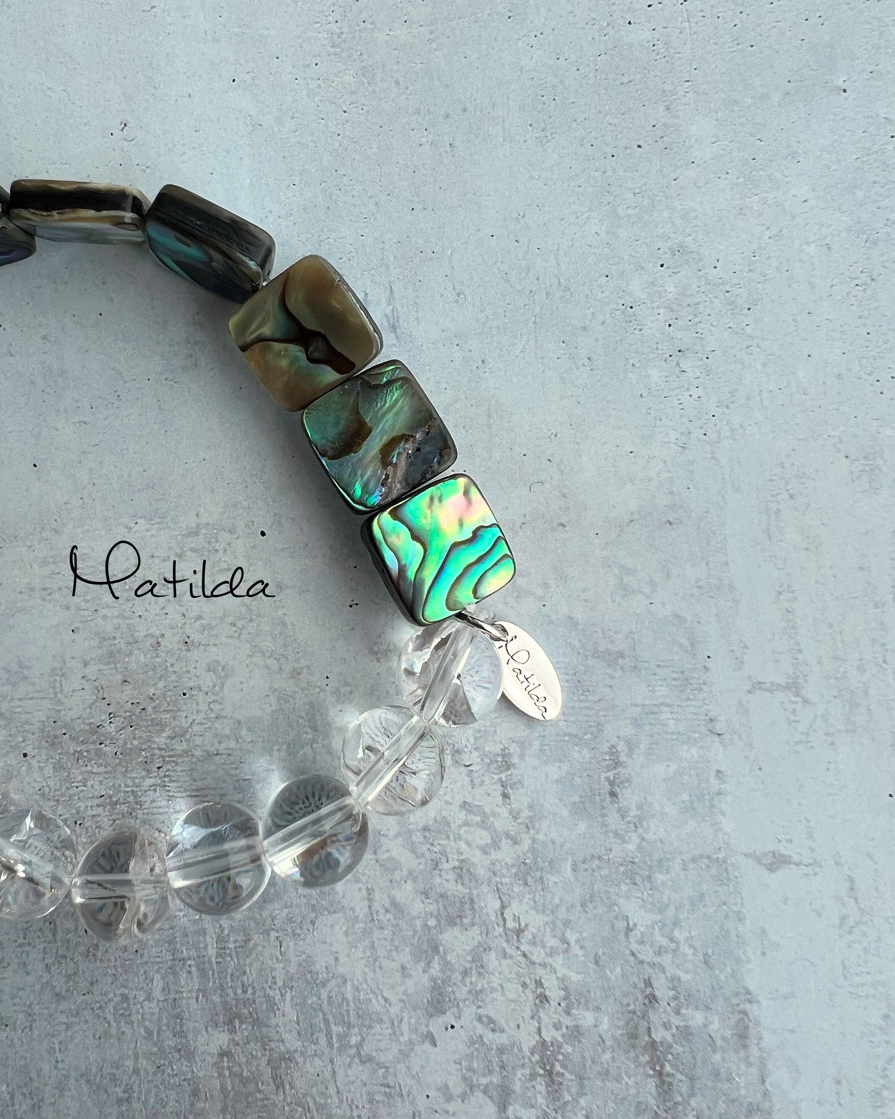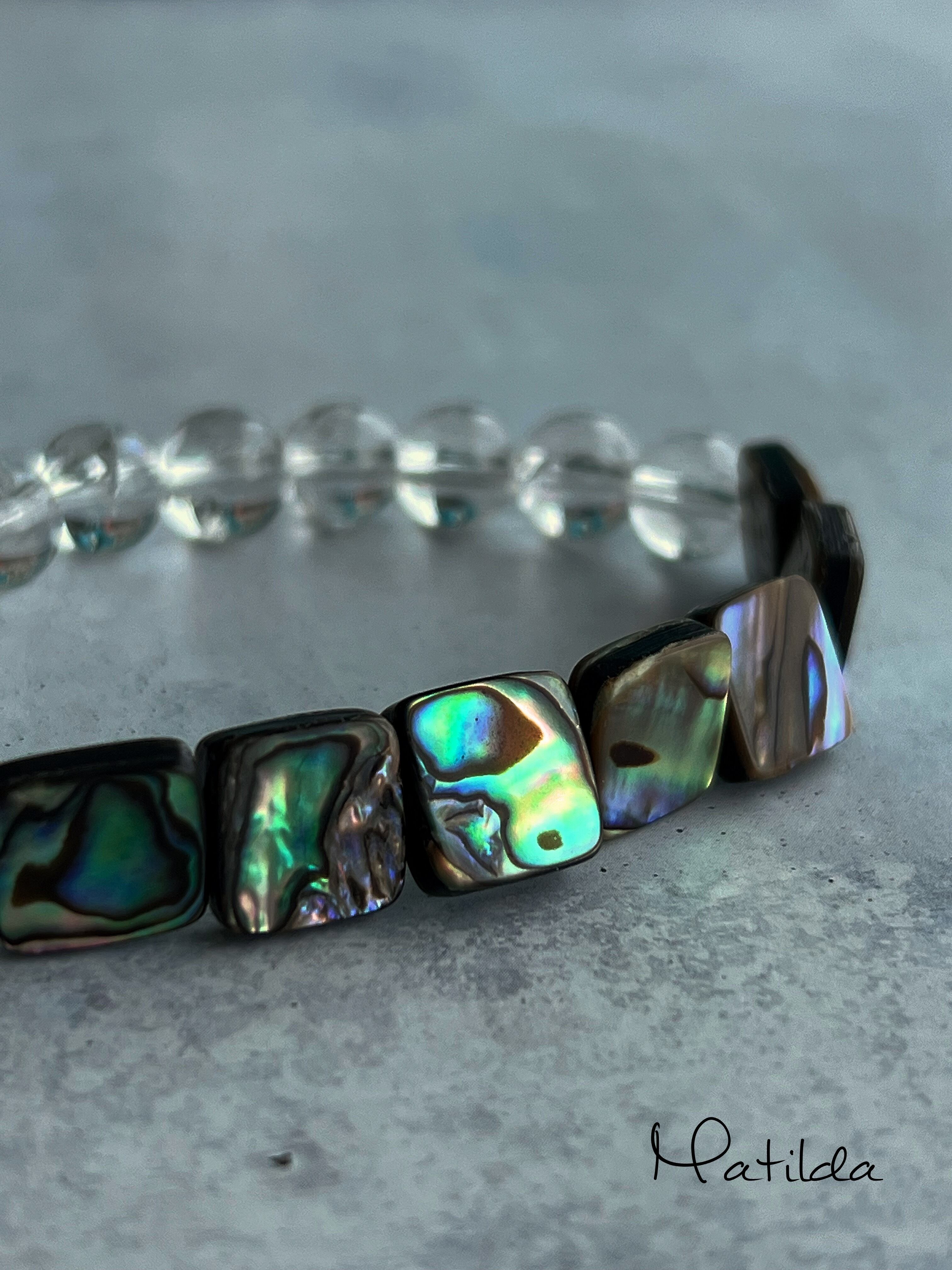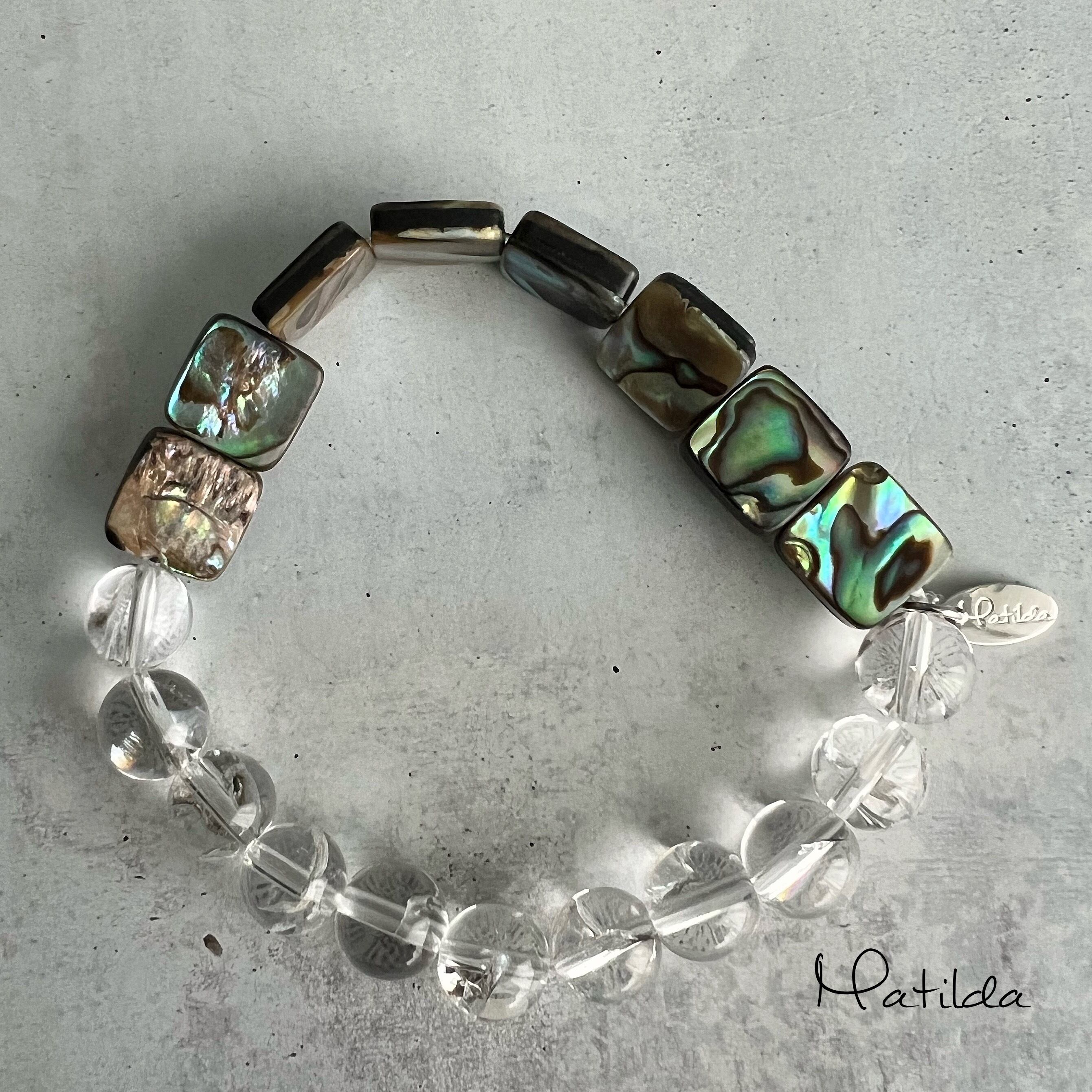 インパクトのあるアバロンシェルと合わせるのは透明度の高いクォーツのクラックに反射する光が虹色に輝くアイリスクォーツのスフィアビーズ。