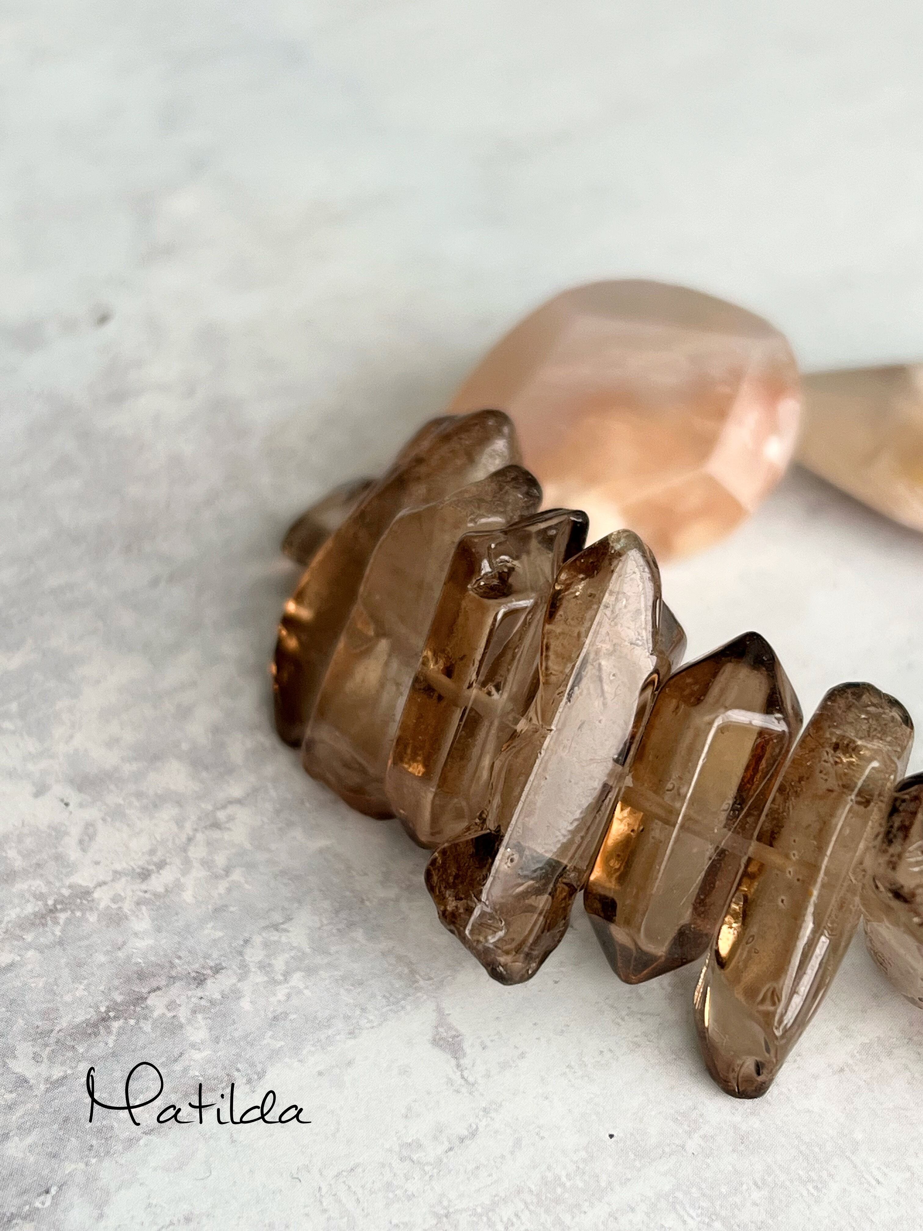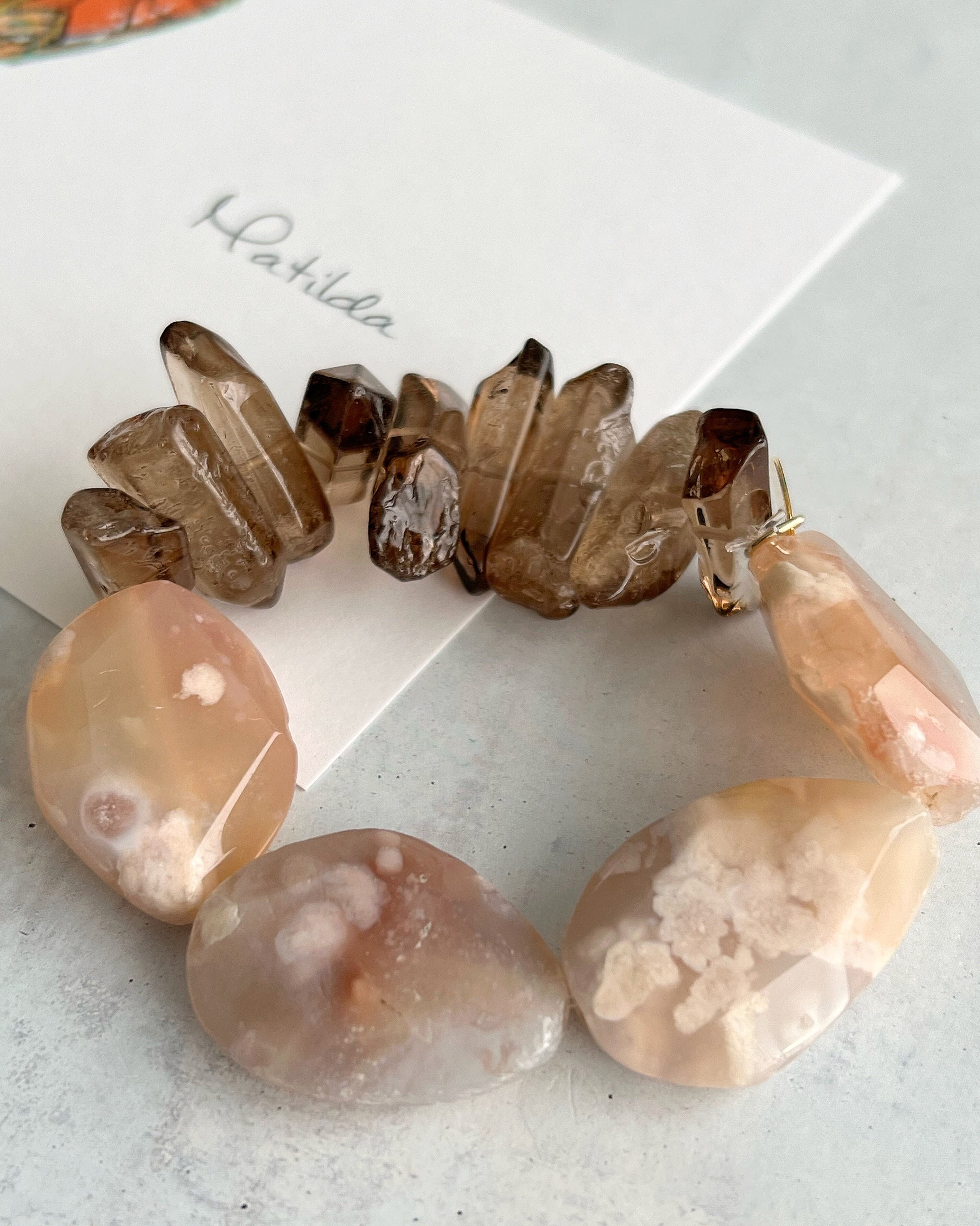 ほんのり紅く色づいたシアーなベージュカラーにミルキーホワイトのインクルージョンが花びらのように舞うチェリーブロッサムアゲートを、クリアブラウンがスタイリッシュなスモーキークォーツのチップと合わせて。