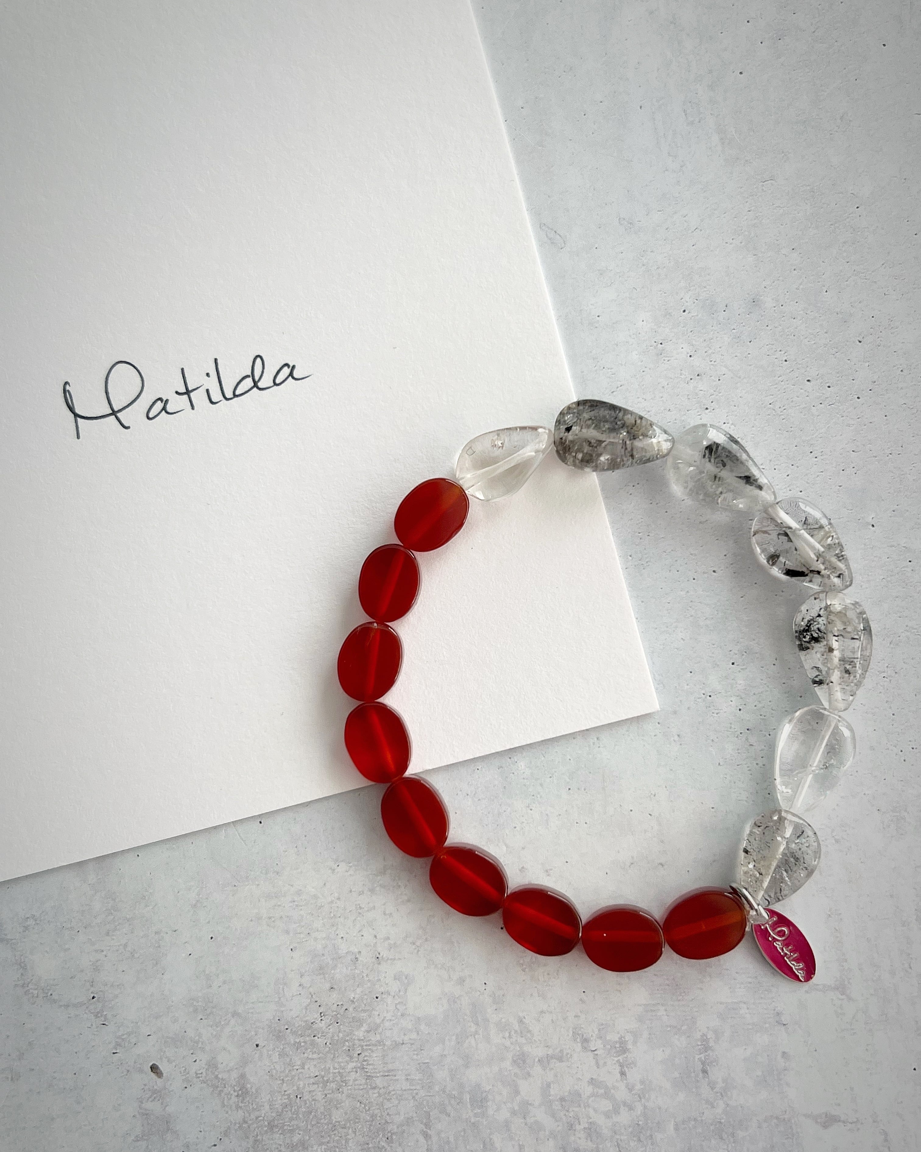 クリアレッドの凛とした存在感が印象的なレッドアゲートとブラックの内包物とクリアなクォーツの対比が力強いブルッカイトインクォーツの清らかなエネルギーと高潔な意思を感じるペアリング。