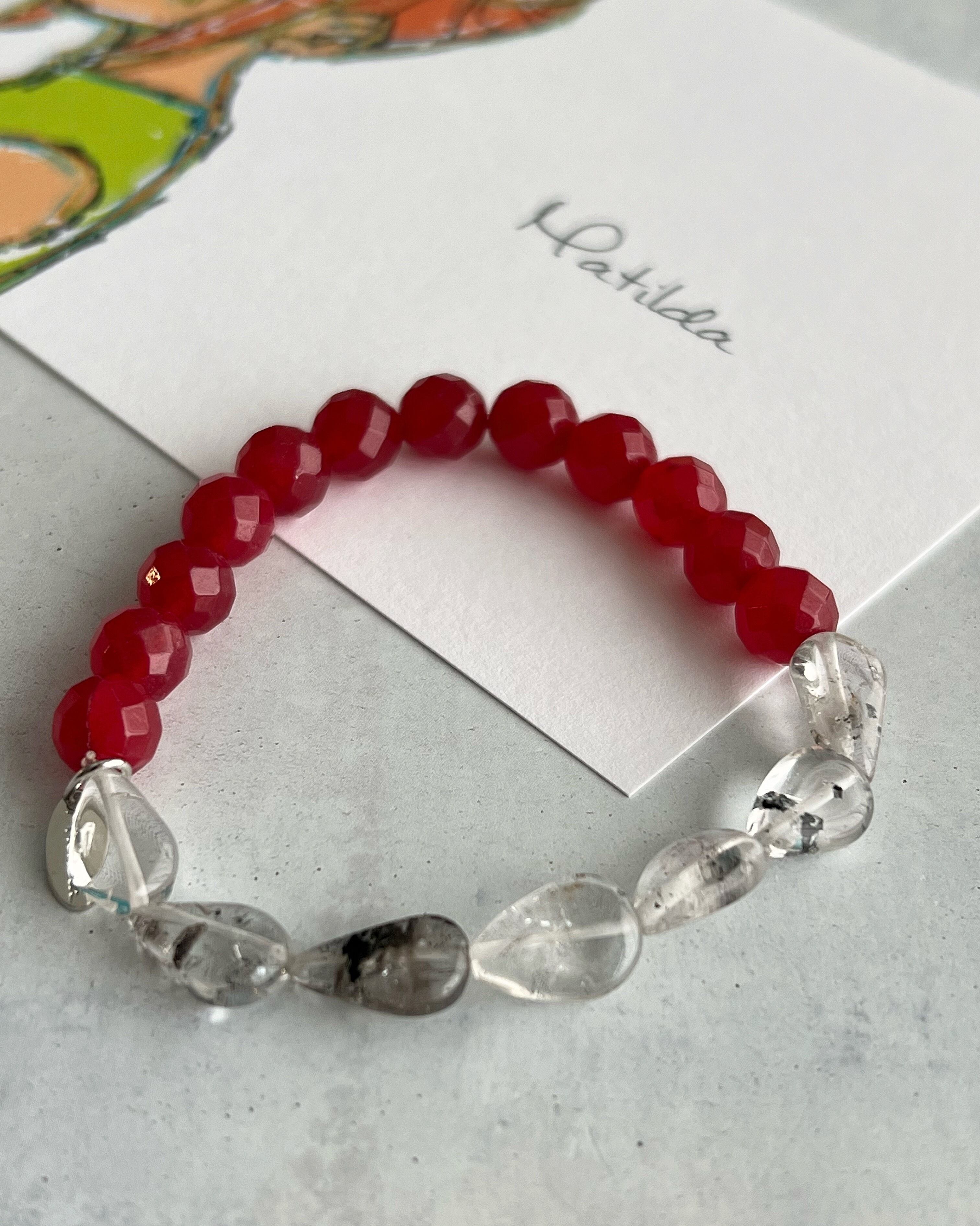 つみたてのラズベリーのようにジューシィなベリーレッドと丸みのある多面体カットがポップな印象のジェイドをブラックのインクルージョンがシャープで個性的な存在感のブルッカイトインクォーツと合わせて。