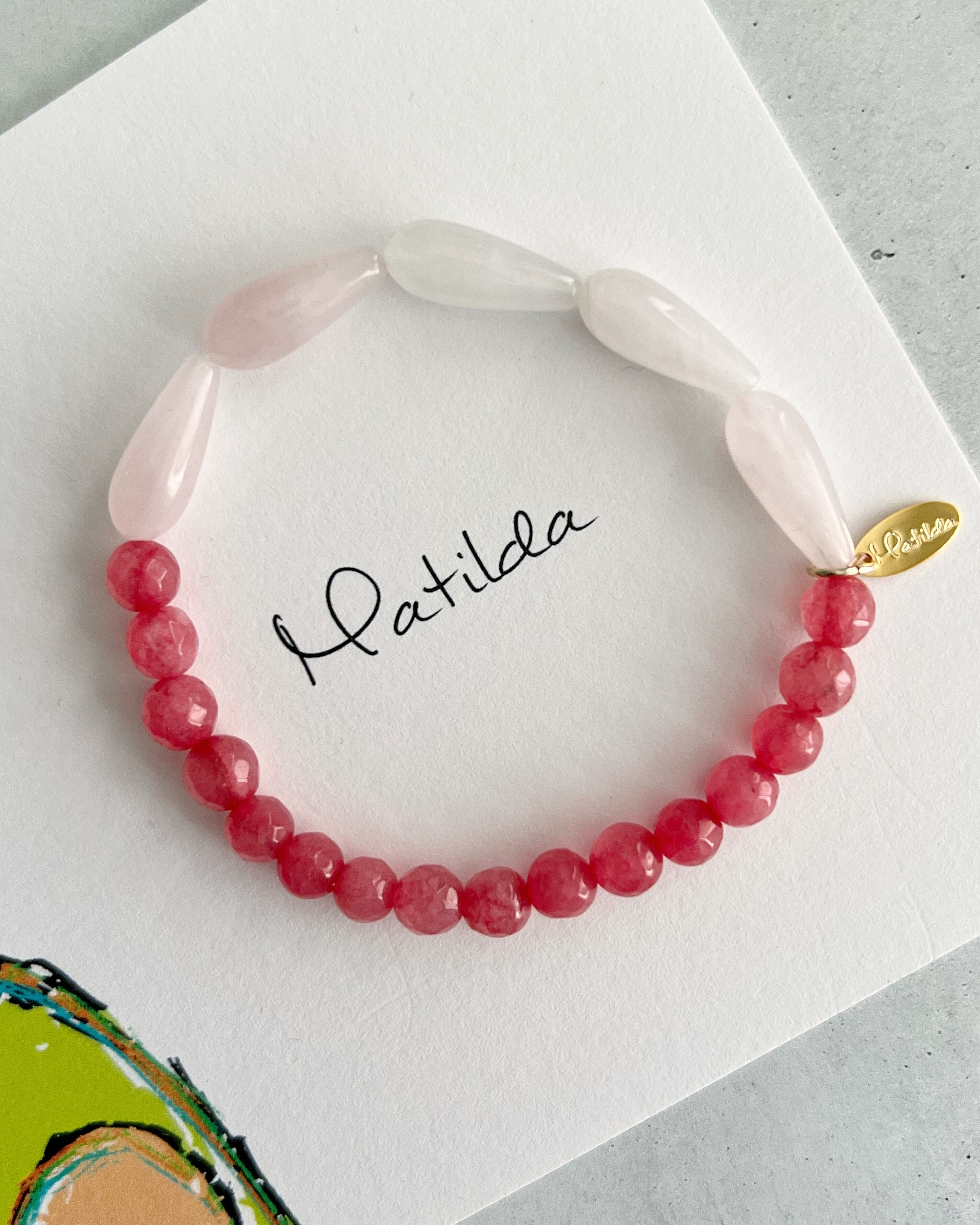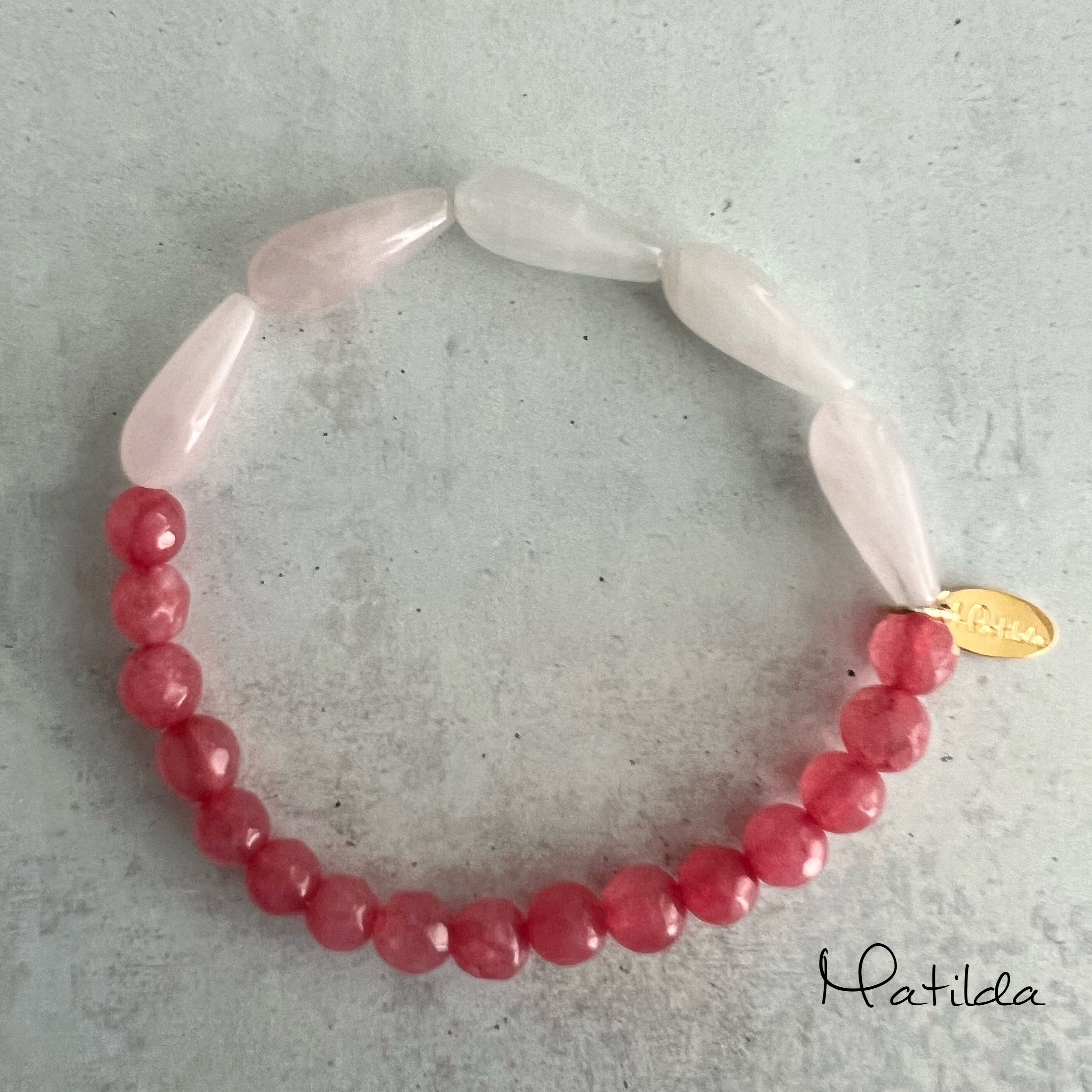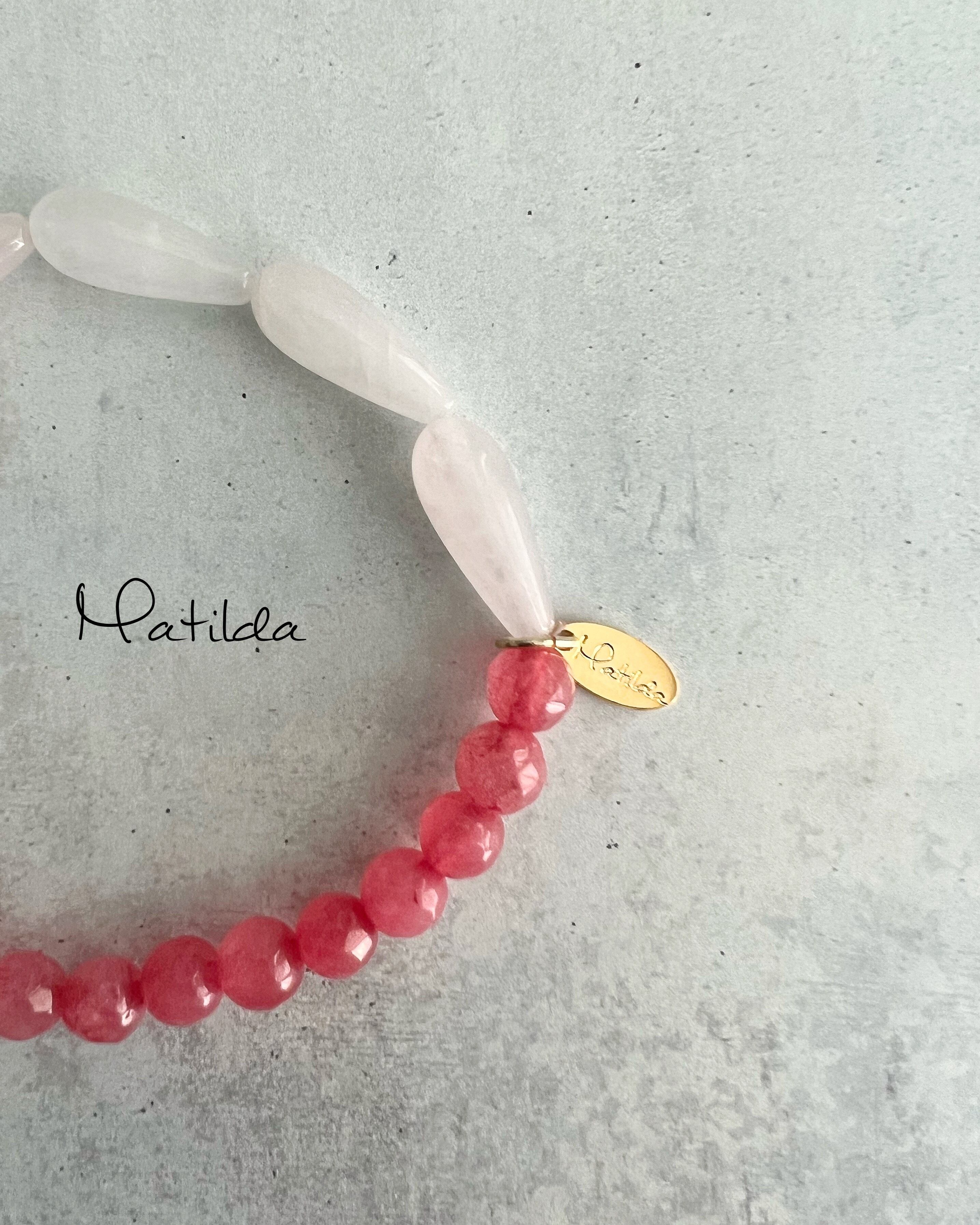 ミルキーなペールホワイトと淡いベビーピンクのグラデーションがあまく柔らかなローズクォーツと、ポップなベリーレッドがキュートなジェイドのペア。