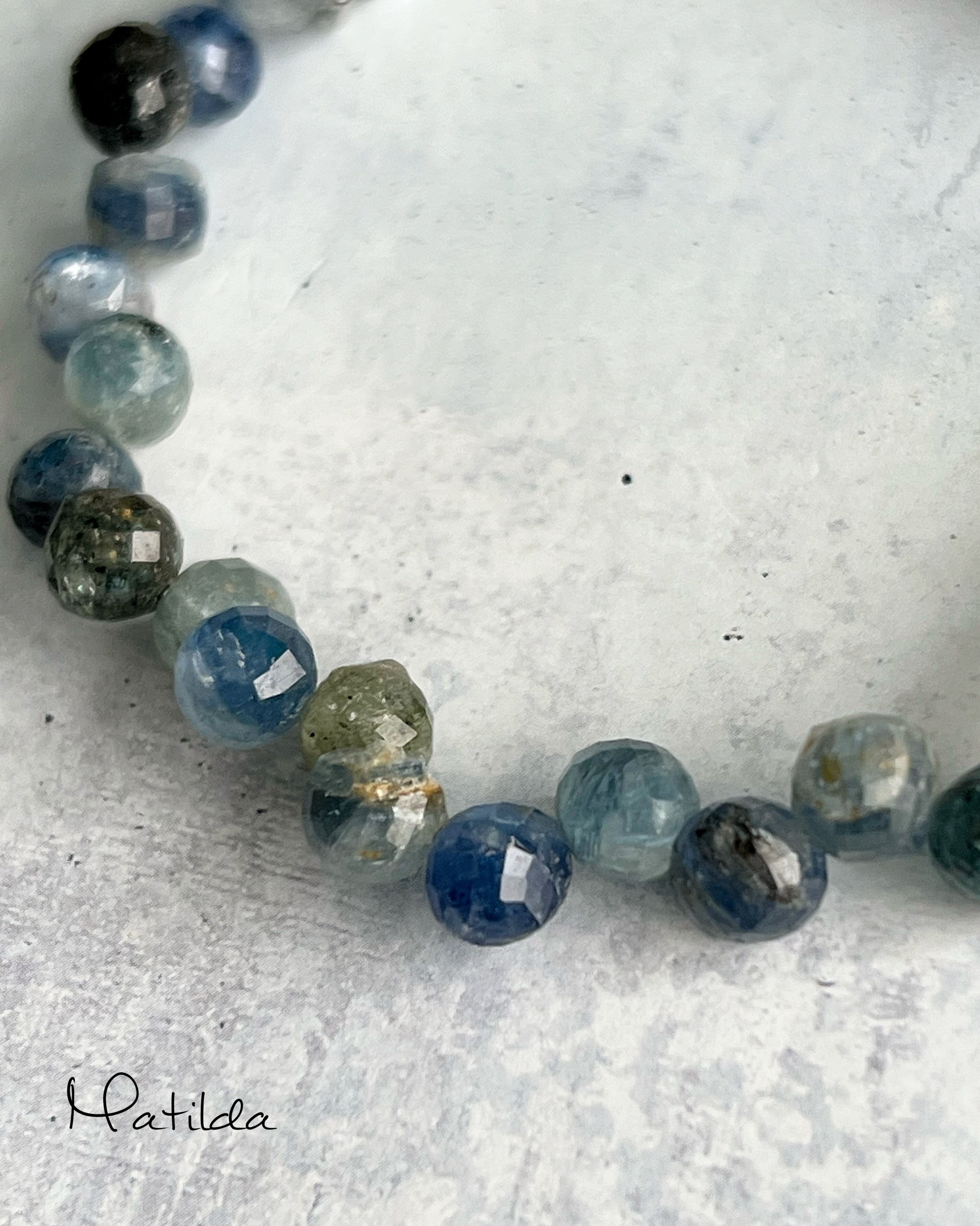パールホワイト、ライトグリーン、ディープブルー…天空で戯れる星々のグラデーションを一粒一粒に宿したカイヤナイトのミニマムなビーズがすずなりに実り、グレーパールのシルクのように艶やかなホワイトシルバーがクールで神秘的な表情を添える。