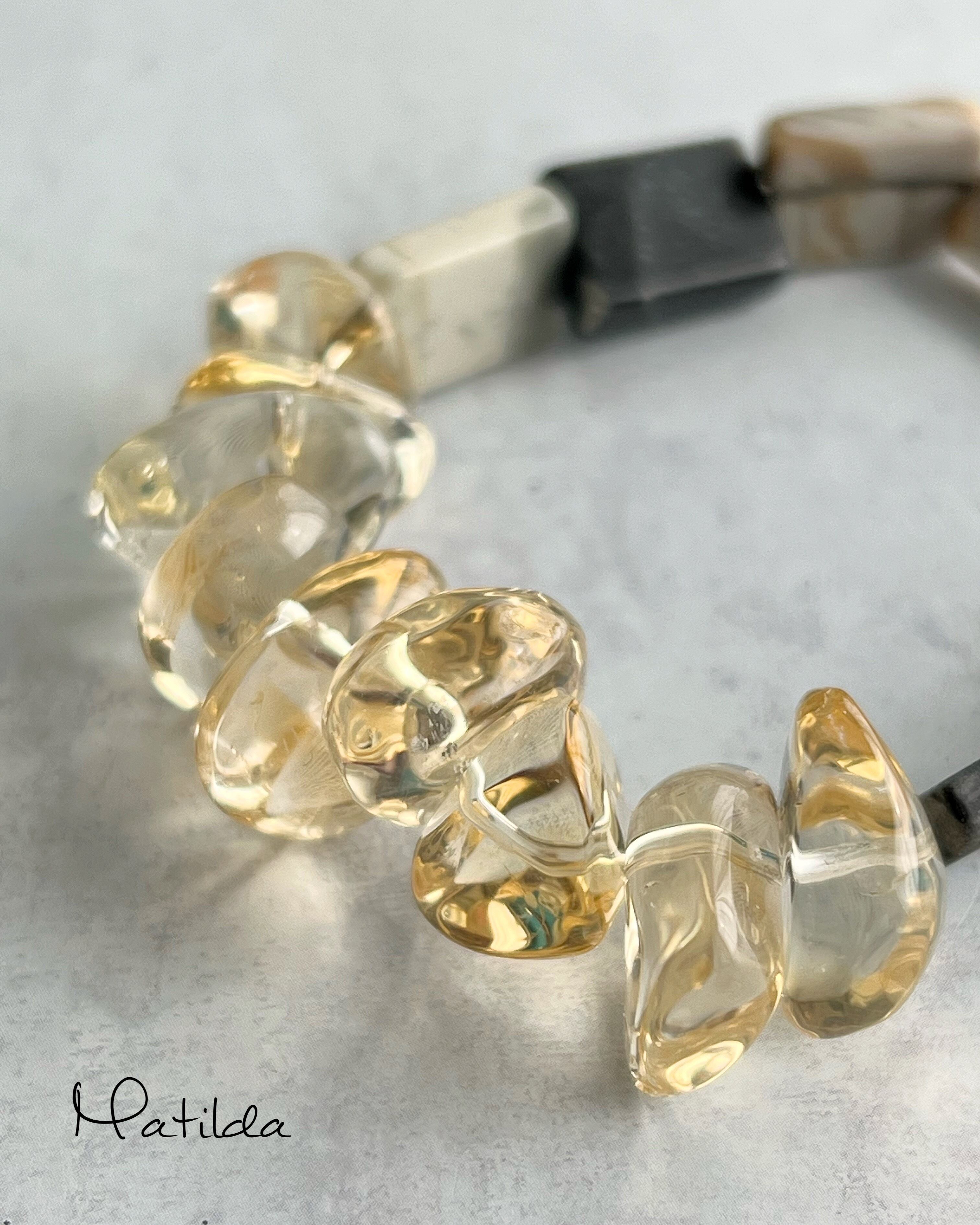 モノクロとセピアカラーが時を超えて愛され続けるモザイク画を彷彿とさせる端正なピカソジャスパーのタブレットに、シトリンのタンブルチップから淡く透き通るアンバーイエローの光が陽光と融け合うように滴り落ちる。