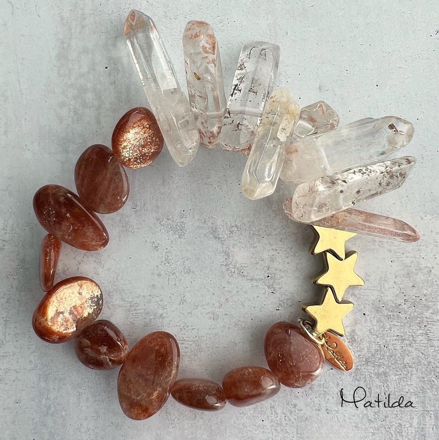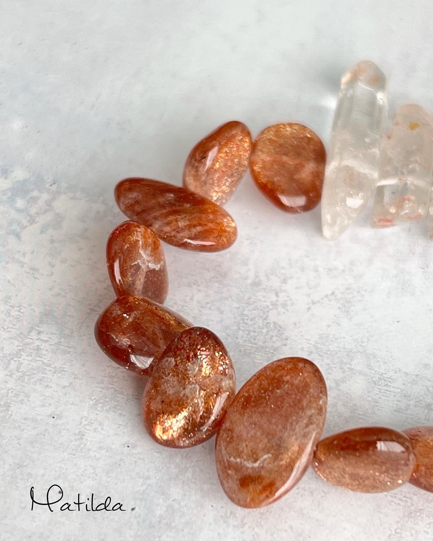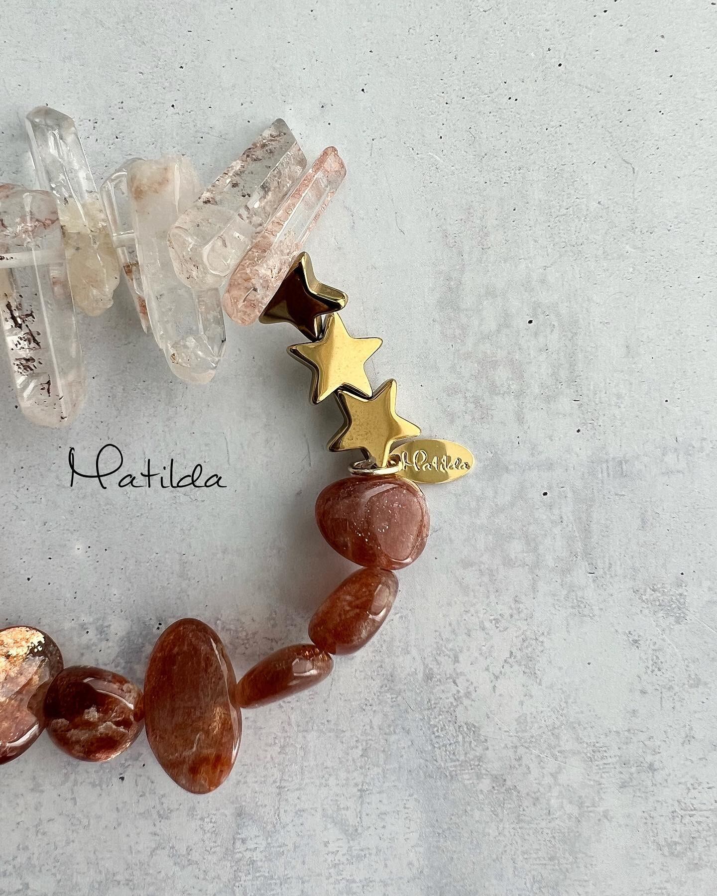 角度によって鬱金色の内包物がドラマティックに煌めく透け感のあるオレンジブラウンのサンストーンと洗練されたモダンアートのような鋭さを感じさせるレッドガーデンクォーツの華やかなペアにゴールドカラーのヘマタイトの星が力強い光を放つ。