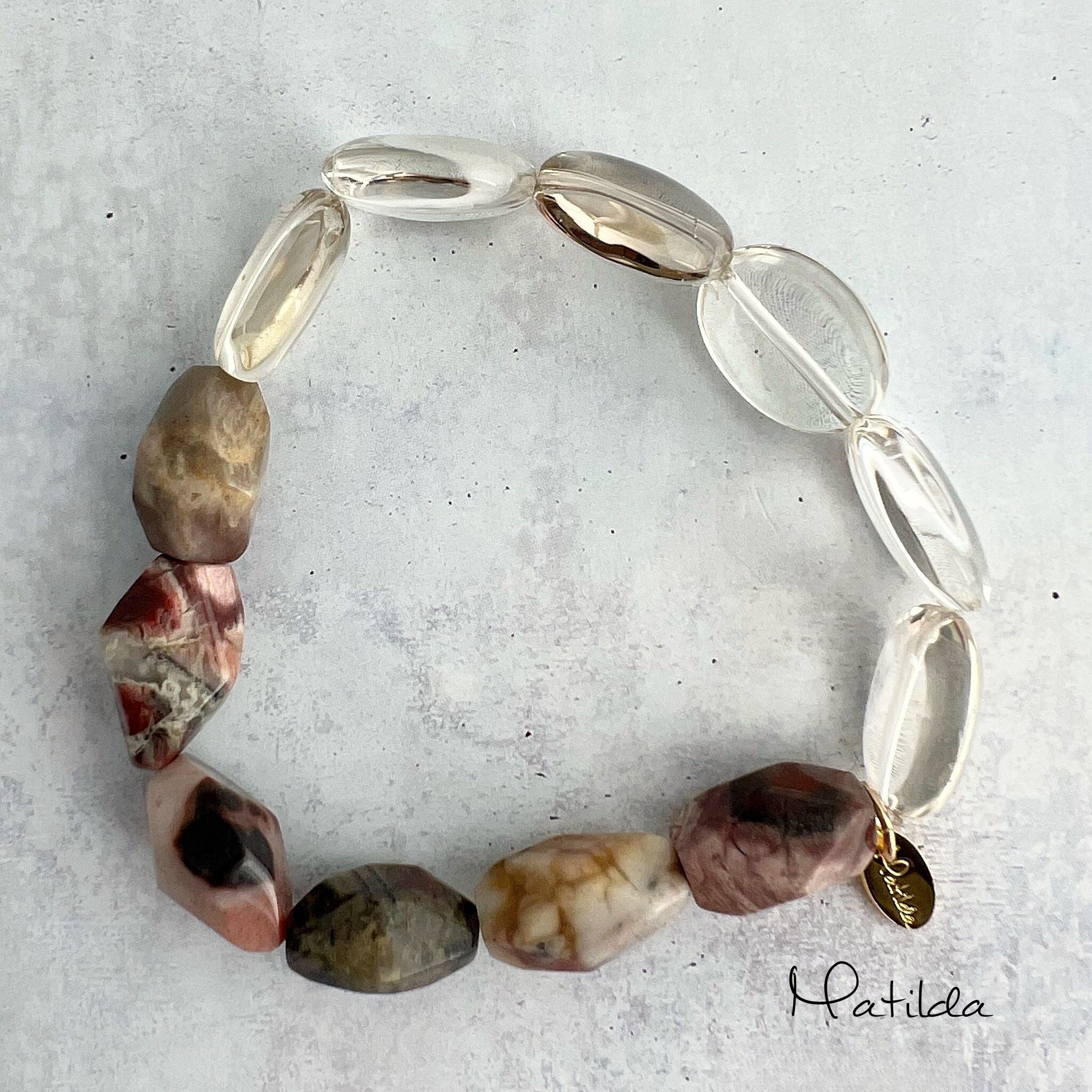 澄みわたるクリアカラーにほんの少しアンバーのニュアンスを加えたスモーキークォーツのオーバルビーズとひと粒ひと粒全く違う石目で個性豊かな表情を見せるジャスパーを合わせて。