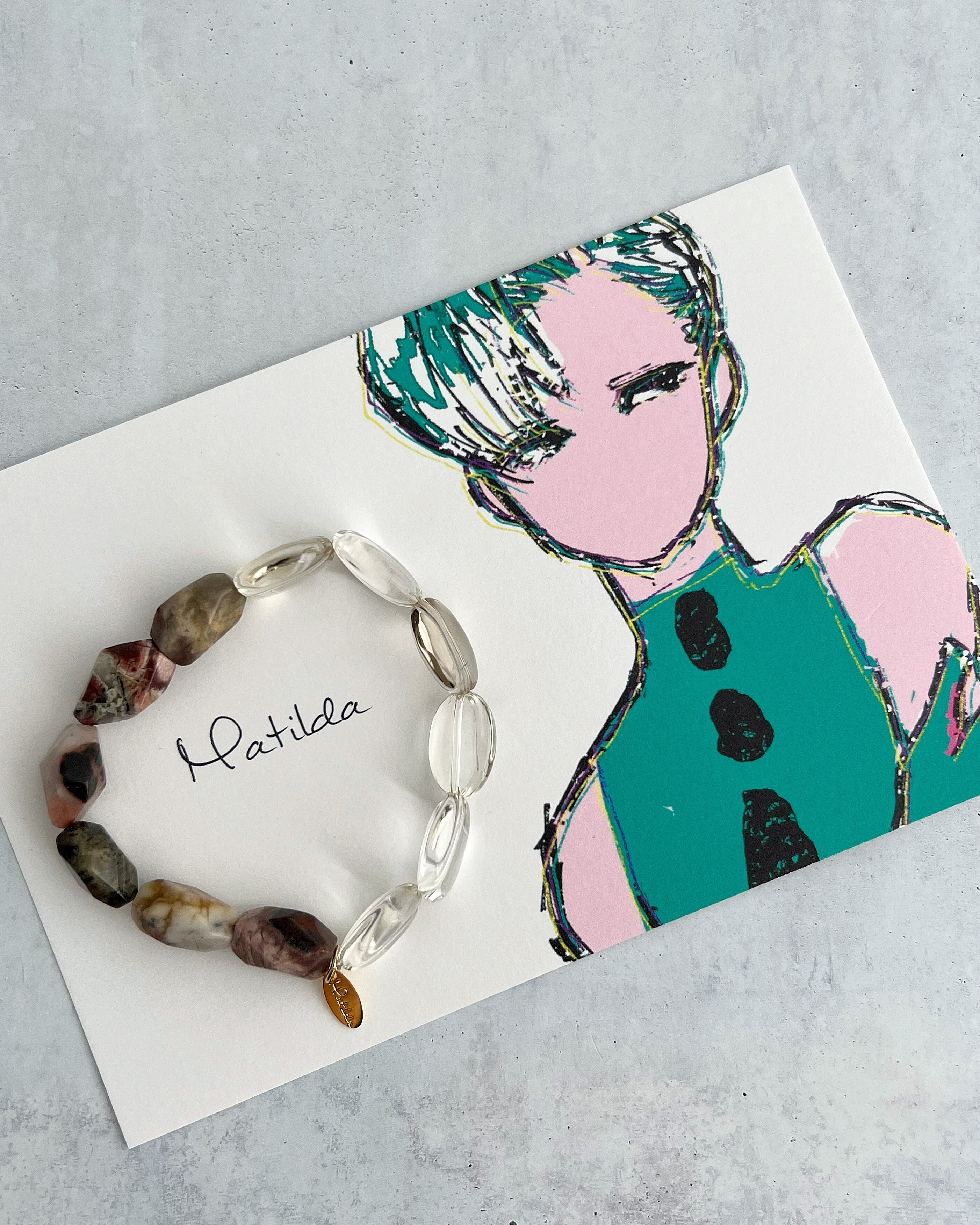 端正な曲線に色気をたたえたオーバルシェイプとラフな多面体カットの組み合わせに、ジャスパーらしい華やかなで印象的な石模様とおさえたアースカラーの抜け感でシックでありながら大人の遊び心を垣間見せるブレスレット。