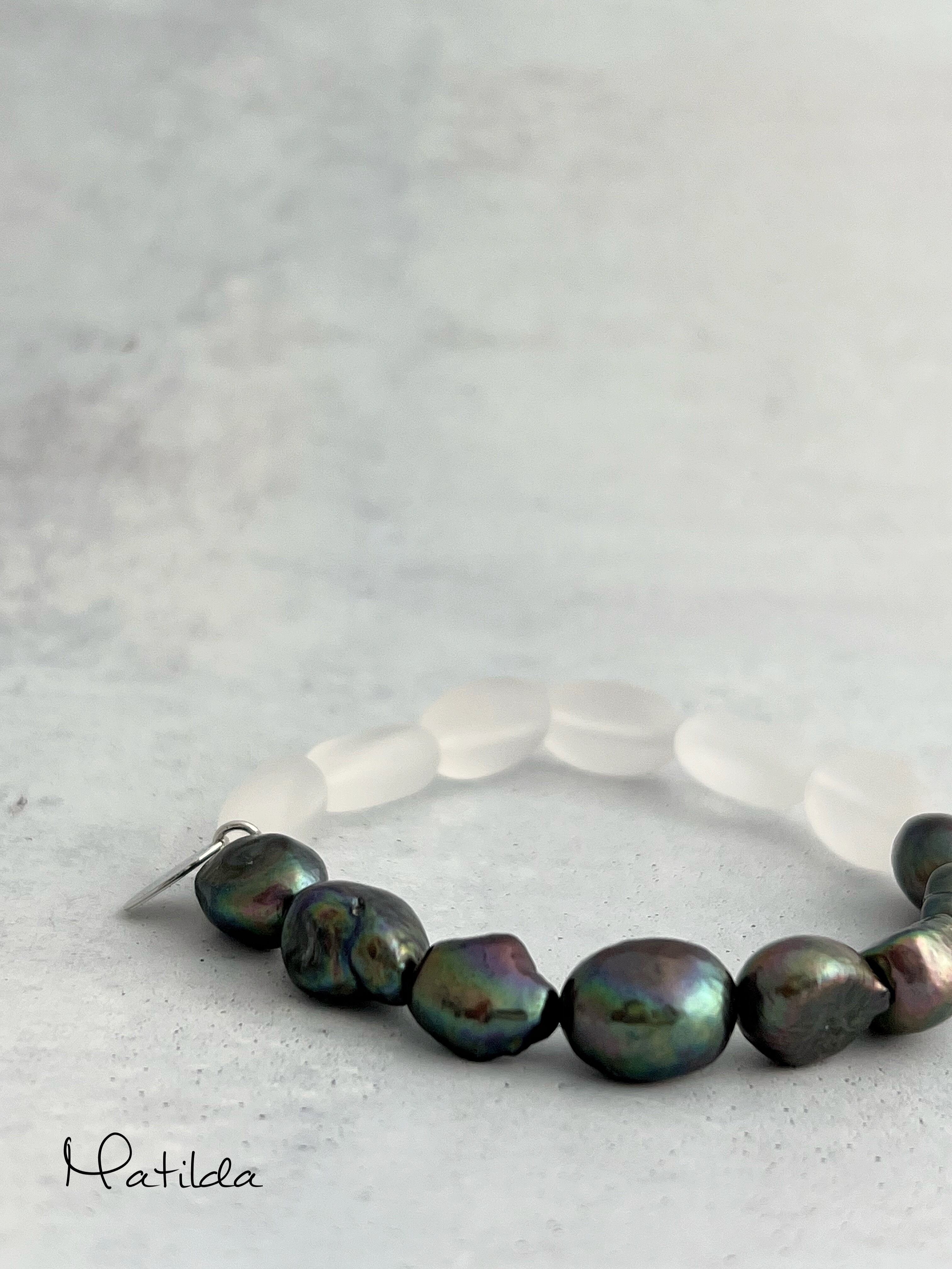 底光りするような虹色の光沢を帯びたメタリックブラックのカラーリングが異彩を放つ大粒のパールと繊細なガラス細工のようなフロスト加工のクォーツを合わせた闇の重厚さと光の浮遊感をあわせ持つペアリング。