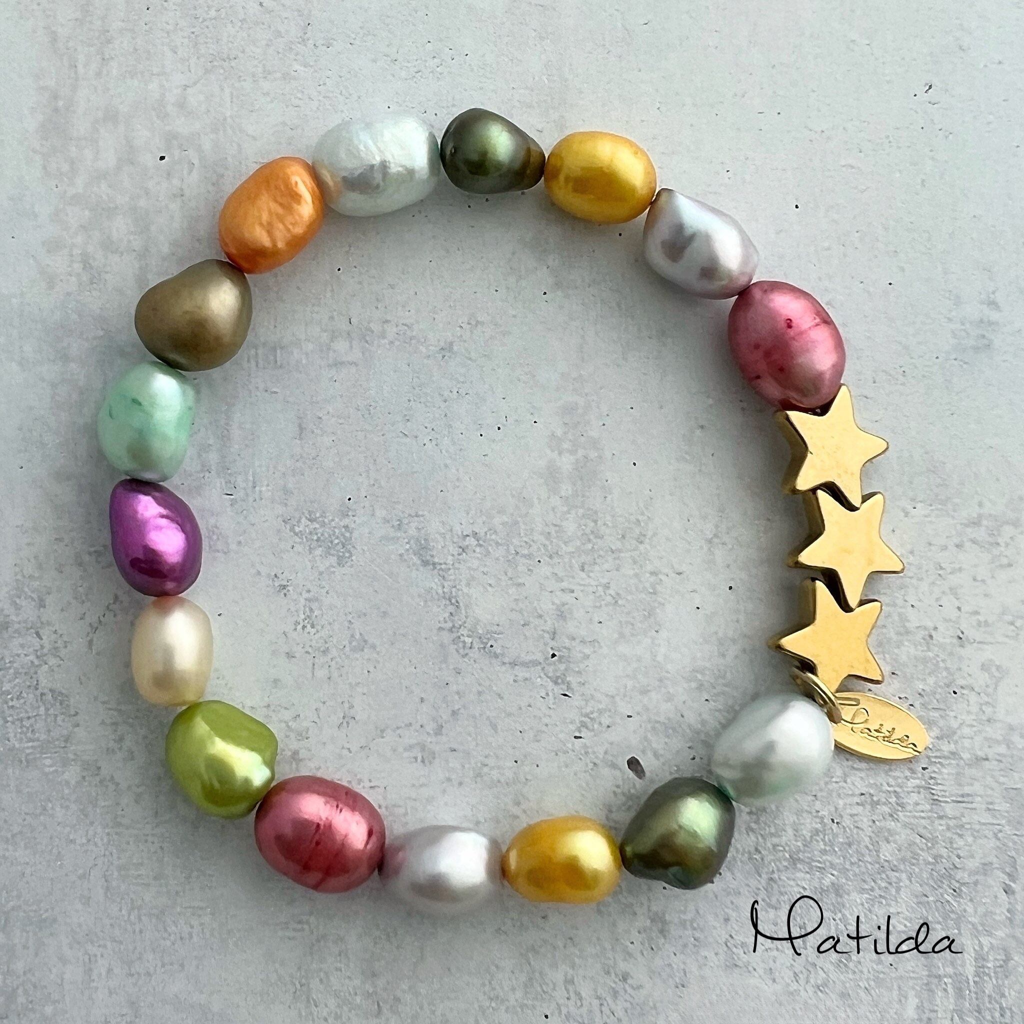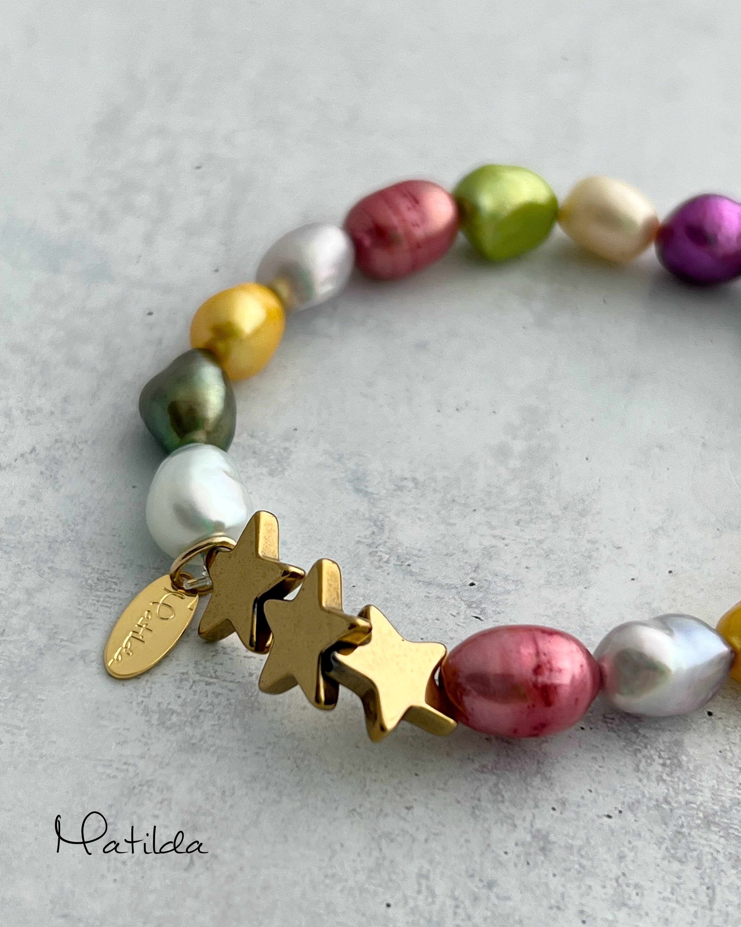 カラフルにさんざめく生意気でコケティッシュな惑星のかけらを集めたようなカラーリングパールにゴールドのヘマタイトの流れ星が悪戯にスパークする一本。