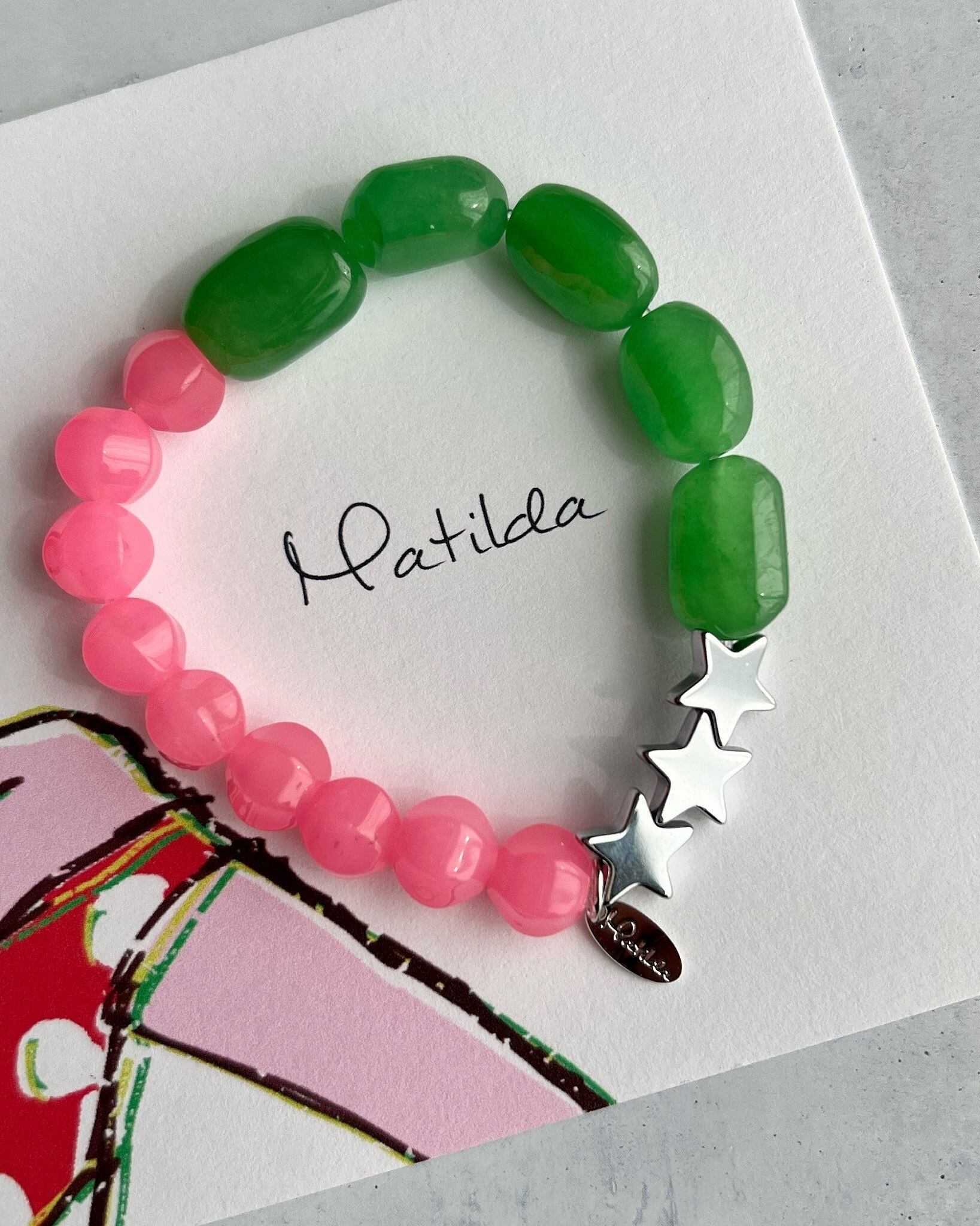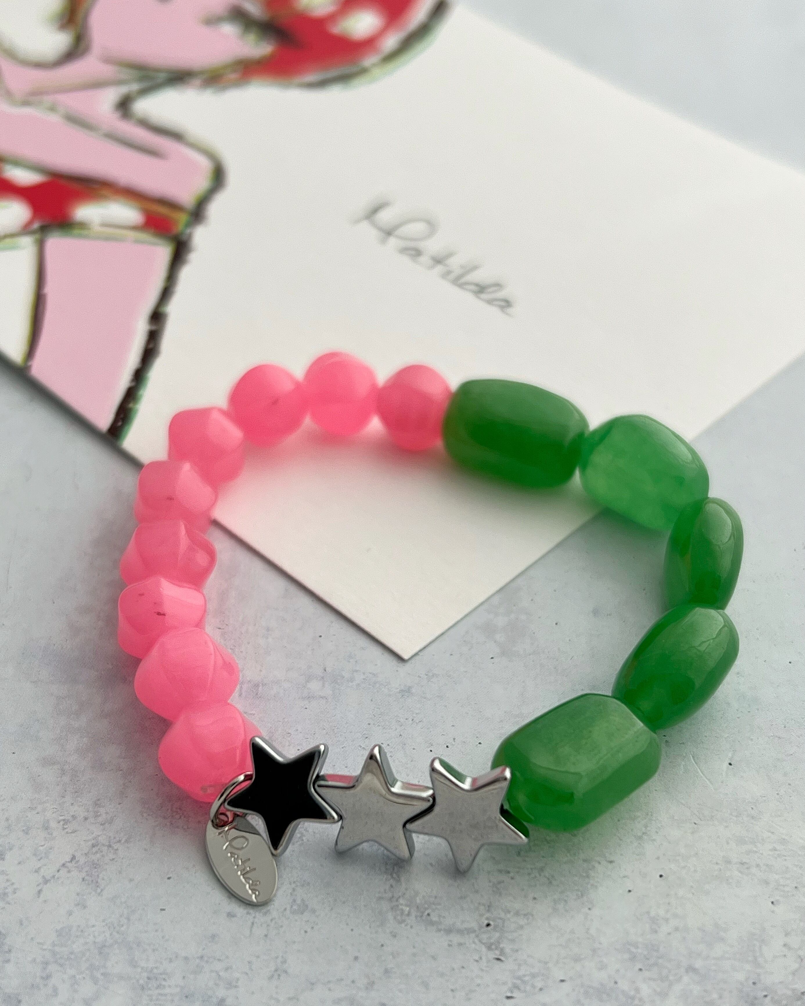 キュートなグァバピンクとビビットなラッキーグリーンのジェイドのペアは、ステージを跳ね回り輝きを放つポップアイコンのように自由で生意気なエールをパワフルに放ち、3粒のヘマタイトスターのシルバーはクールなスパイスとなって奔放にきらめく。