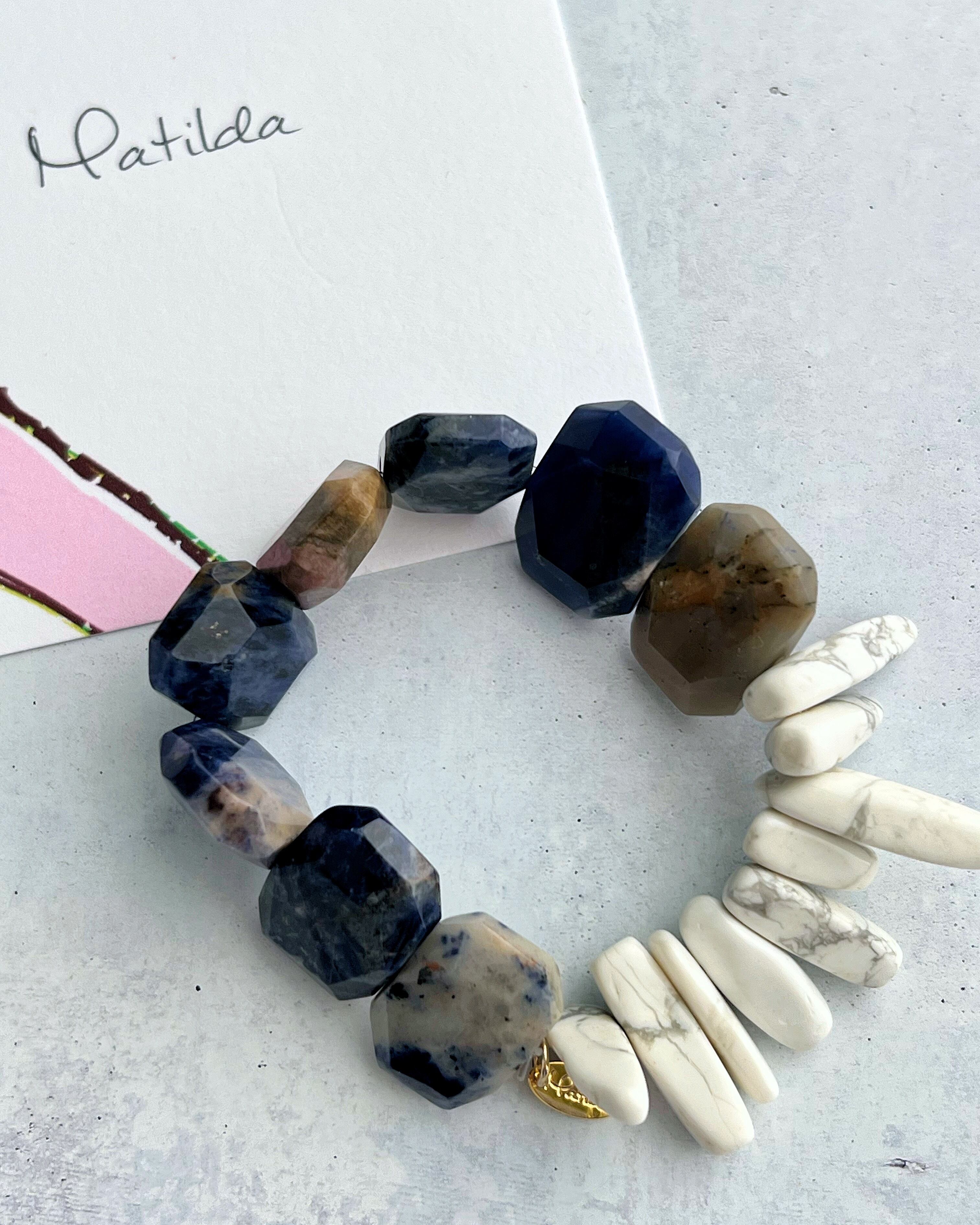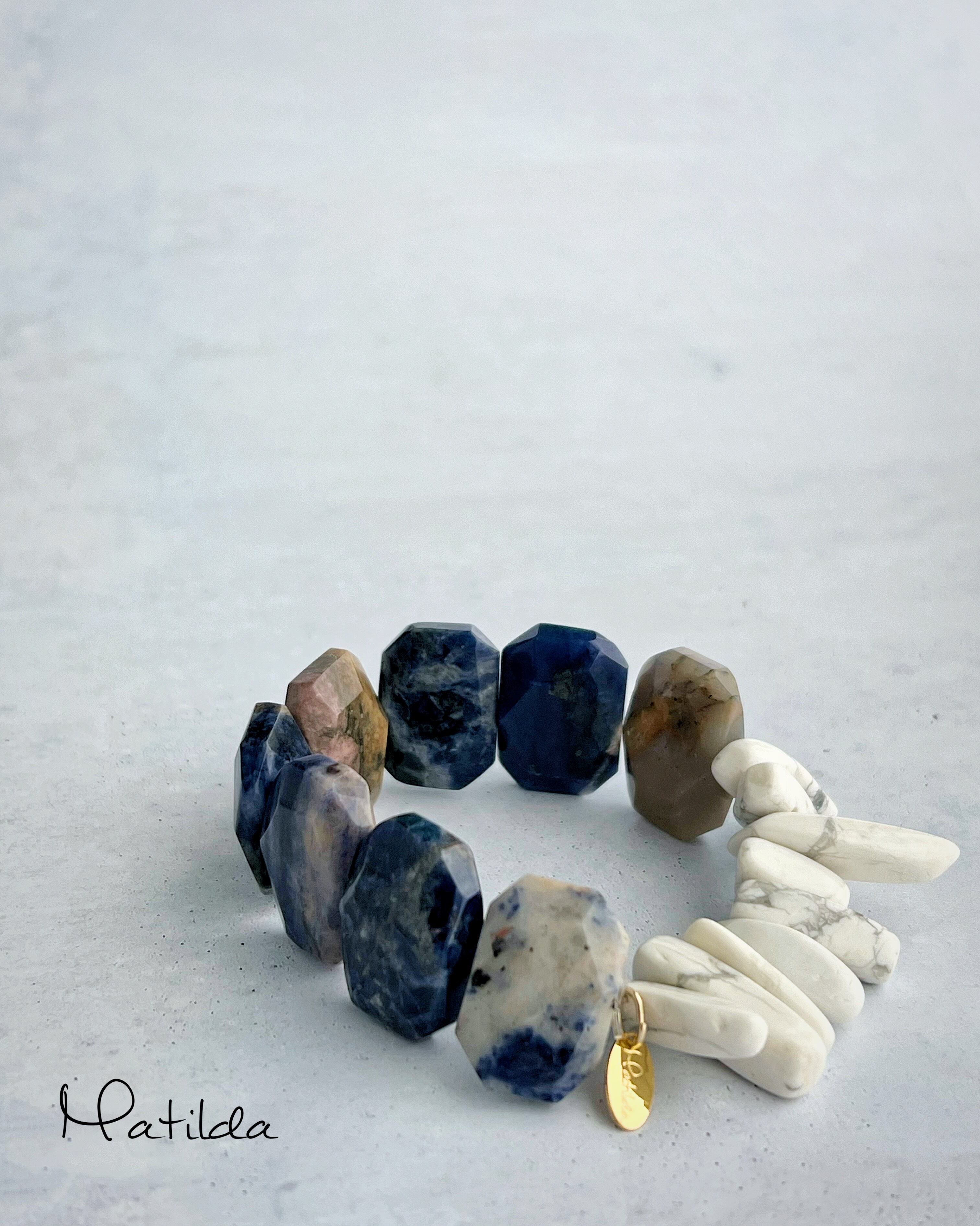 ネイビーやコバルトブルーを含んだ深いグラデーションとアーシィなブラウンに繊細で複雑な石目が映える宗教画のように神秘的で静謐な佇まいのゼオライトインソーダライトのタブレットを、跳ね回るようにビビットなマットホワイトのハウライトチップがエレガントにステップを踏んで。