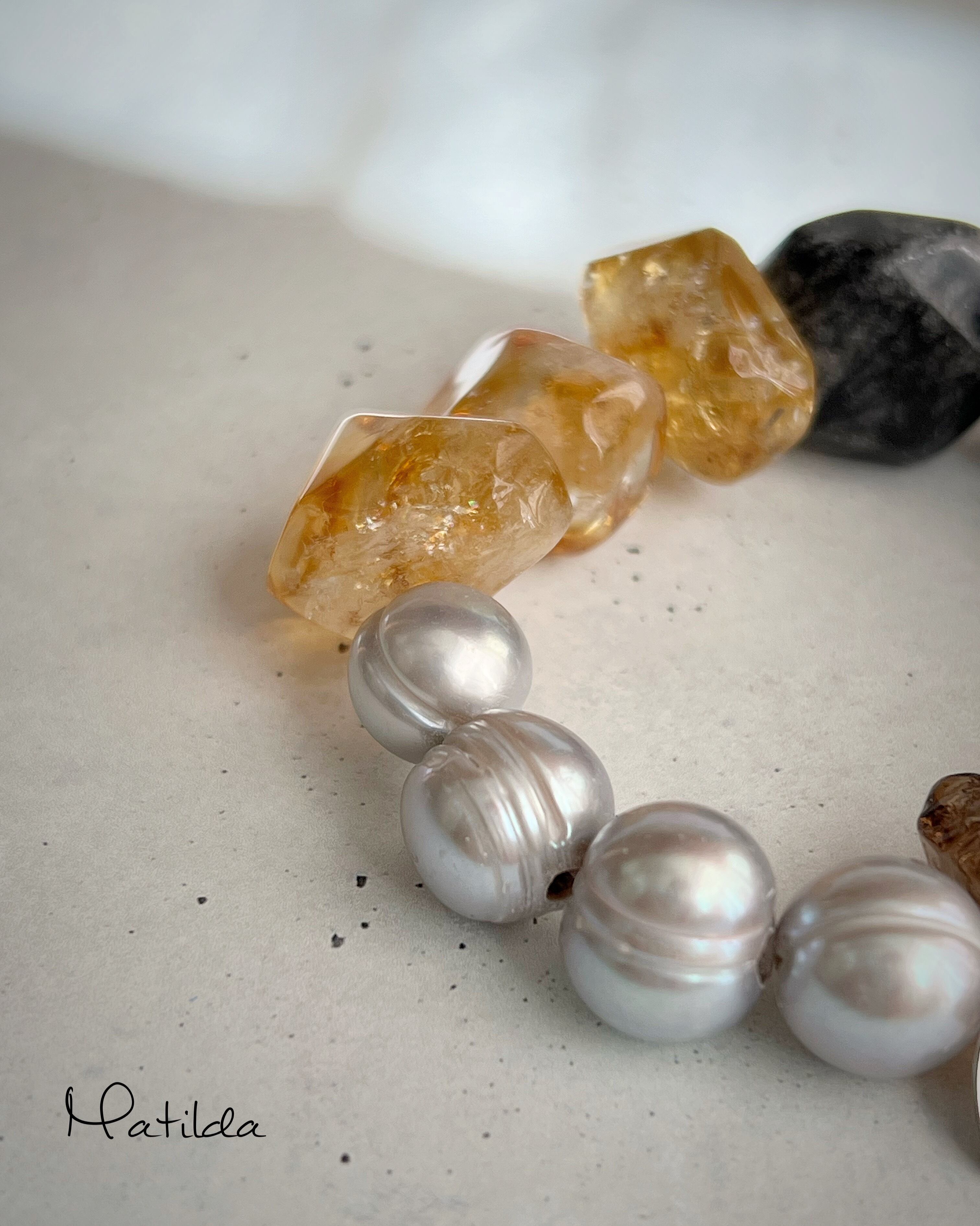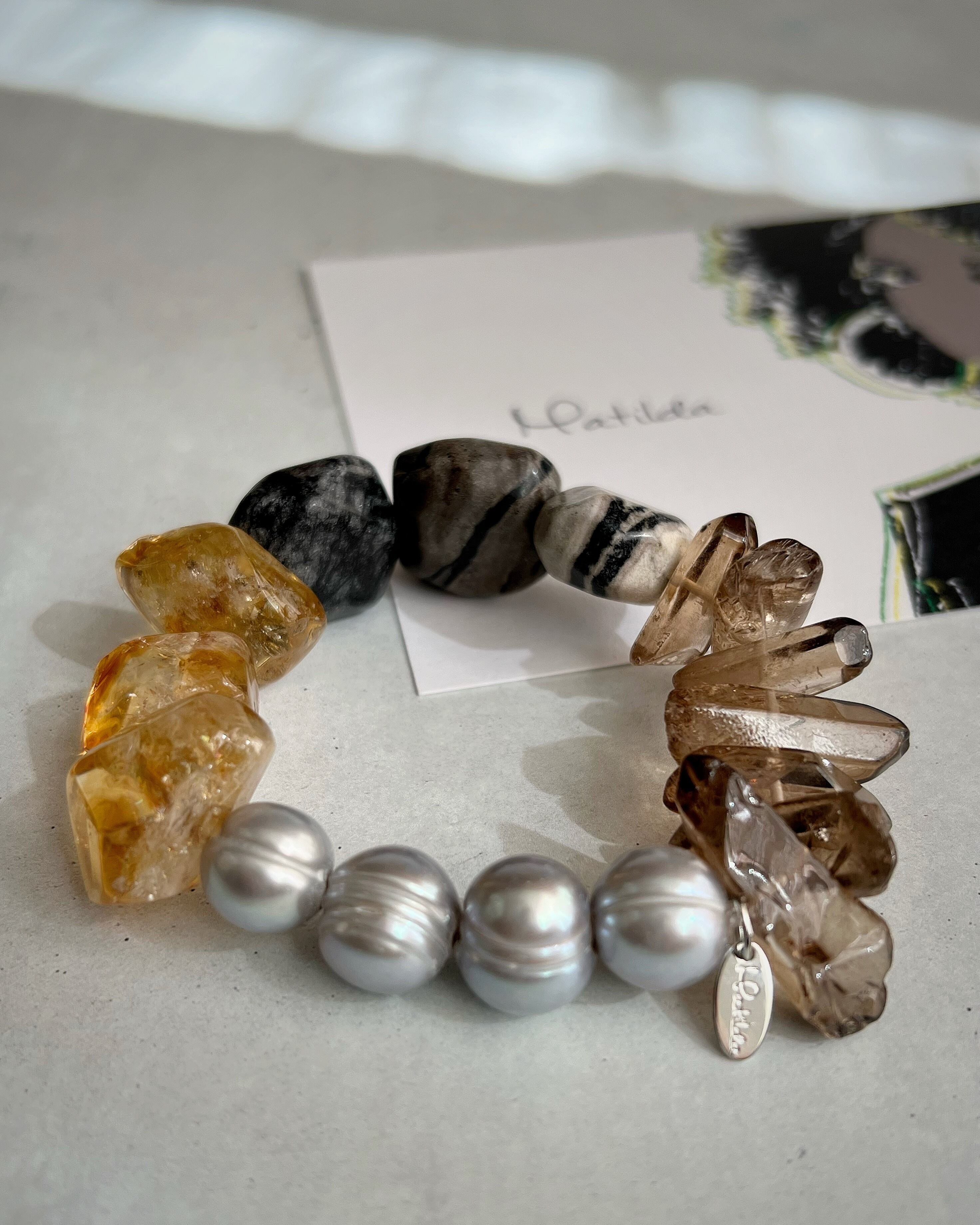 クリアなオレンジブラウンのシトリンと柔らかなブラックストライプのゼブラジャスパーを合わせたセンチメンタルなペアに、スモーキークォーツとシルバーパールのテクスチャーがアクセントを添えて。シックなアースカラーがモードな一本。
