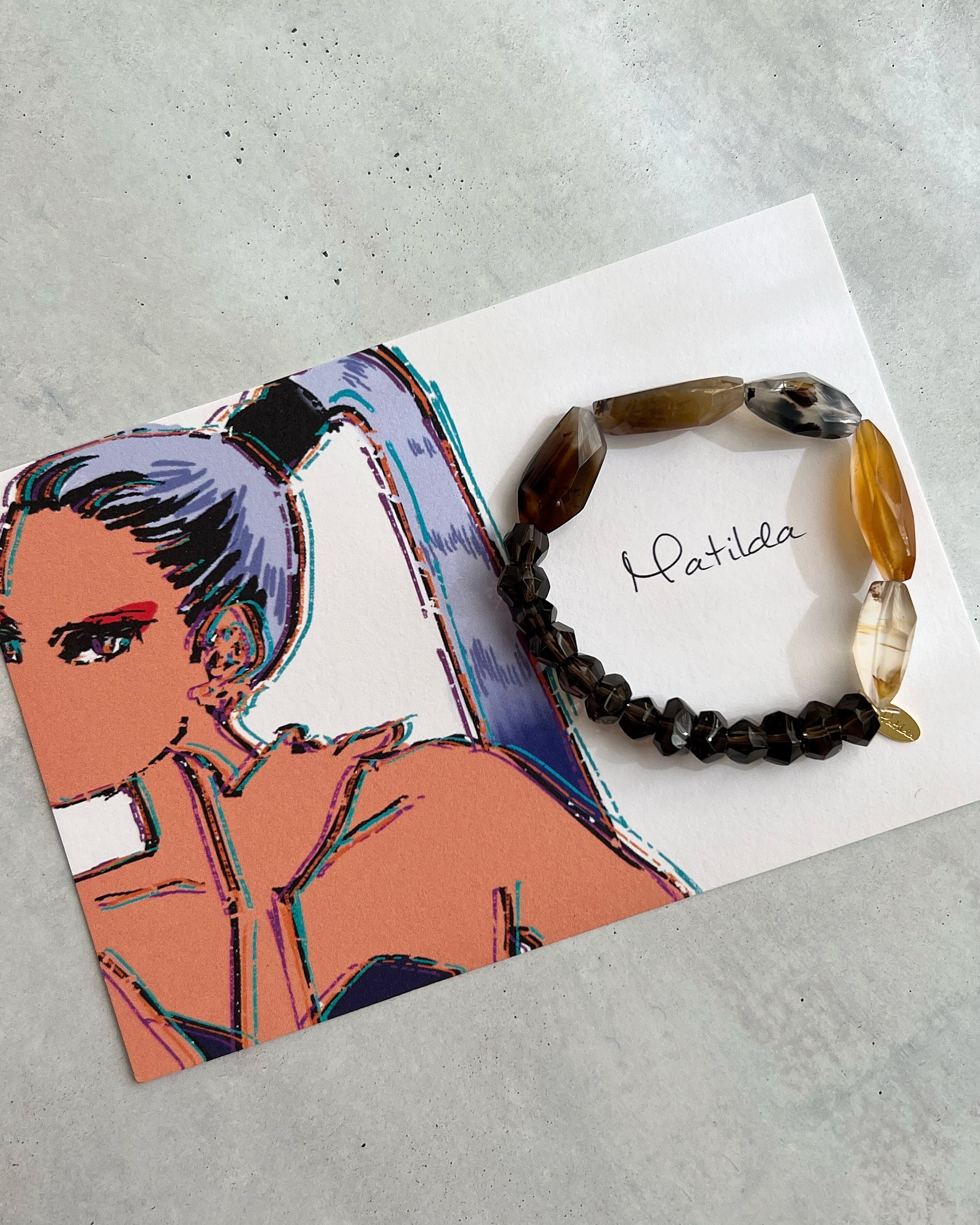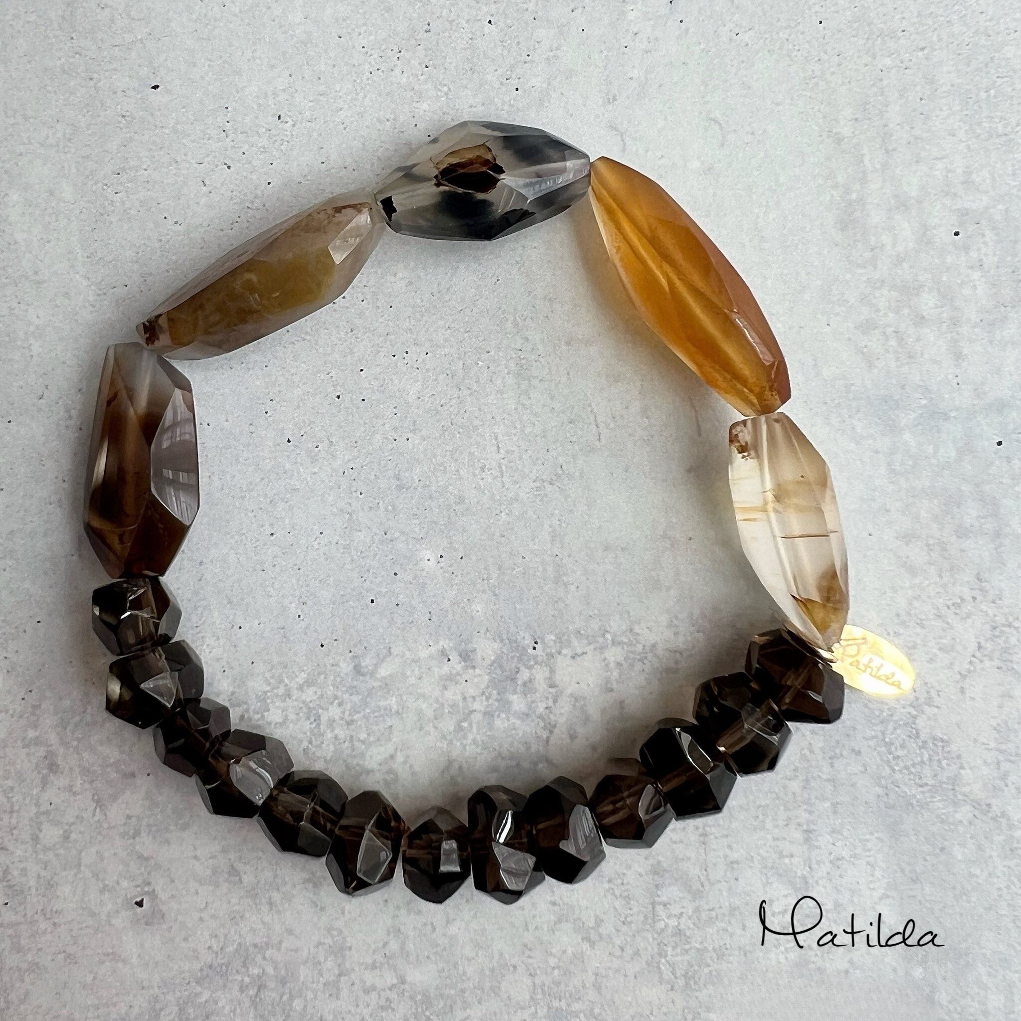 透け感のあるディープブラウンがアンニュイなスモーキークォーツと、ブラウンからアンバー、クリアカラーまでのグラデーションが美しいモンタナモスアゲートをペアリング。隠したはずの情熱が、熾火のように目を覚ます一本。