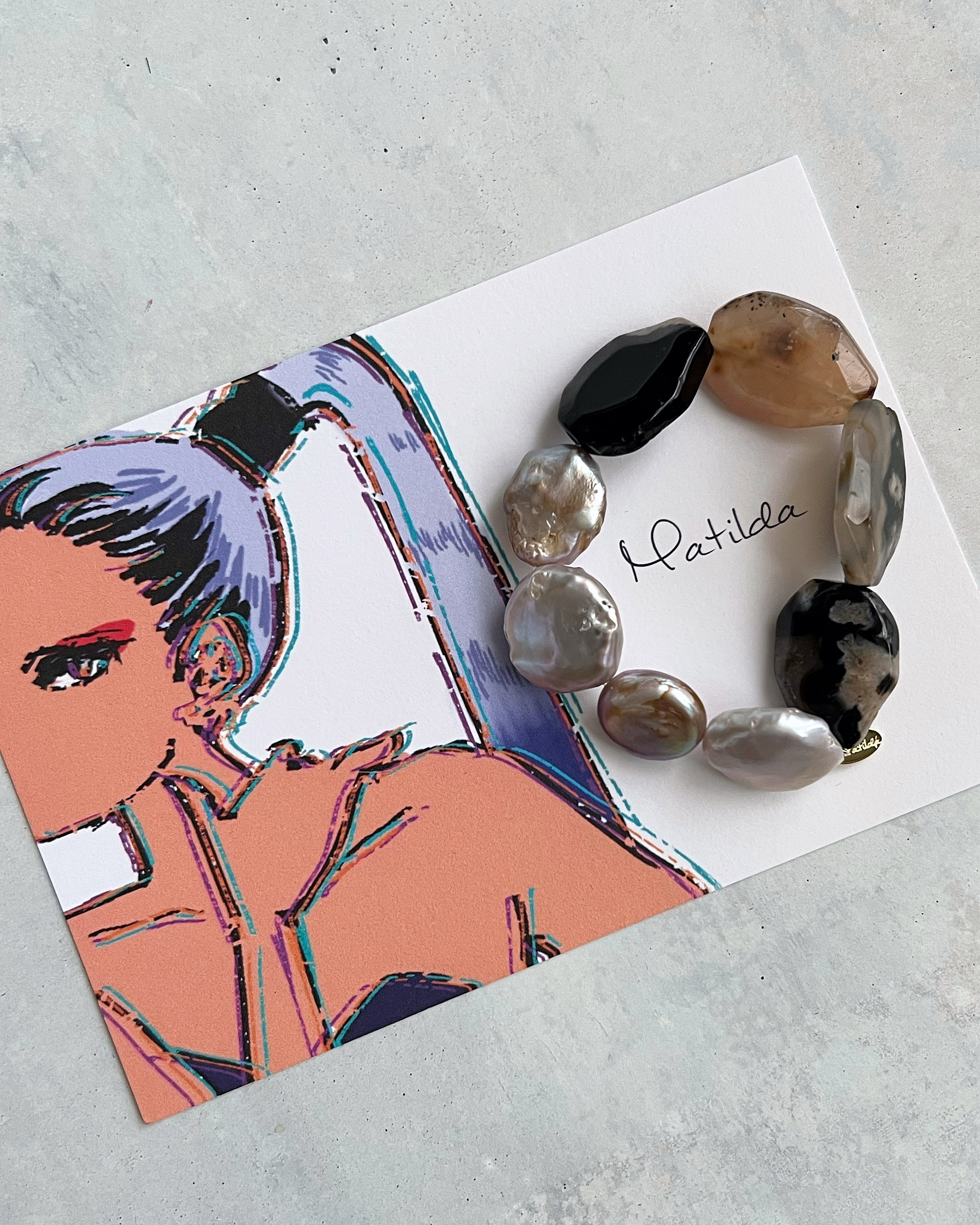 水面に落ちた花びらのような模様がさんざめくチェリーブロッサムアゲートに、艶やかな虹が揺らめく淡水パールを合わせて、エレガンスと深い色気を纏う一本。
