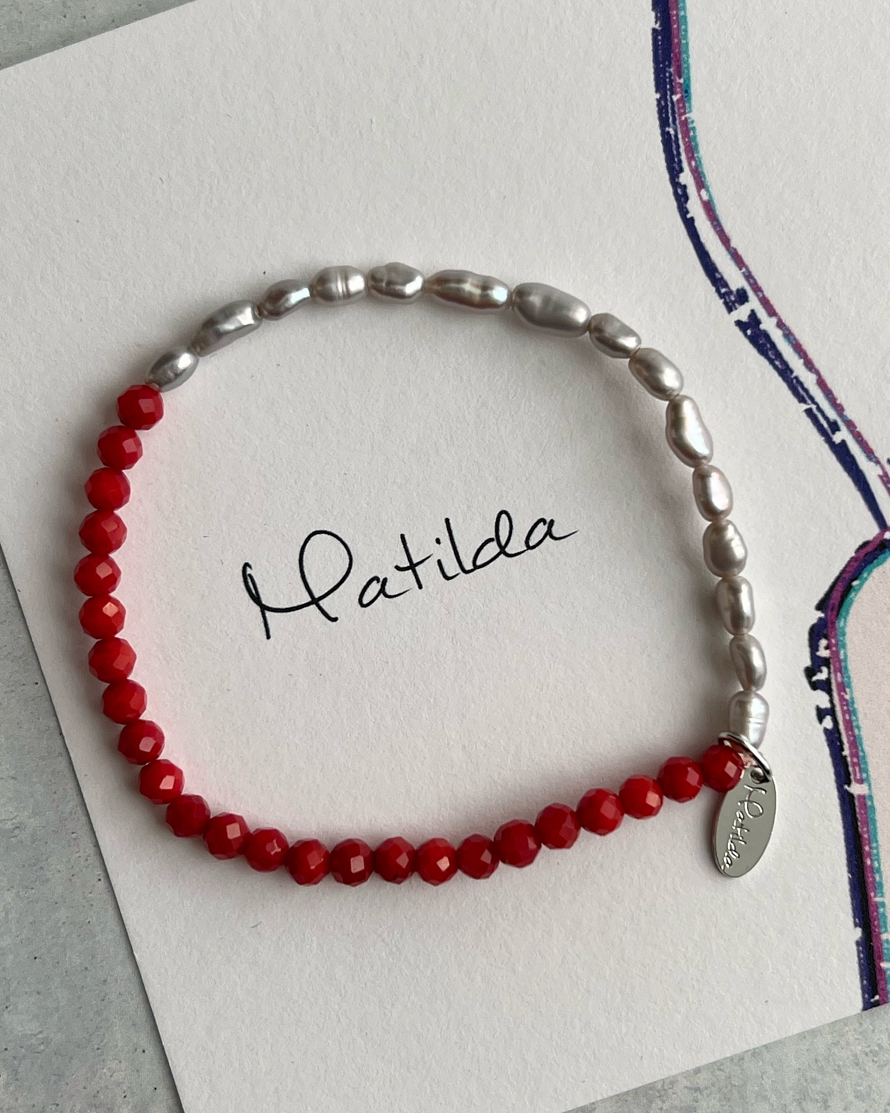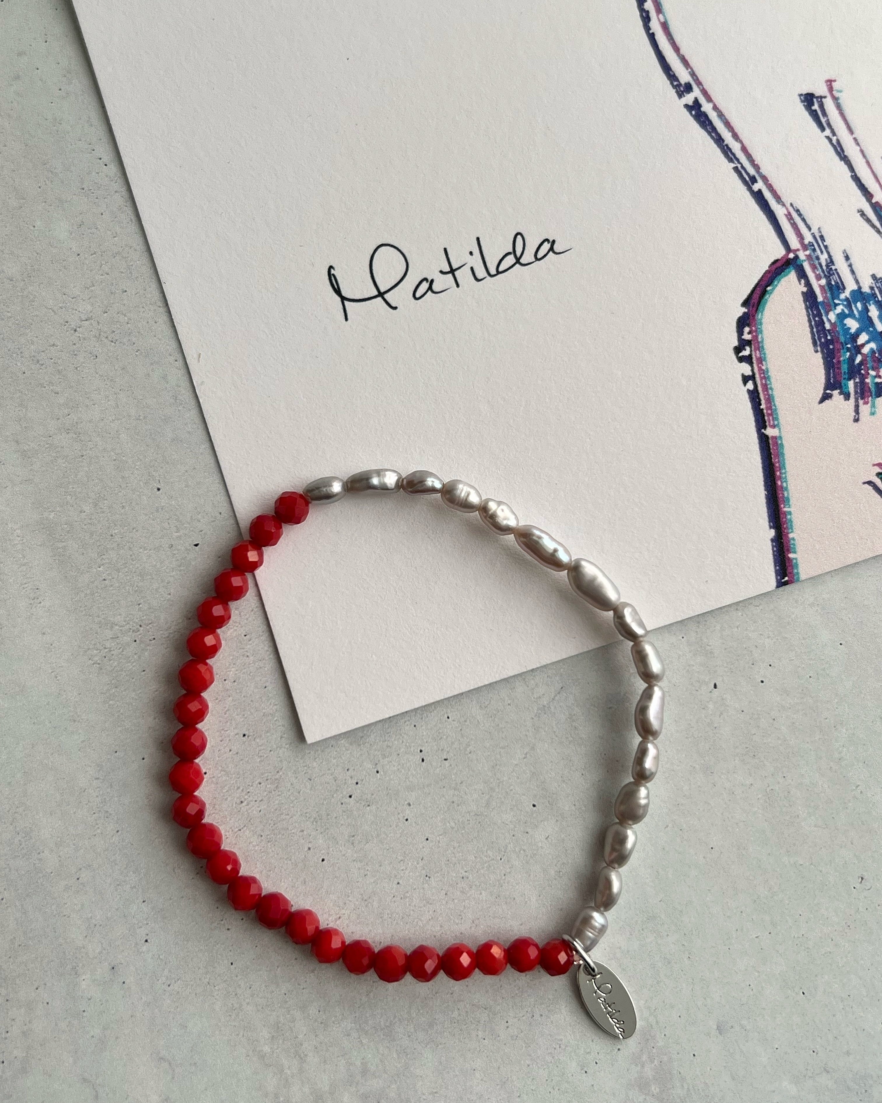 色鮮やかなレッドが存在感を放つコーラルにシルバーカラーがシックな淡水パールを合わせて。