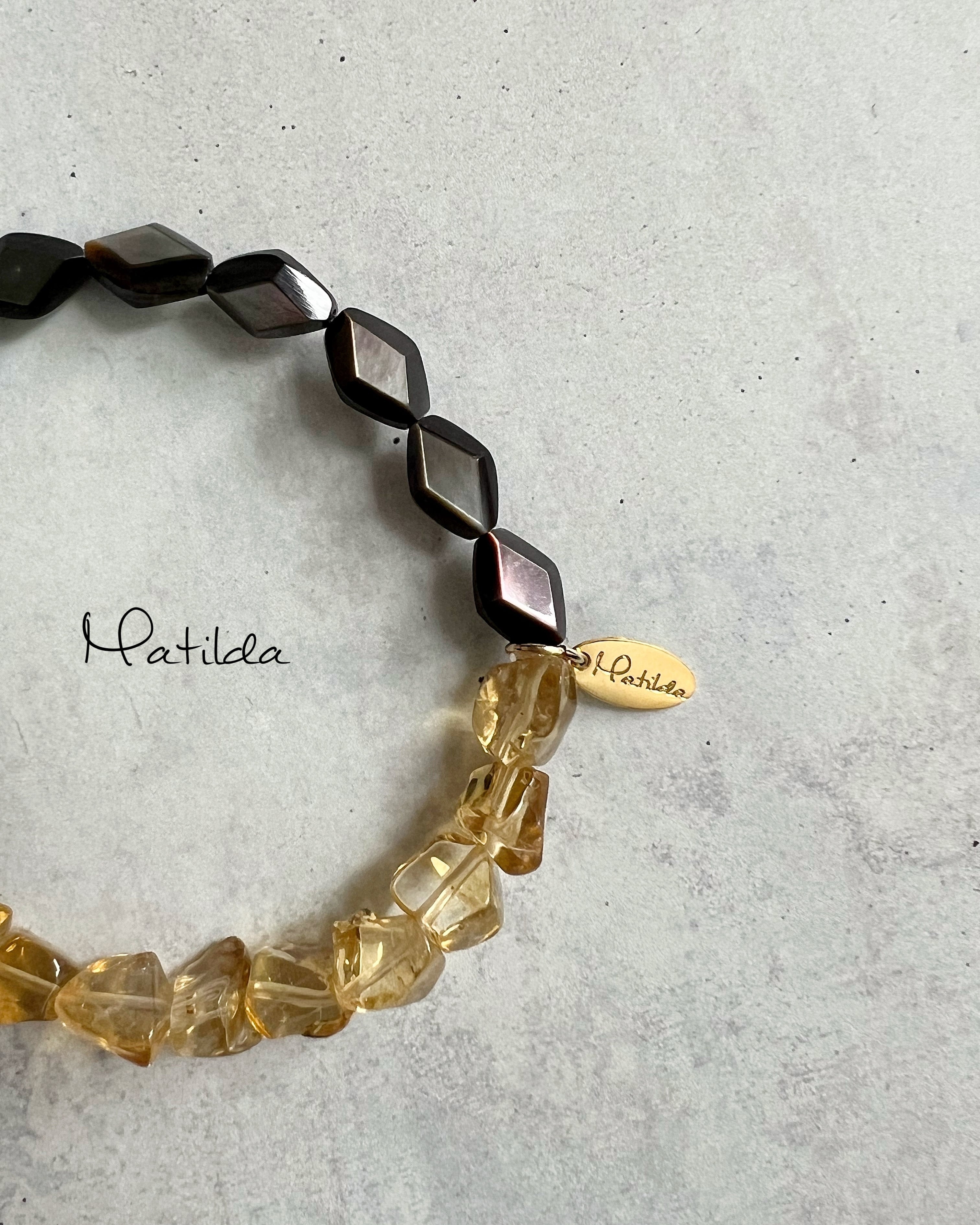 とろけるような輪郭とキャンディのようなハニーイエローが愛らしいシトリンに、深い黒を纏い上等なショコラのような艶を纏ったシェルを合わせて。甘くてほろ苦い大人のスイーツブレスレット。