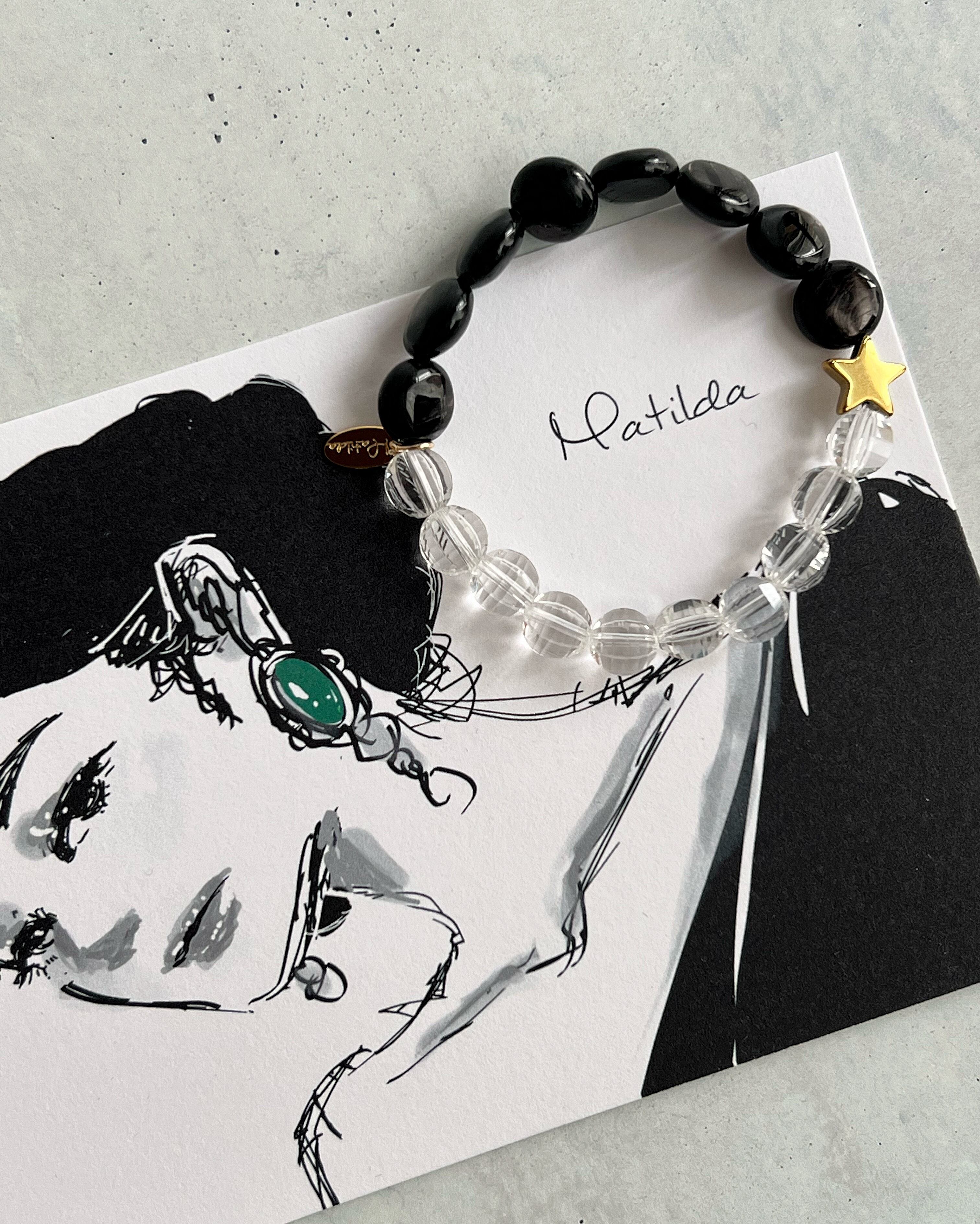無垢なきらめきが気高く華やかなクォーツに、白銀の輝きを秘めた濡羽色のハイパーシーンを合わせて。異なるマテリアルでさまざまな光をとらえるブレスレット。