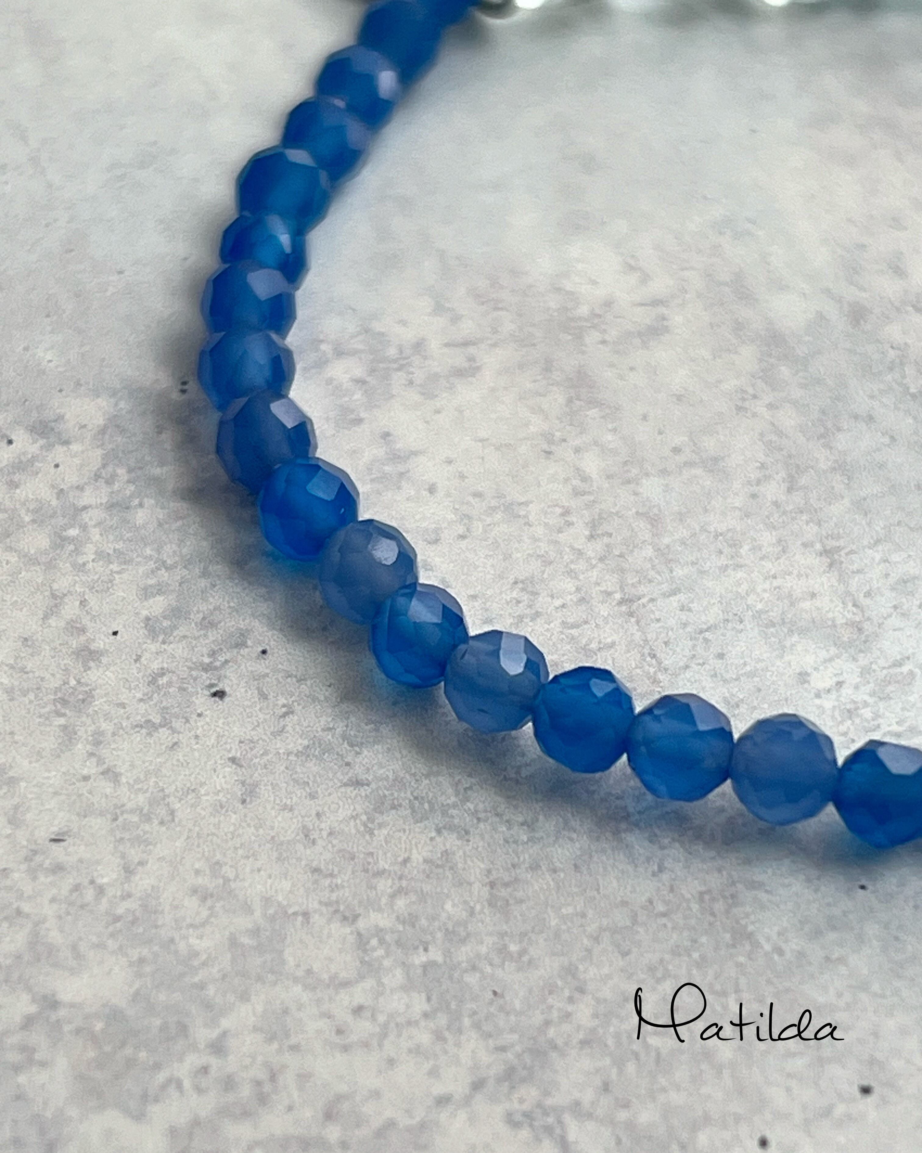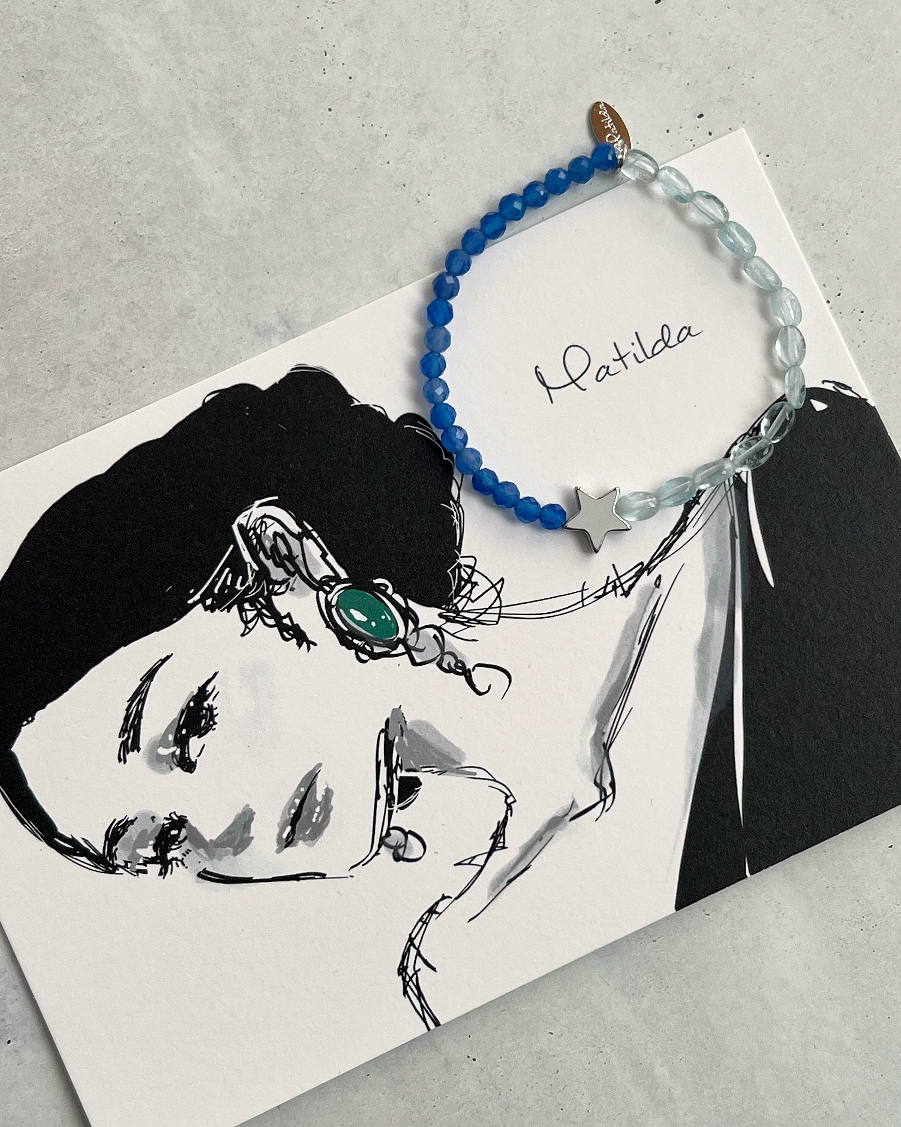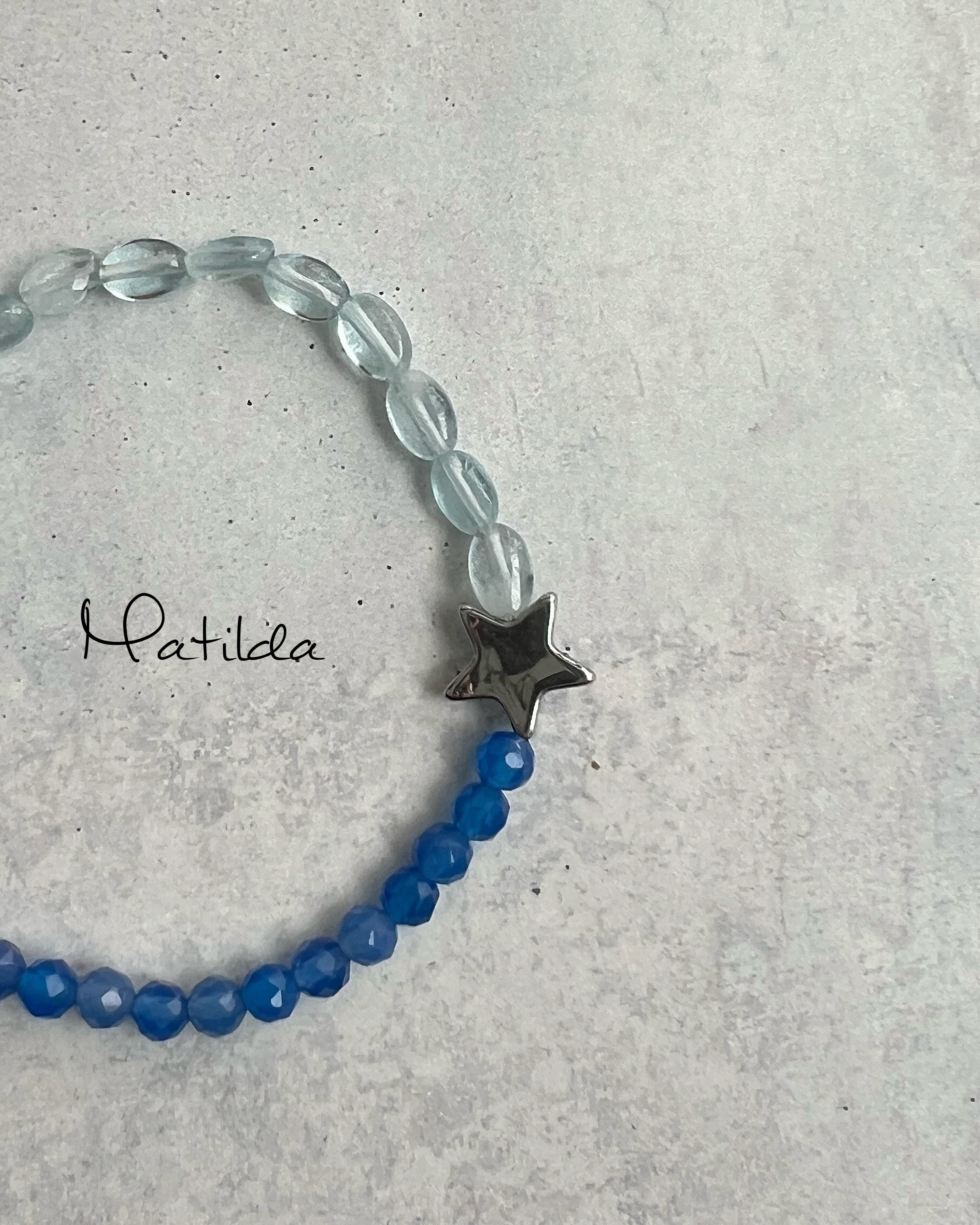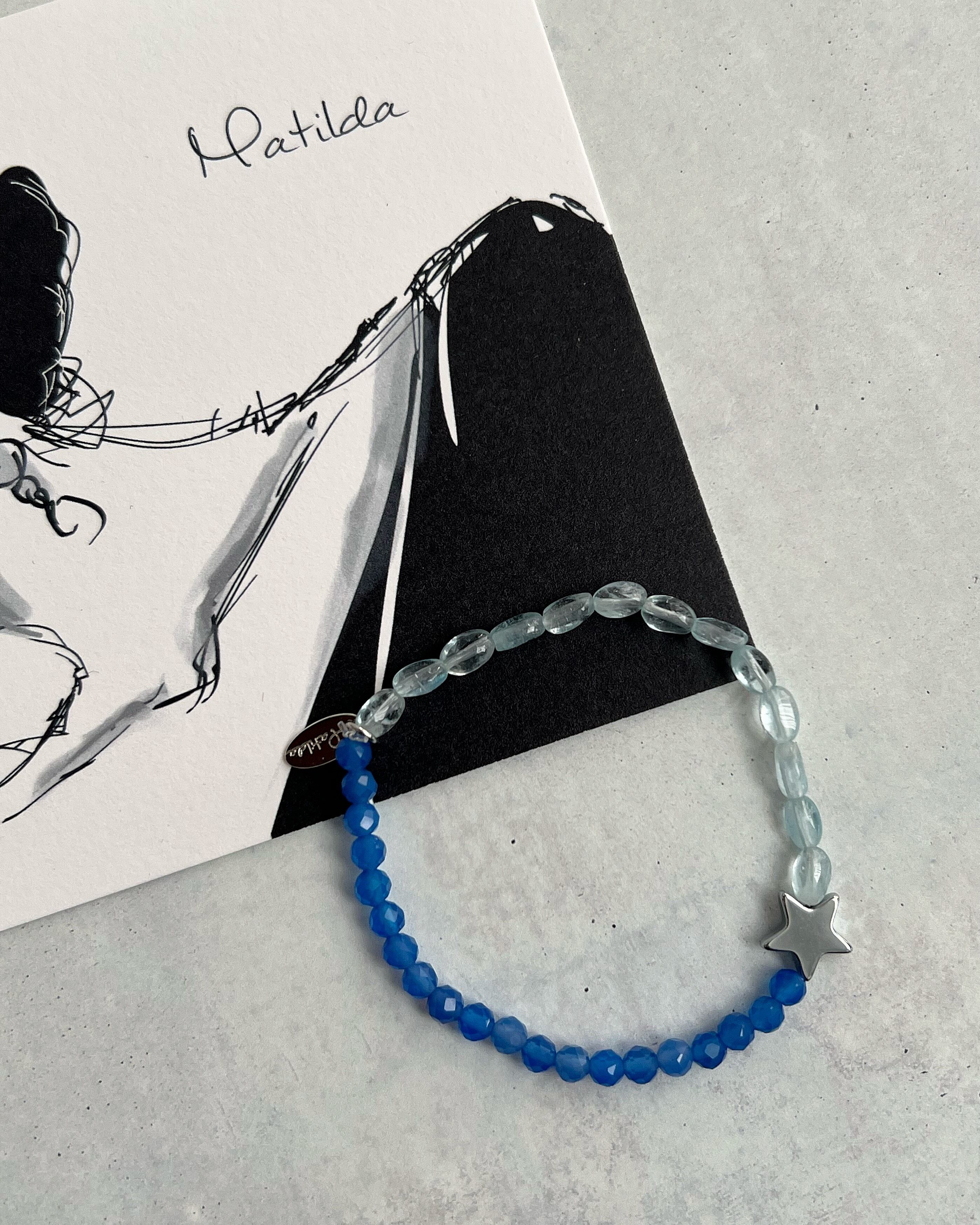 清水の水滴のように透き通るアクアマリンのアイスブルーとジェイドの鮮やかなコバルトブルーのペアリングにヘマタイトのシルバースターが一粒光る。