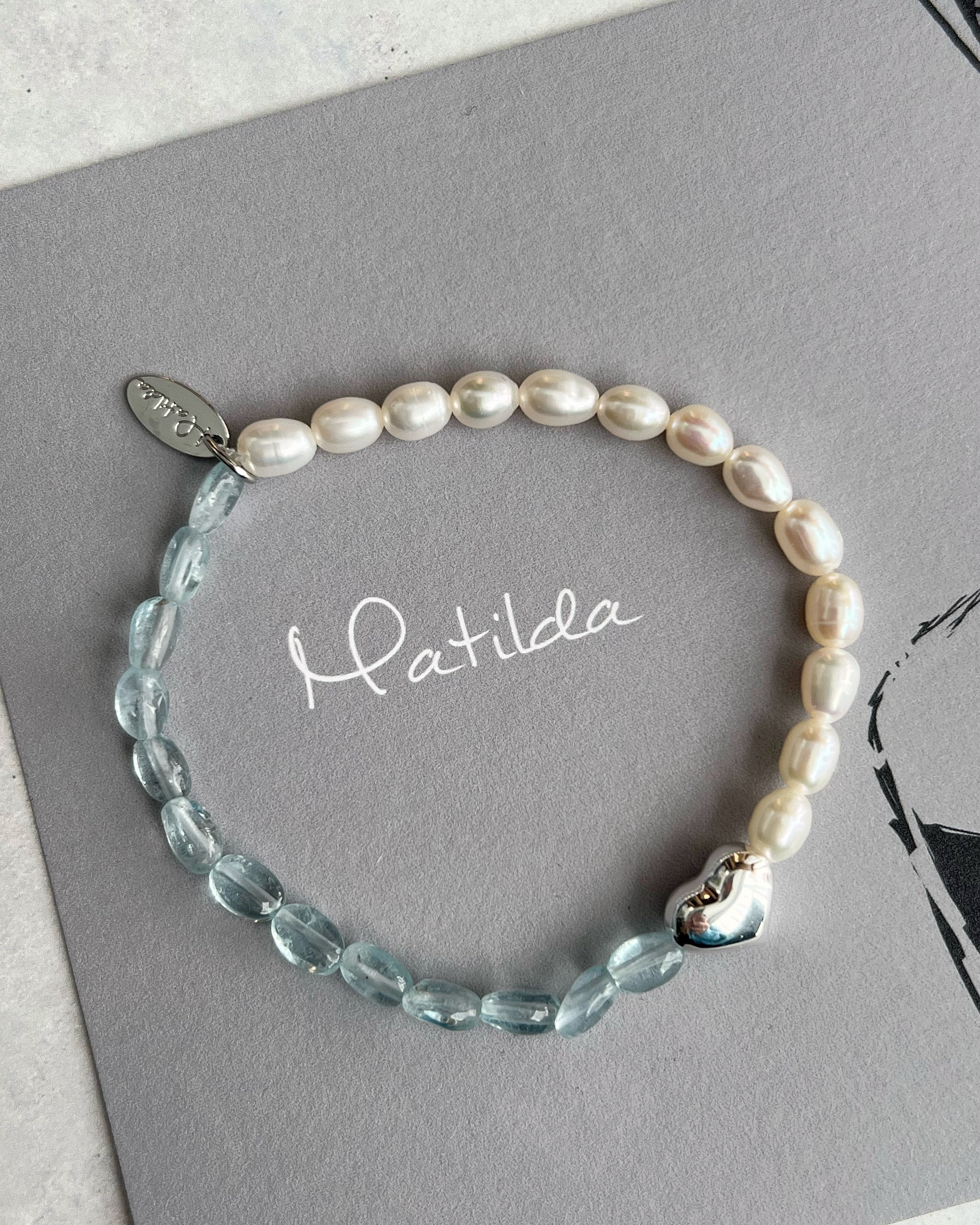 ミントキャンディのようなアクアマリンと淡水パールの涼しげなペアリングに、ぽってりとしたシェイプが愛らしいシルバービーズのハートをひとつぶ。