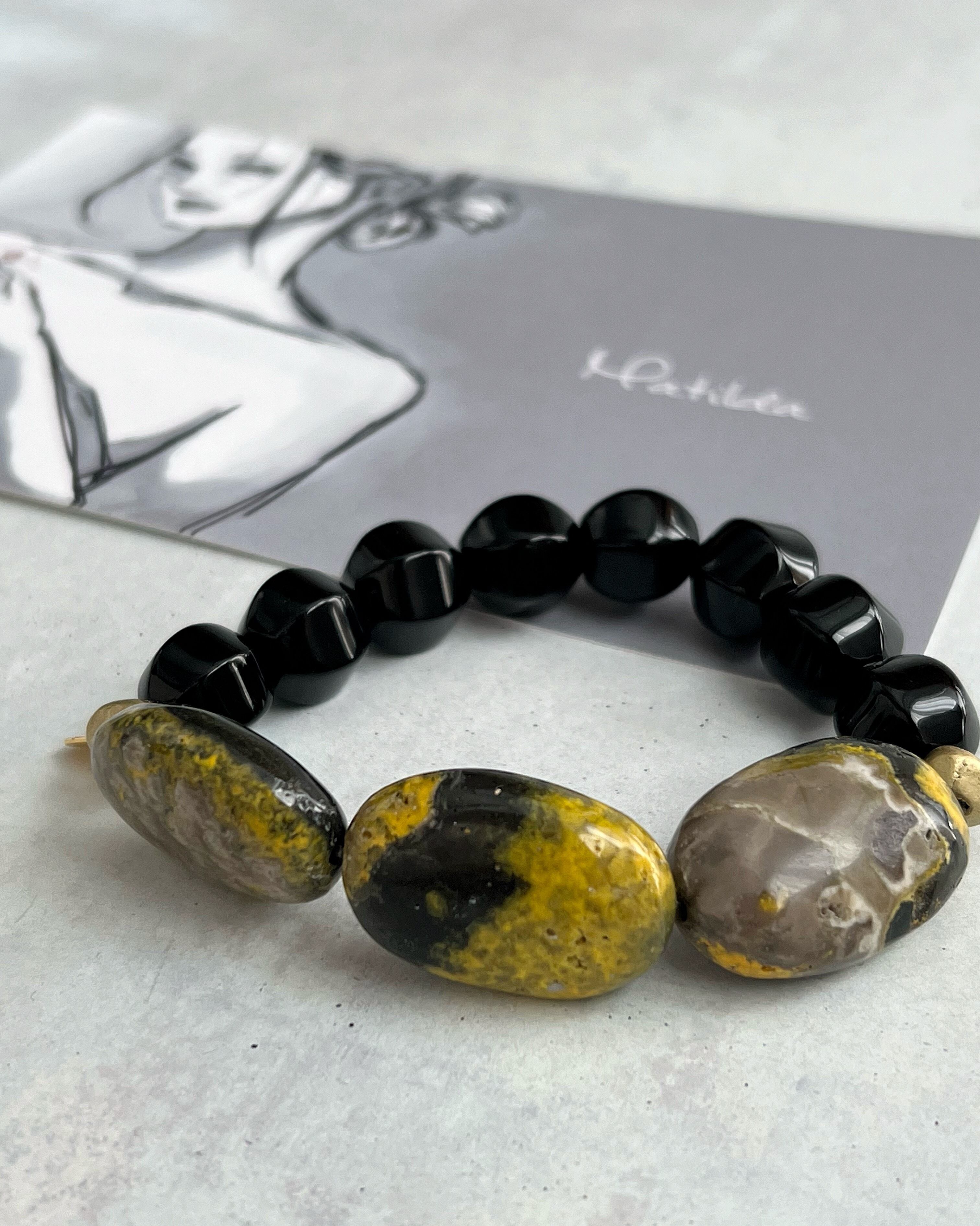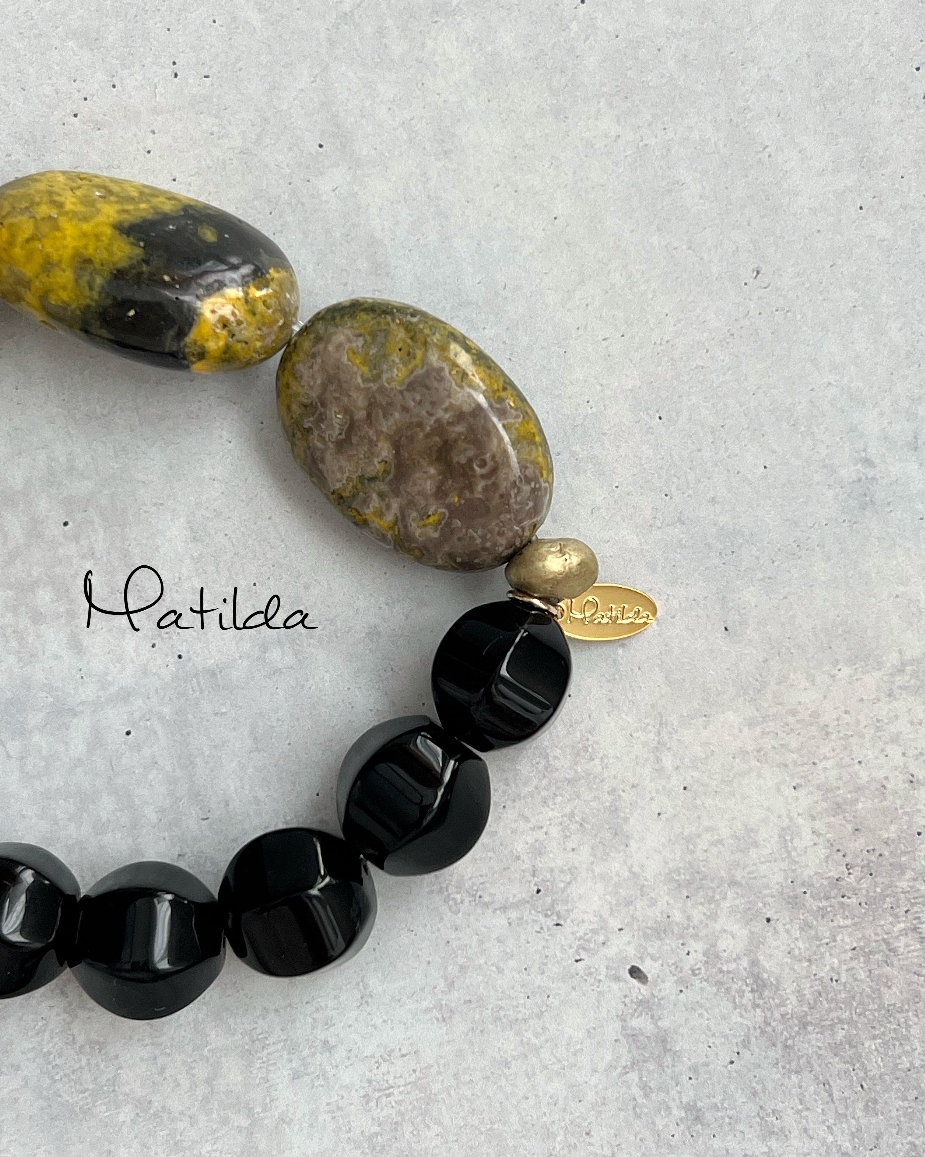 目の醒めるようなイエローとブラックが混ざり合う個性的なバンブルビージャスパーと、曲線を活かしたカッティングがクールなオニキスのペアリングをツヤを抑えた真鍮ビーズがバランスよくつなぐ、大胆不適でモード全開な一本。
