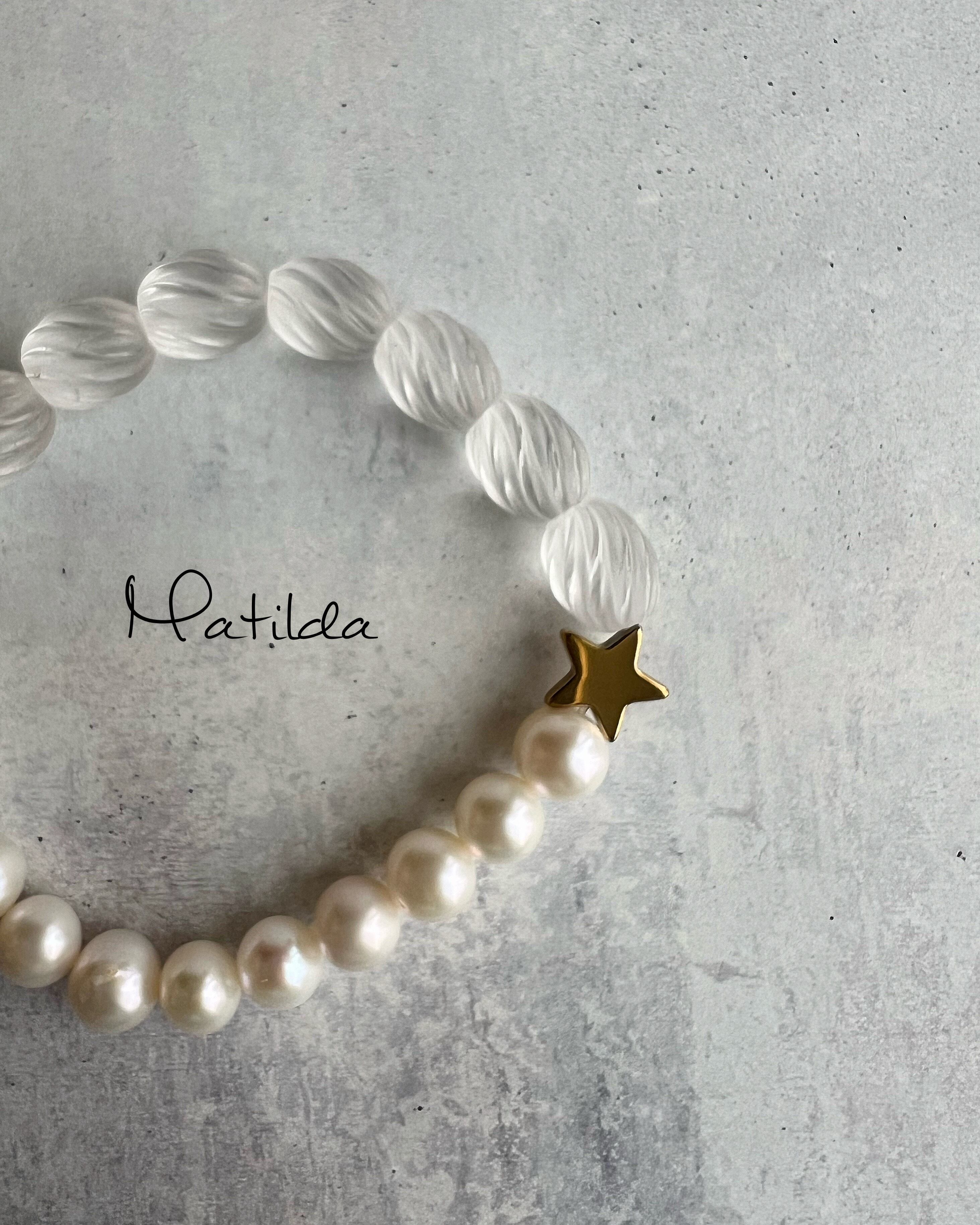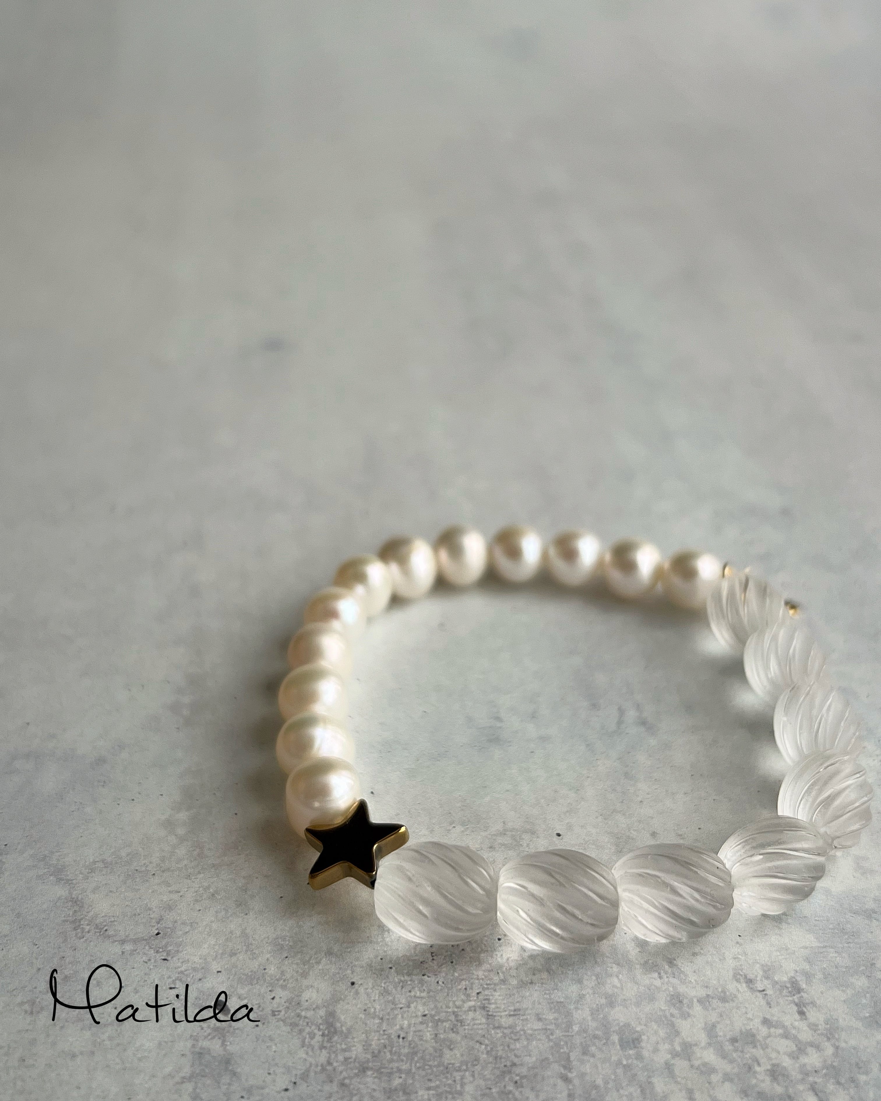 流線のカッティングがエレガントなクォーツとレディなパールのクラシカルなペアリングに、ヘマタイトのゴールドスターがひとつぶきらめく。シックでロマンティックなムードに、心華やぐ一本。