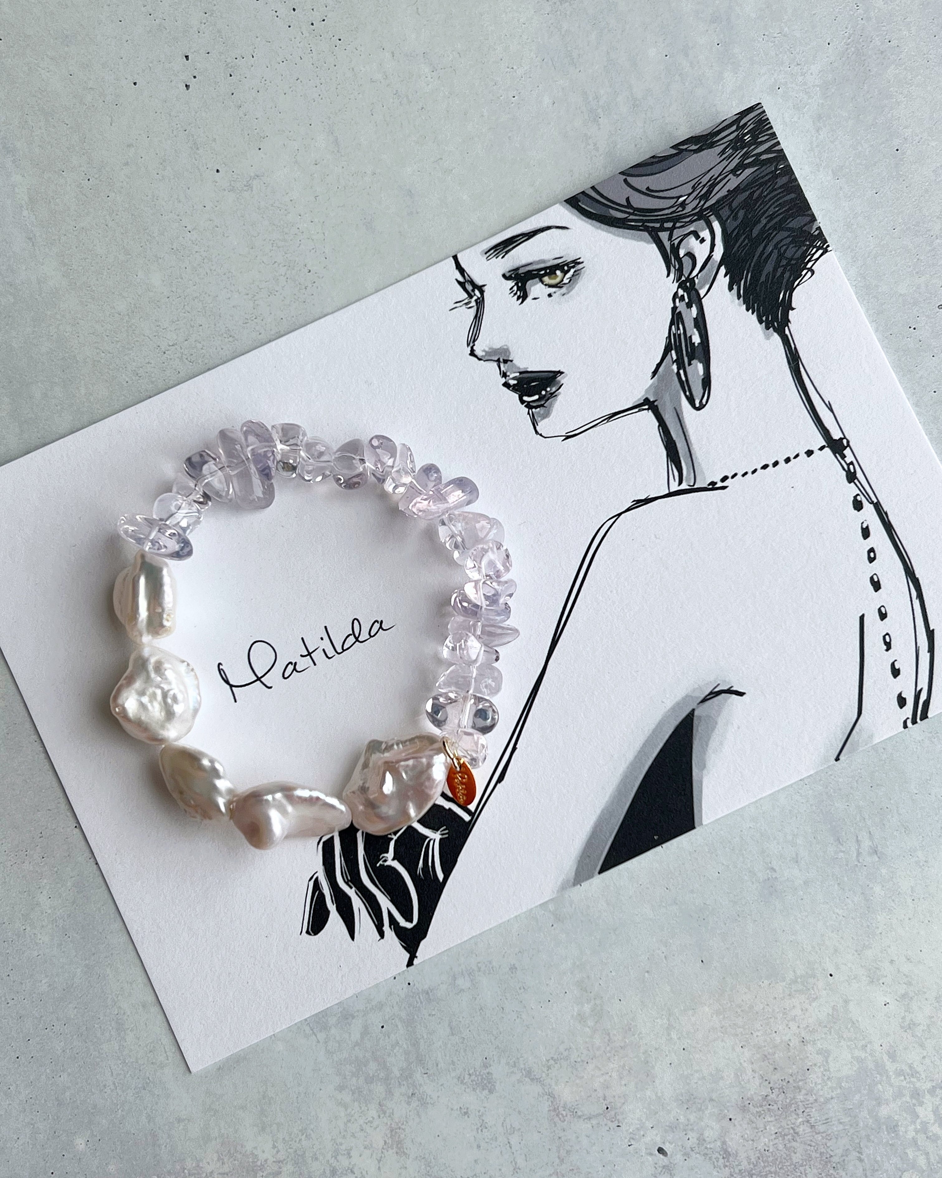 ごく淡いライラックカラーが儚いスコロライトのチップに、自然のままの造詣が奔放な個性と品のある色気を放つ淡水パールのペアリング。女性的な品格と優美さを醸し出しながらも、軽やかな印象が爽やかな一本。