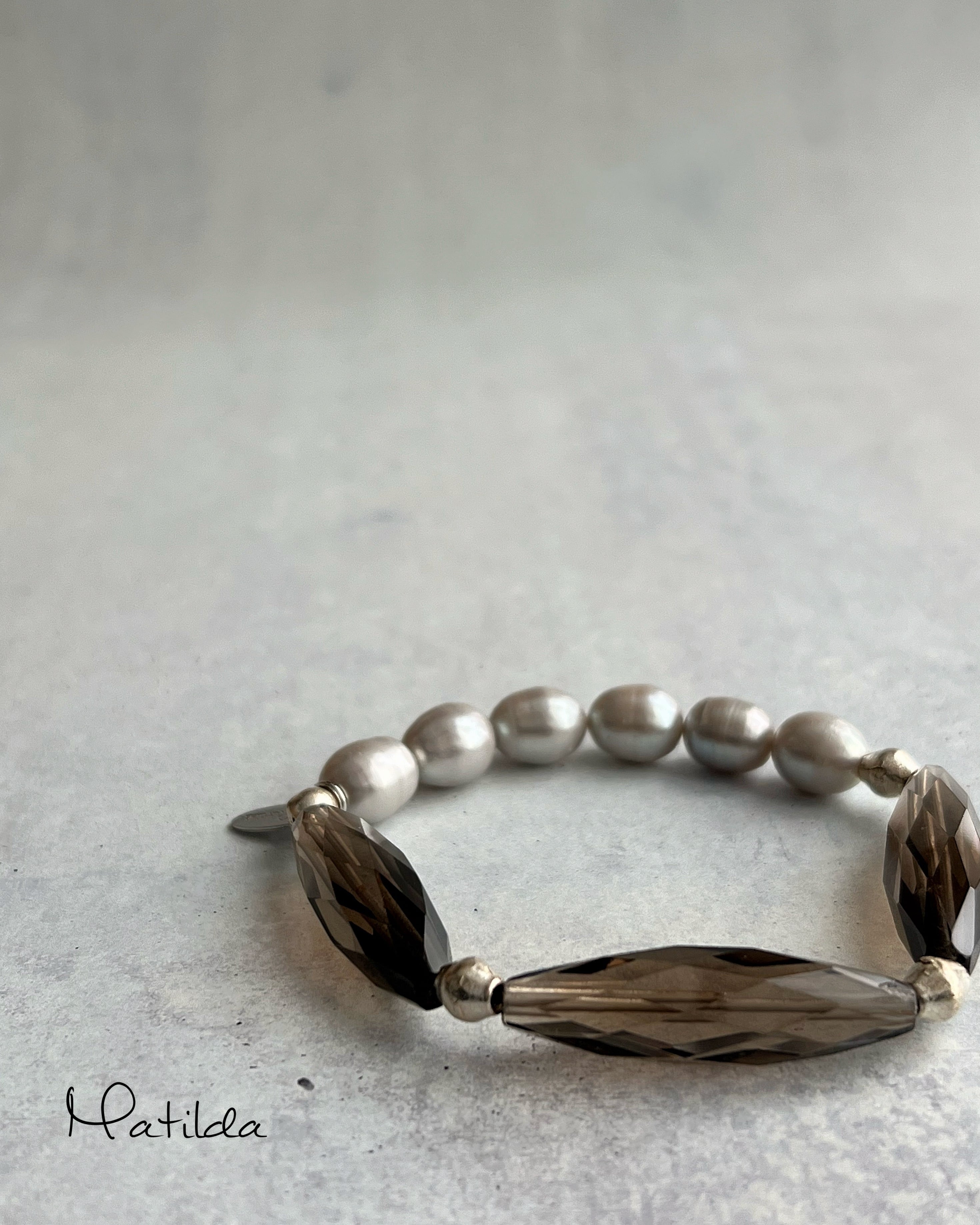 多面体カットがきらめくエレガントなスモーキークォーツをシルバービーズで繋げて、シルバーカラーの淡水パールとペアリング。