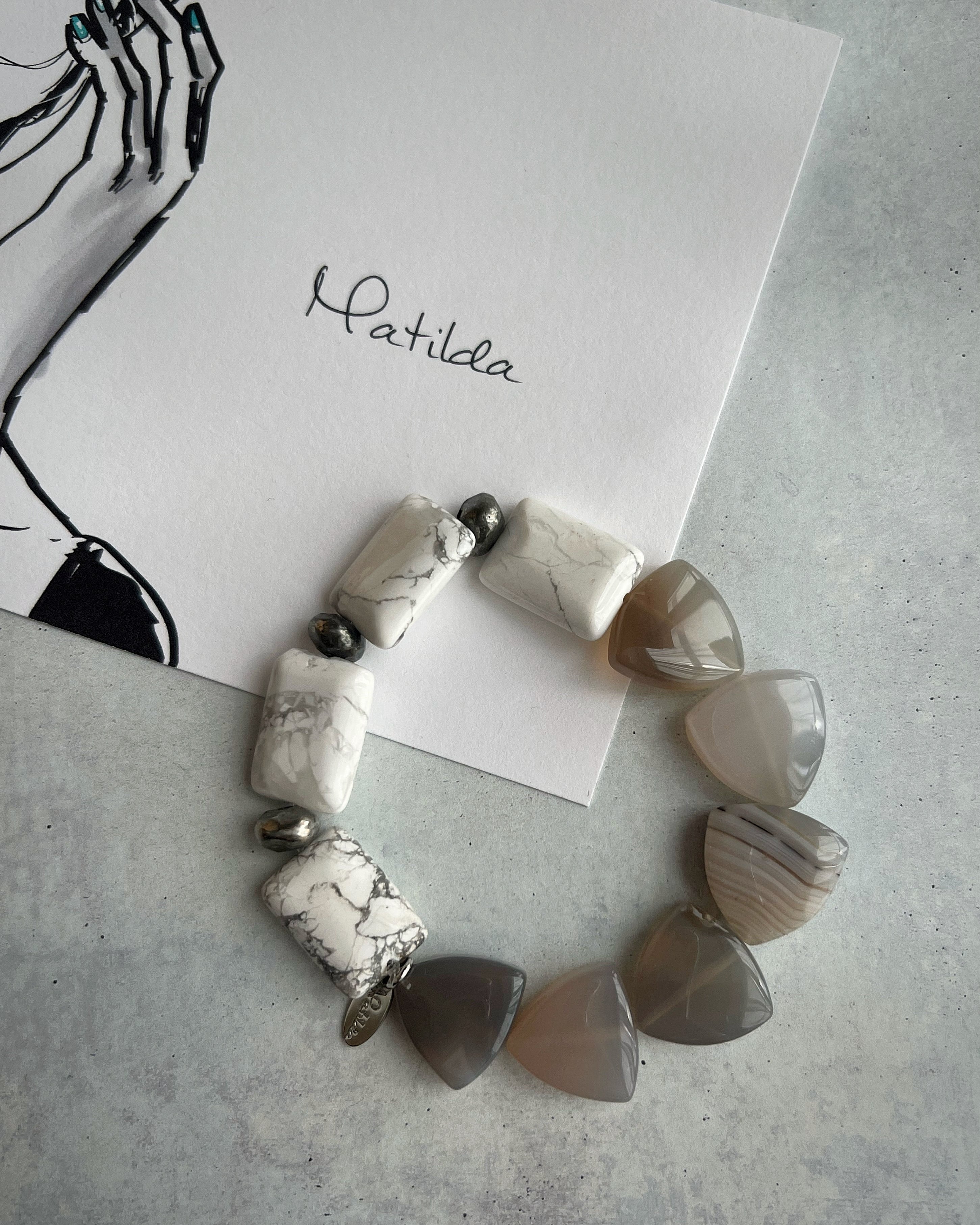 不揃いなシルバービーズで繋がれたハウライトのマットホワイトと、透け感のあるグレイッシュなアゲートのトライアングルビーズのコントラストに色気が溢れる一本。