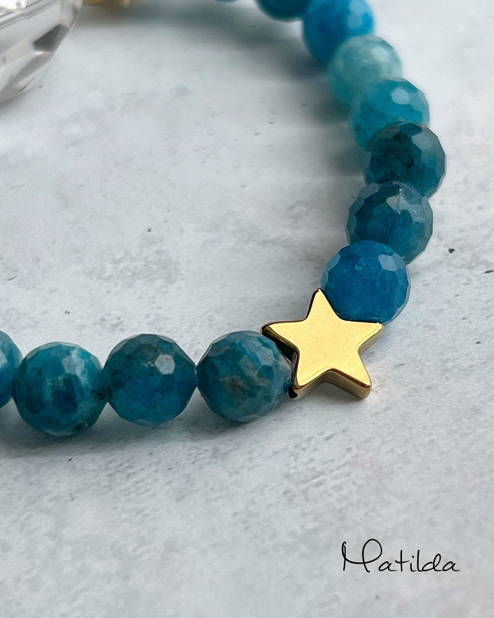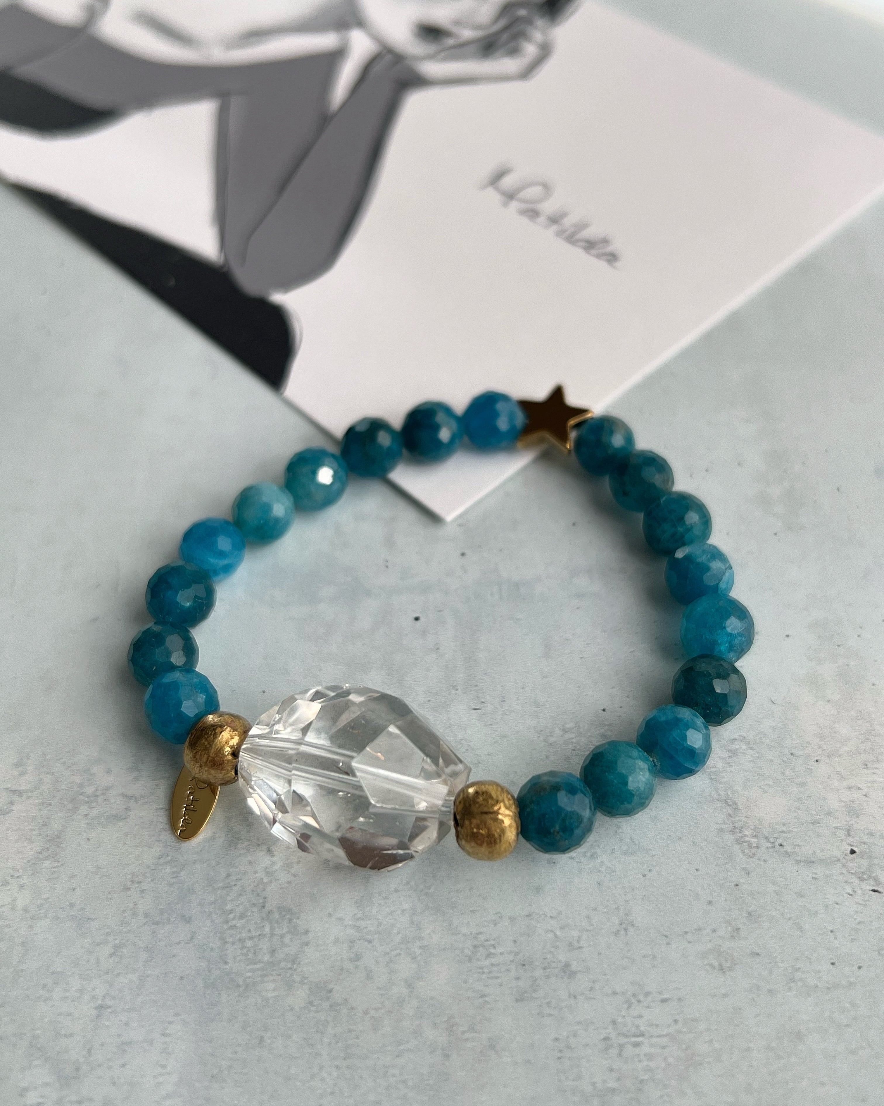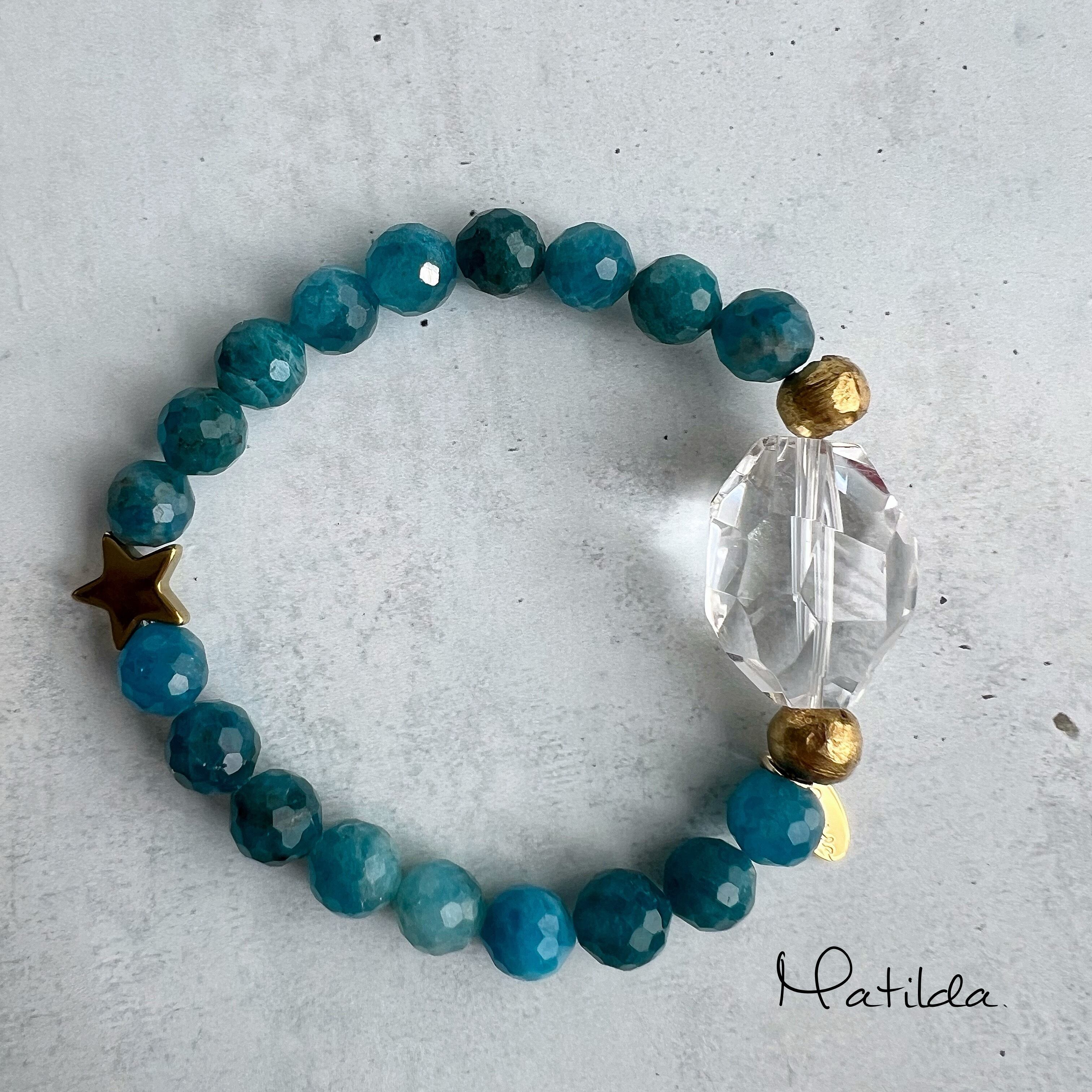伸びやかなティールブルーがどこか野生的なアパタイトが美麗なカッティングを施した大粒クォーツを引き立て、ヘマタイトスターと真鍮の深みのあるゴールドがきらりと目を引く。
