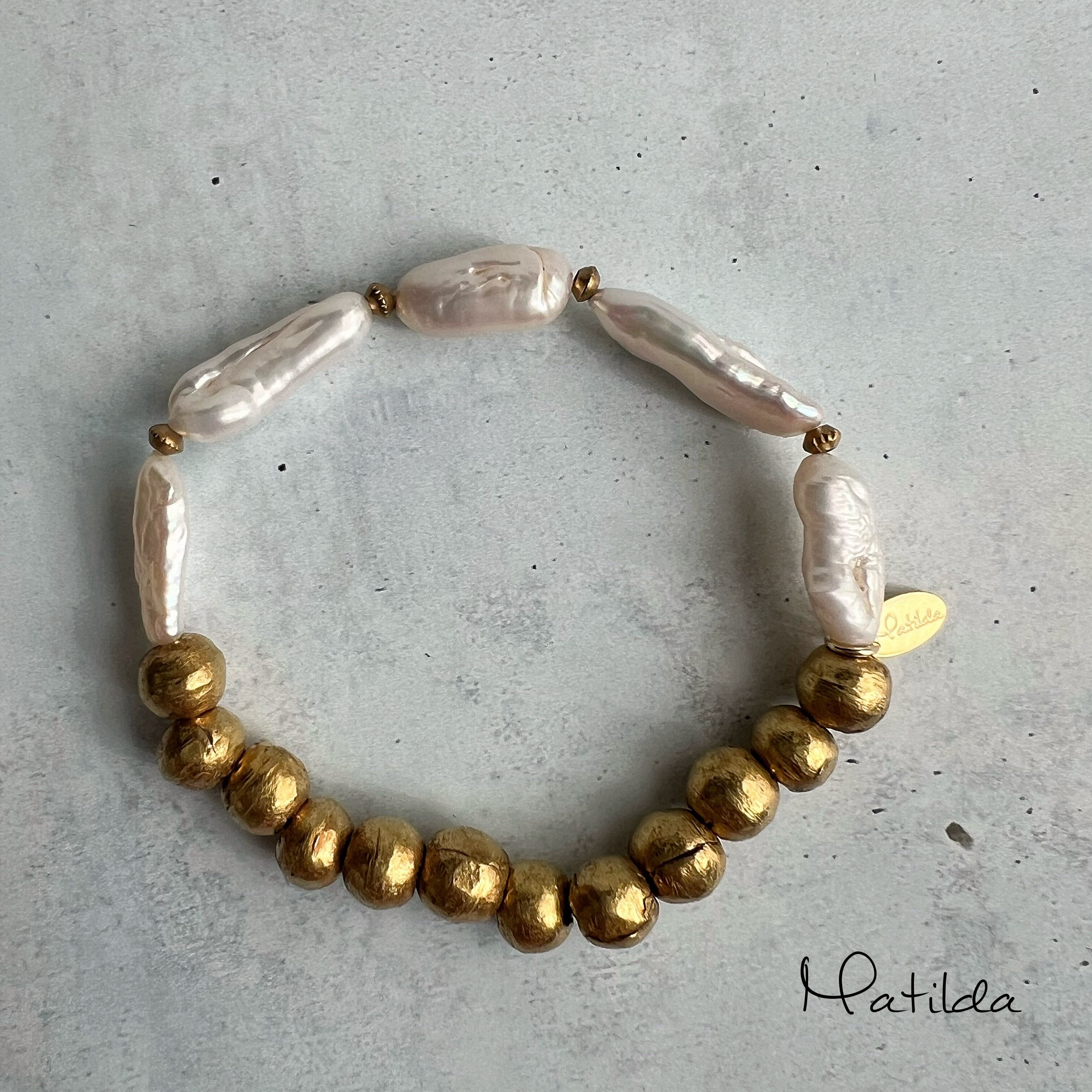 真鍮の小さな粒を潜ませ、オーバルシェイプにのびやかな色気が宿る淡水パールと、ナチュラルなシェイプの真鍮ビーズをペアリング。真鍮の華やかなアンティークゴールドと、パールの慎ましい艶感の対比が鮮やかな一本。