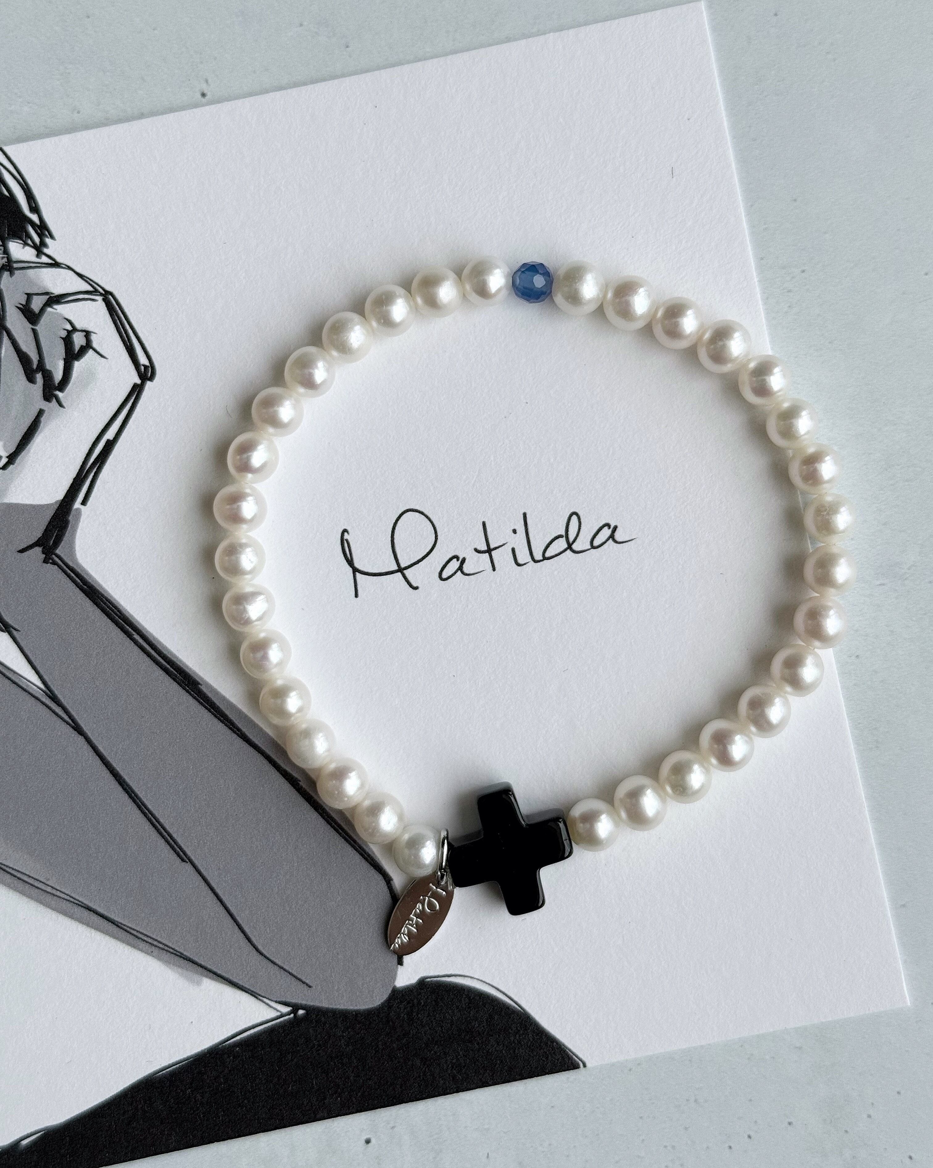 しっとりとした艶感が上品な淡水パールに、トゥルーブラックのオニキスのクロスとスカイブルーが透けるジェイドを1粒配して。