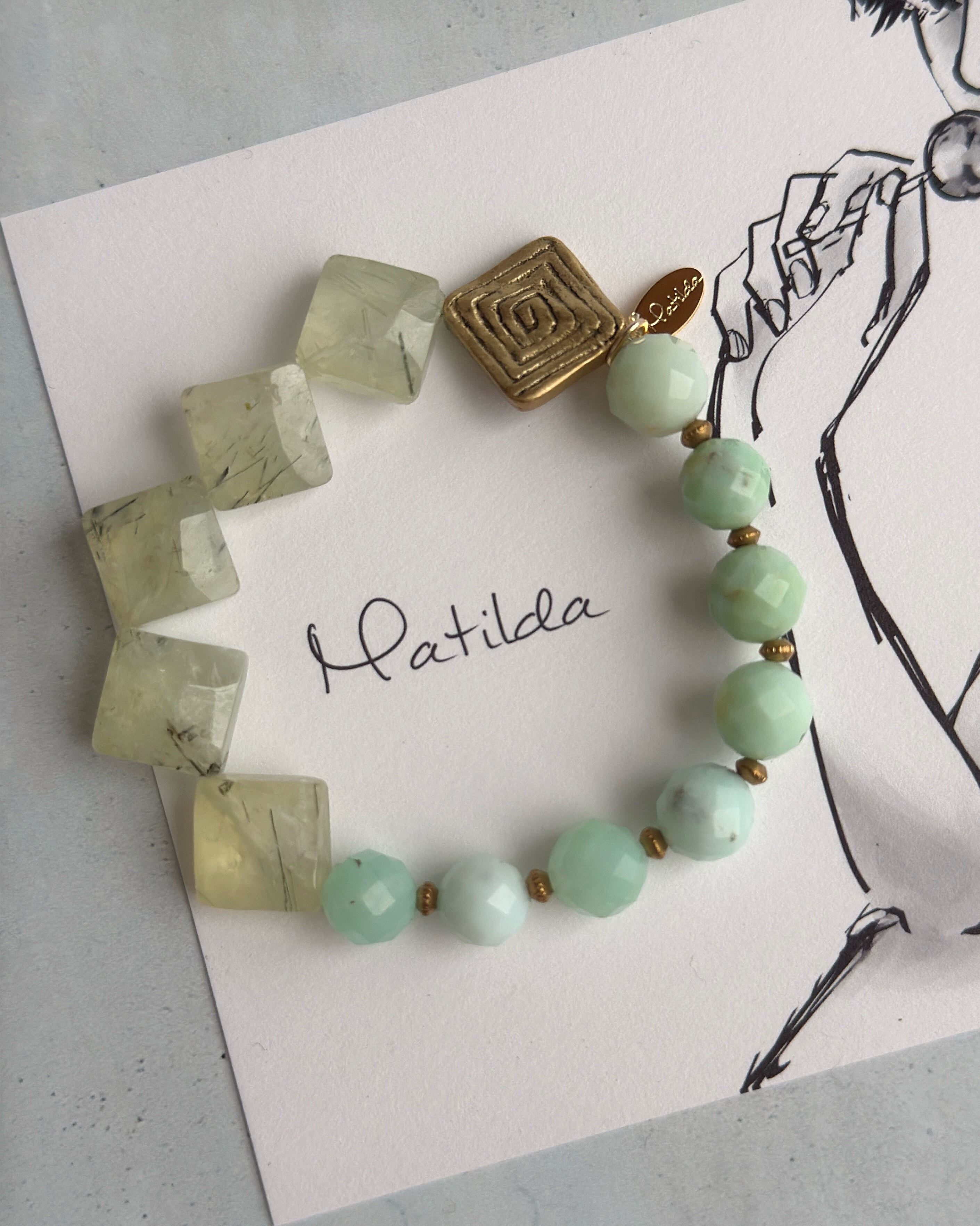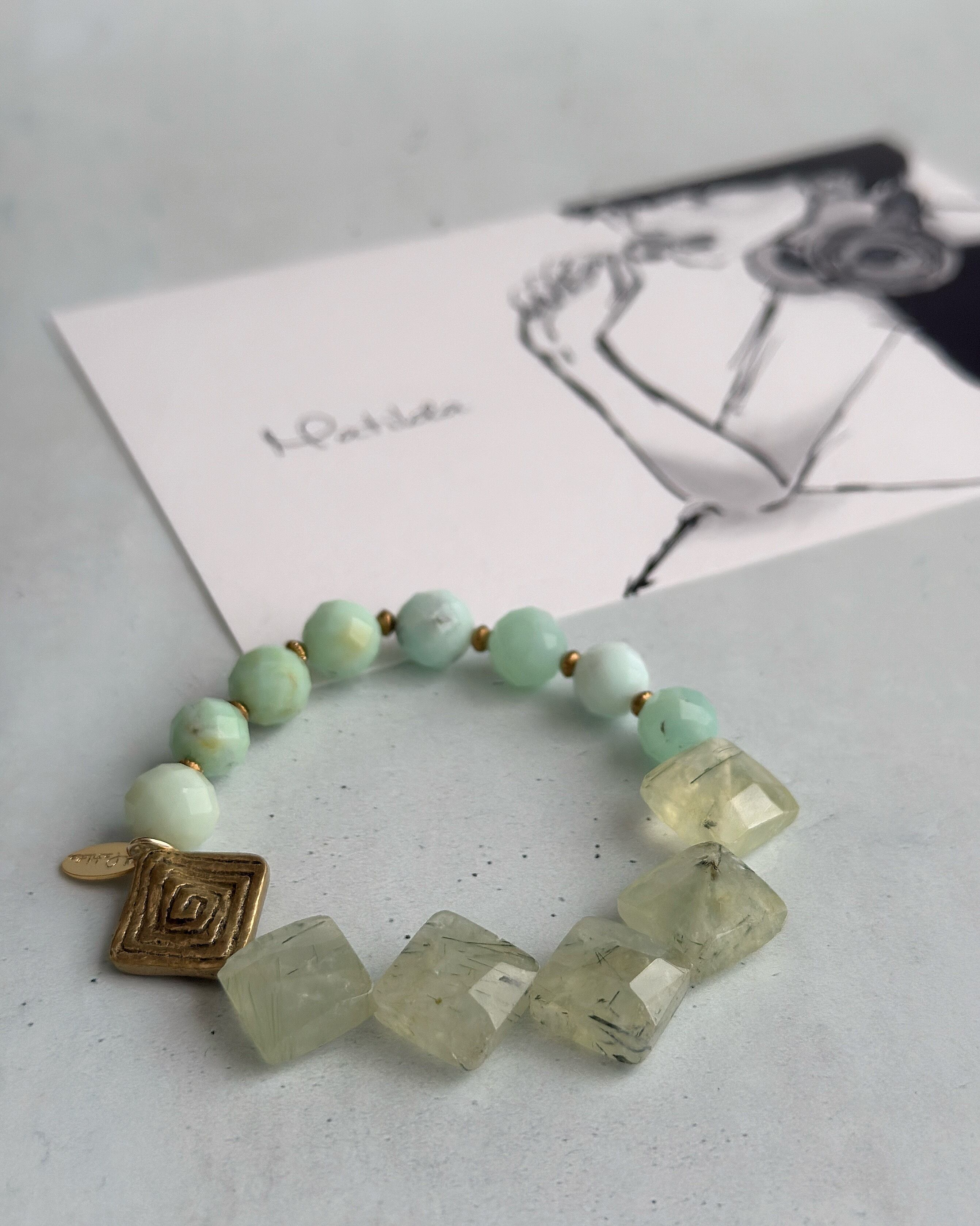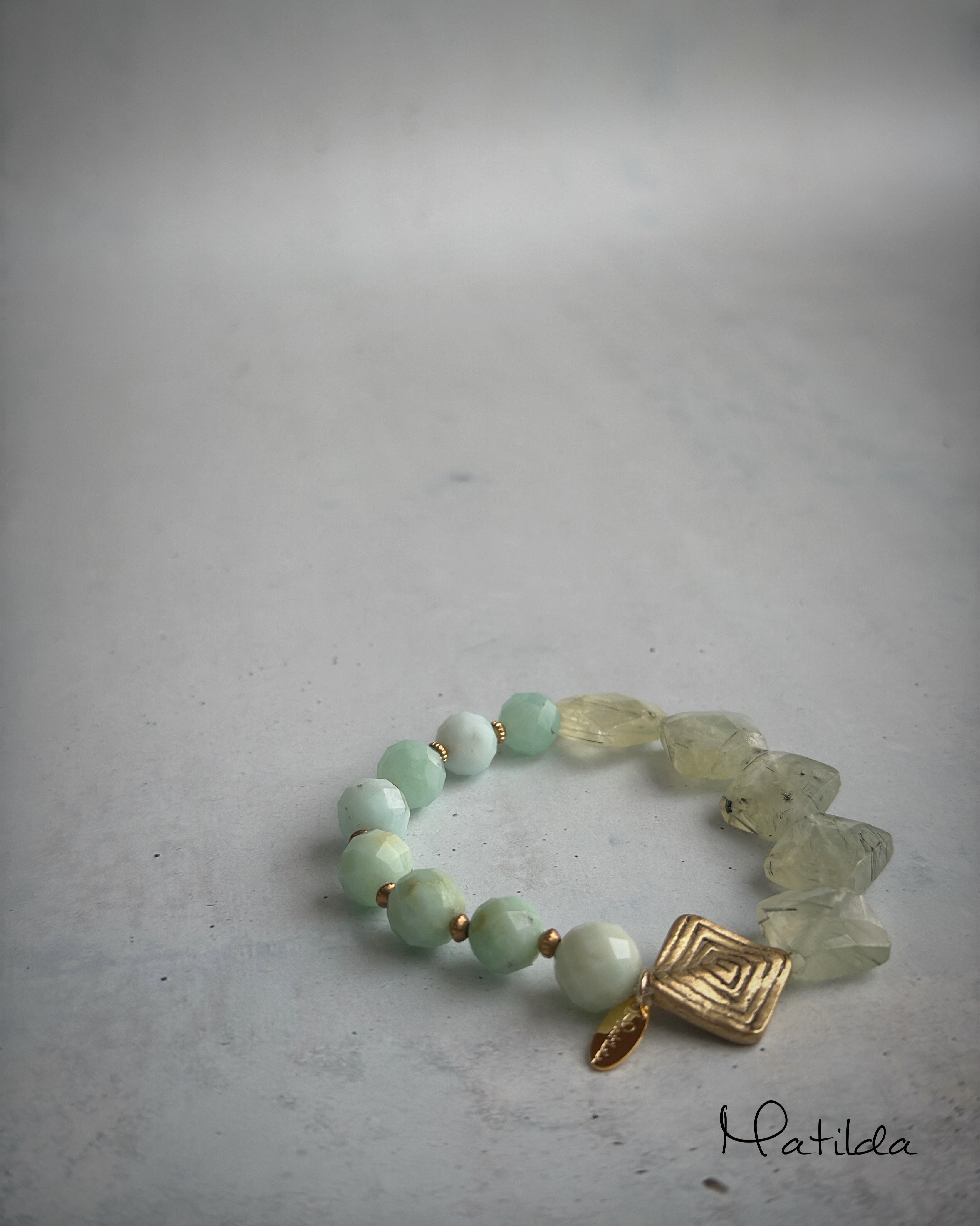 内包物の表情豊かなスクエアシェイプのプレナイトを淡いミルキーグリーンのクリソプレーズとペアリングした優しいグリーンベースのブレスレットを、クラシックゴールドの真鍮ビーズが華やかに引き立てる。
