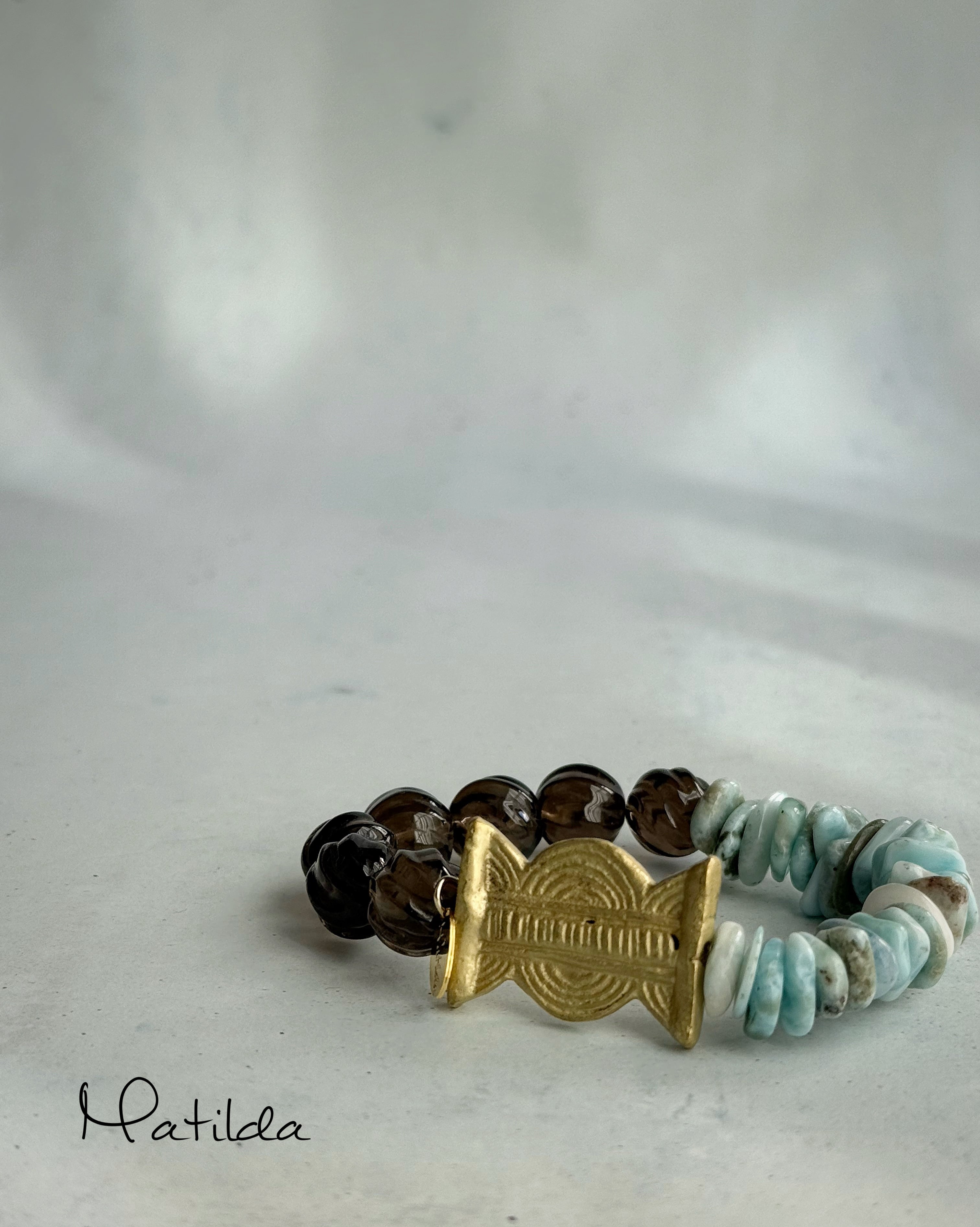 印象的な太陽モチーフの真鍮ビーズを中心に据え、ユニークな曲線のカッティングが施されたスモーキークォーツと爽やかなライトブルーが可憐なラリマーのチップの対比が美しい。