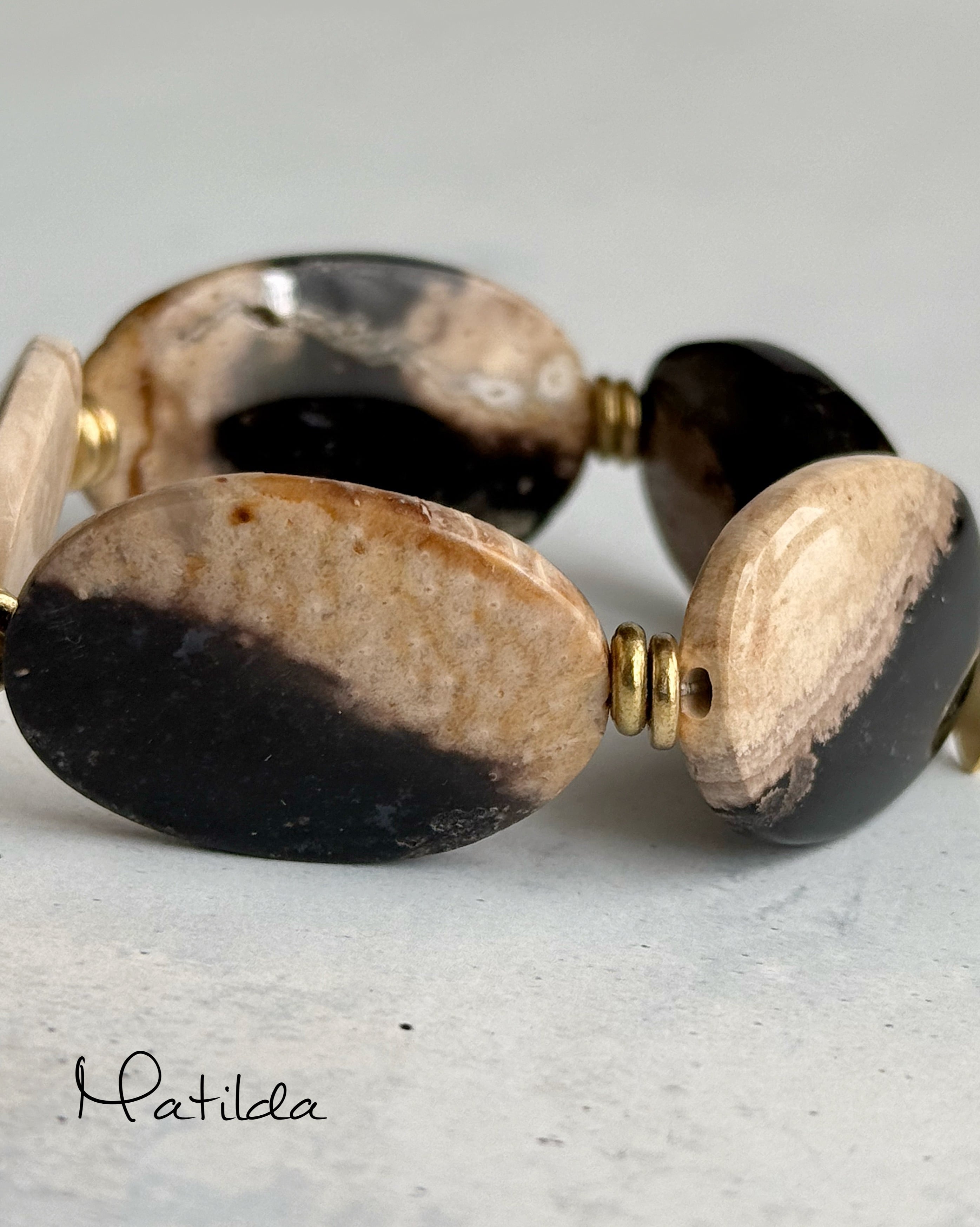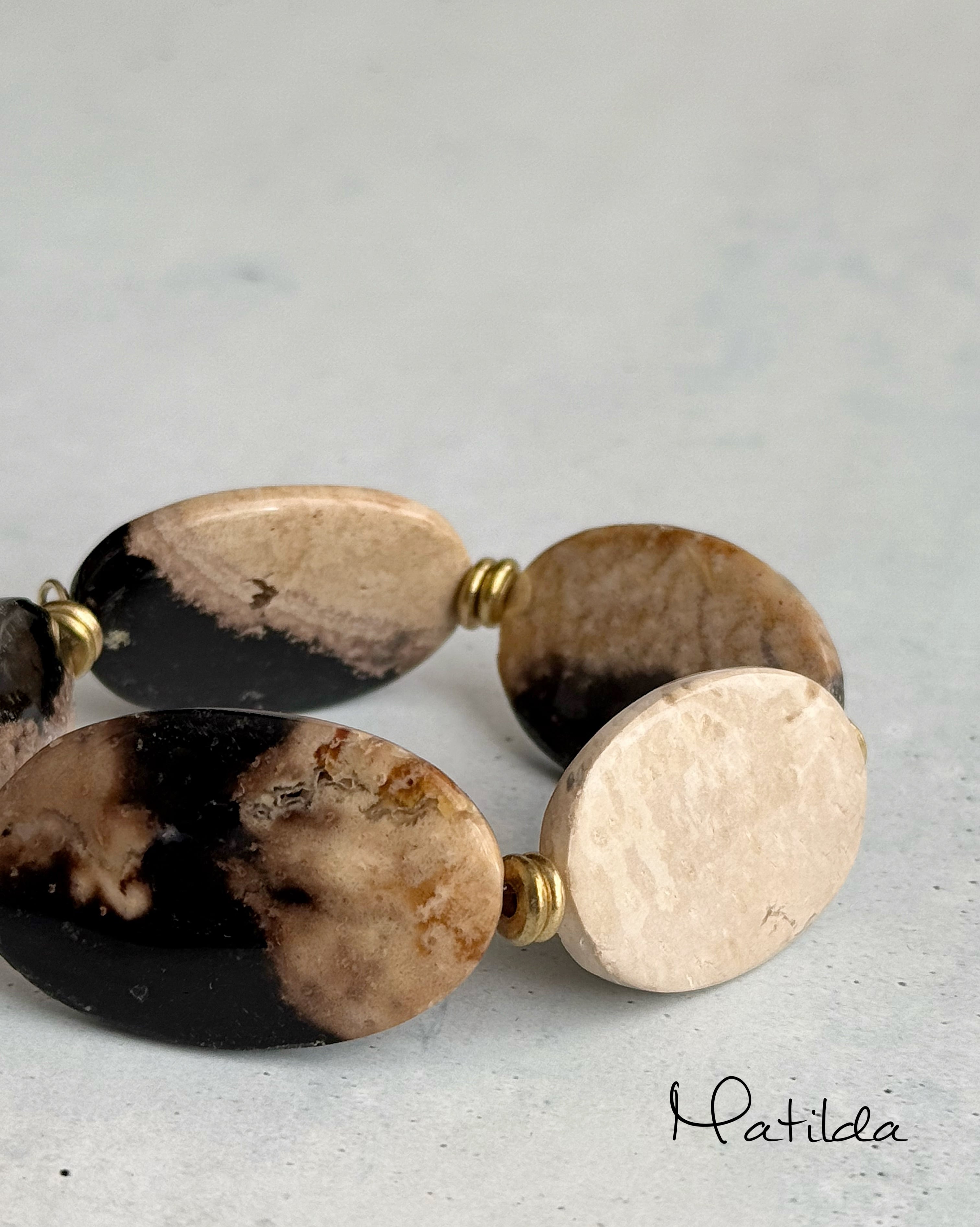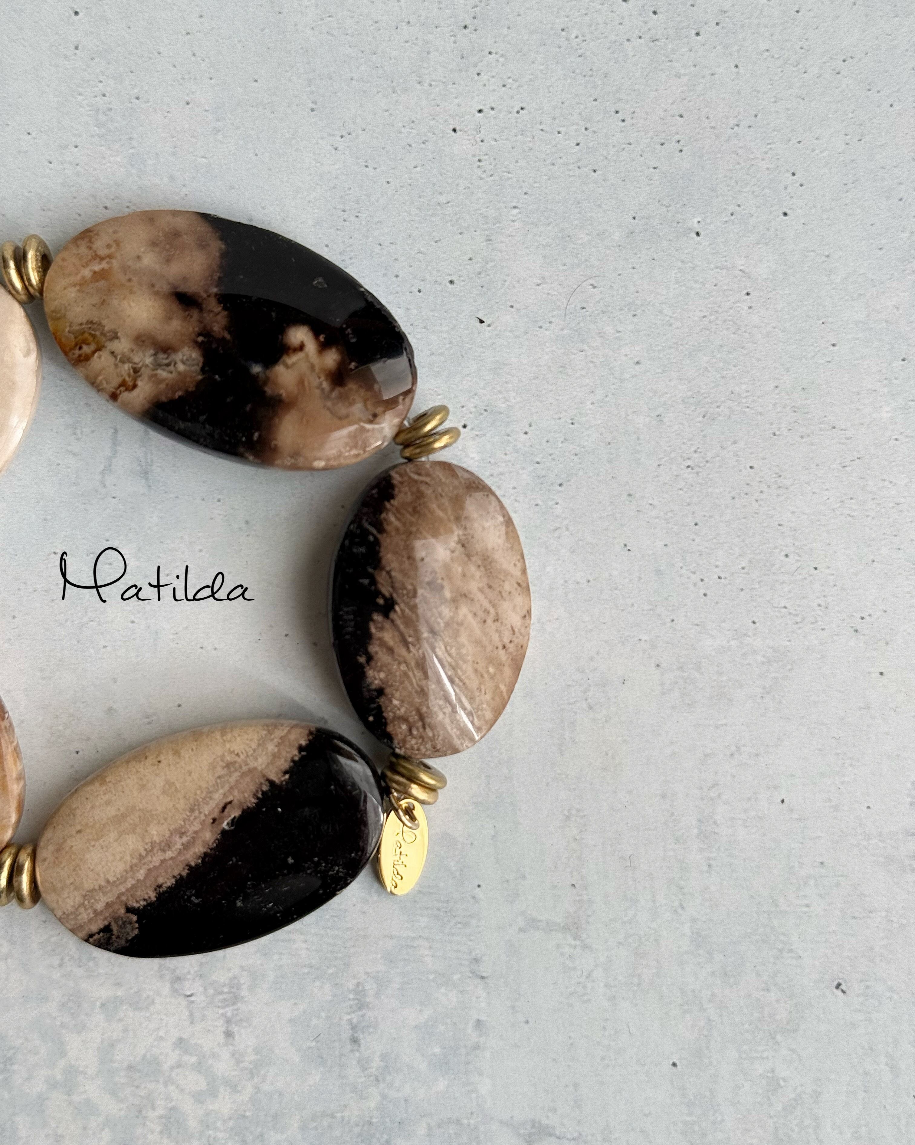 艶やかなブラックとアースベージュのバイカラーがシックなパームルートアゲートを、真鍮ビーズのアンティークゴールドが華やかに引き立てる。