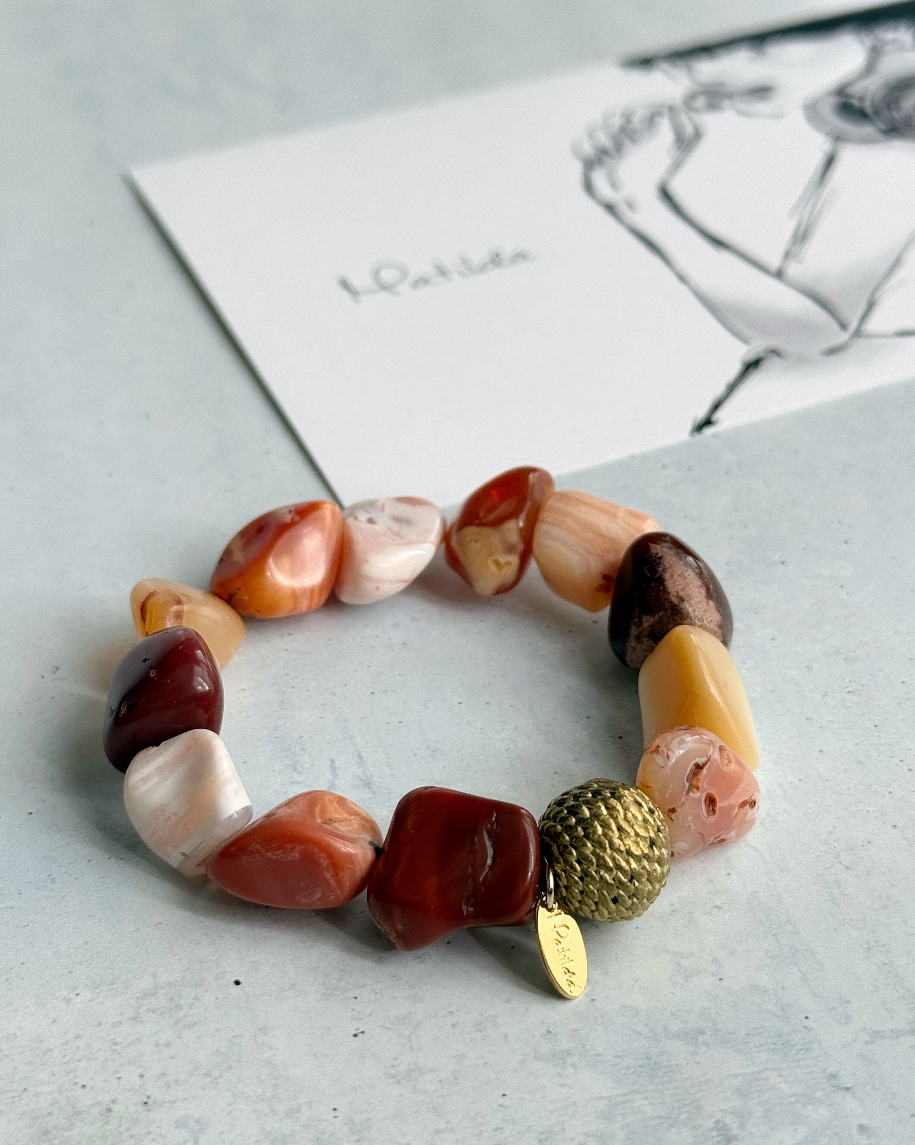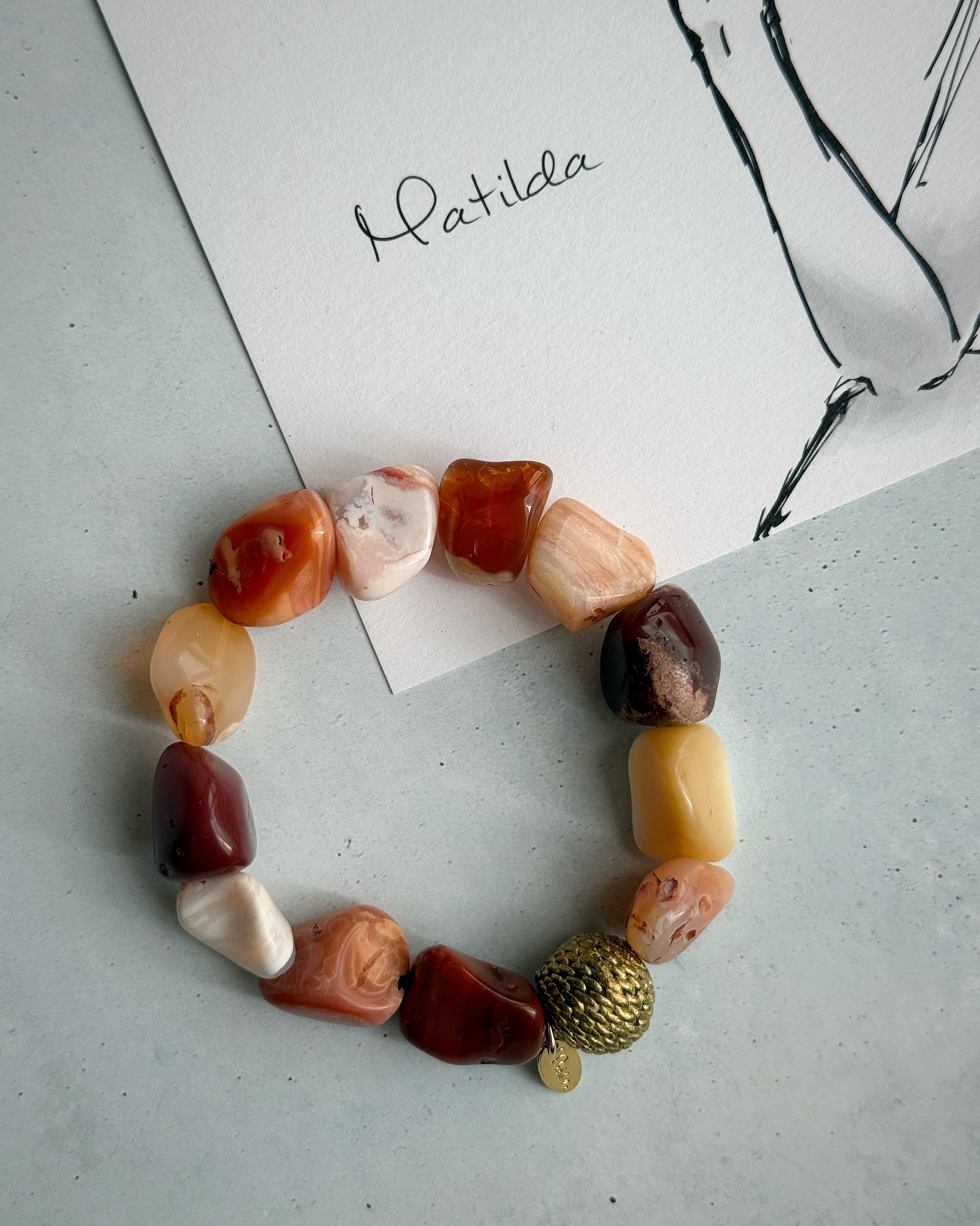 夕焼けのアンバーオレンジ、焚き火のハニーイエロー、街の灯りのブラウンレッド…人肌のようなあたたかみを感じさせるメキシカンオパールに、真鍮ビーズを一粒配して、ウォームなニュアンスをスタイリッシュに引き締めた一本。