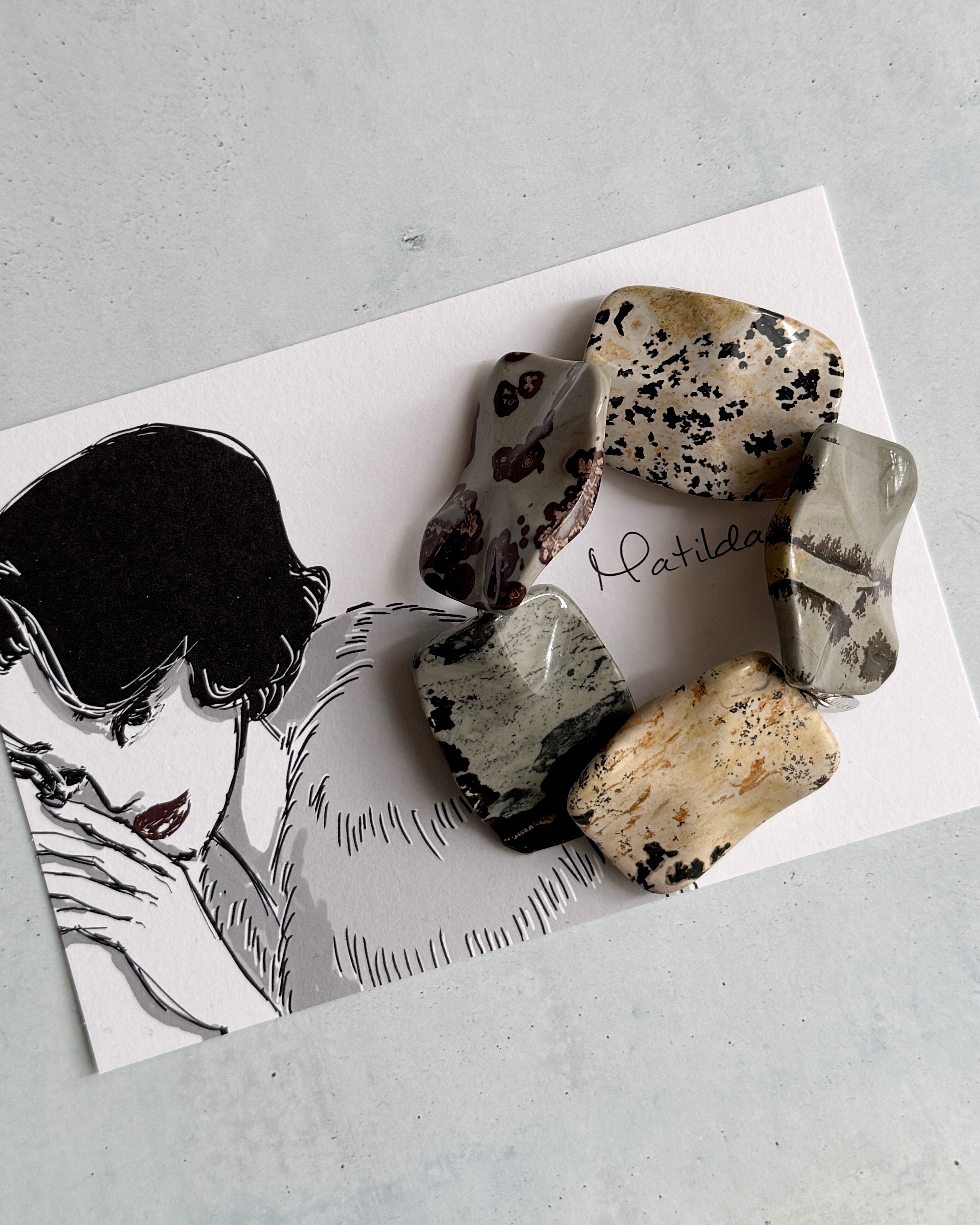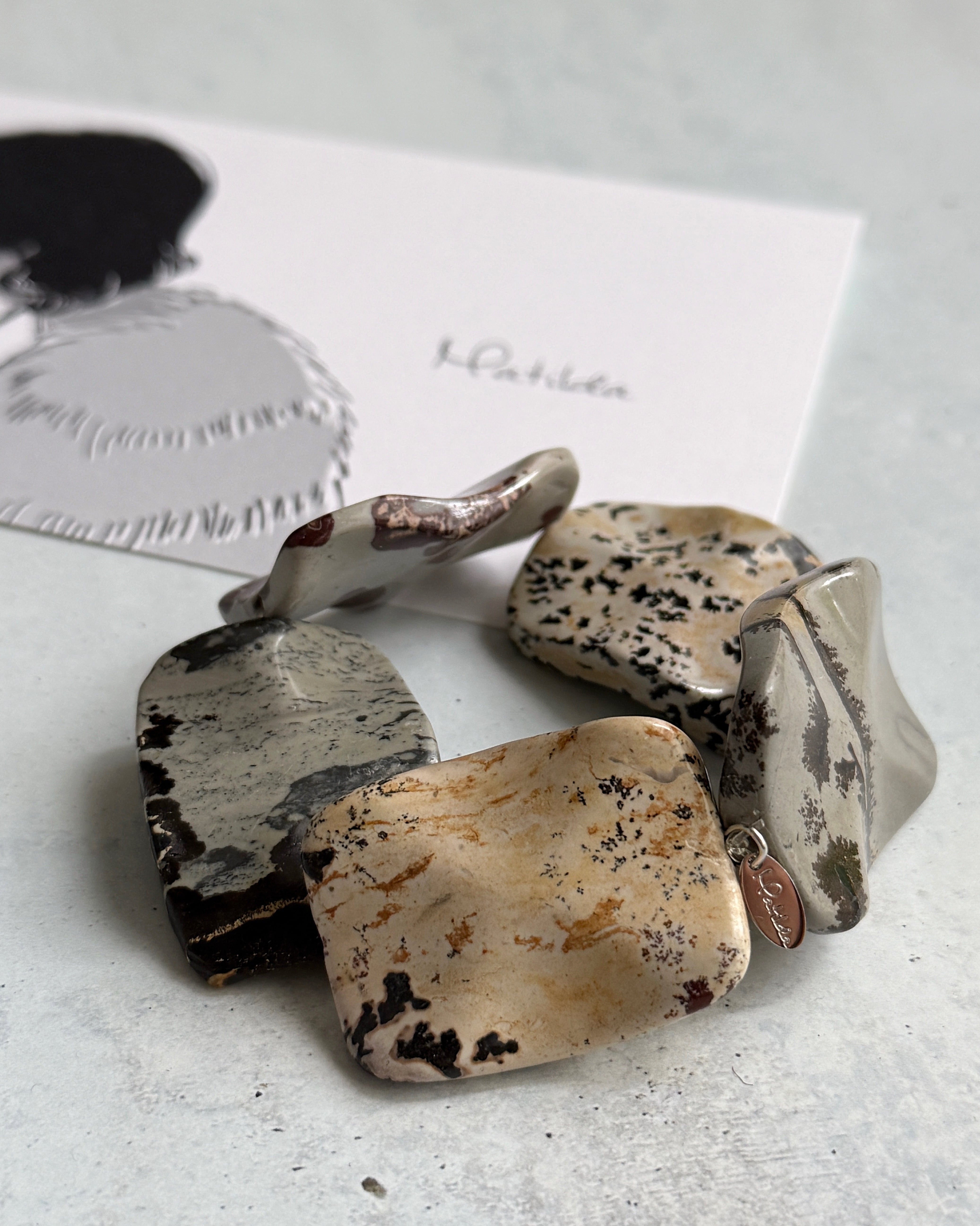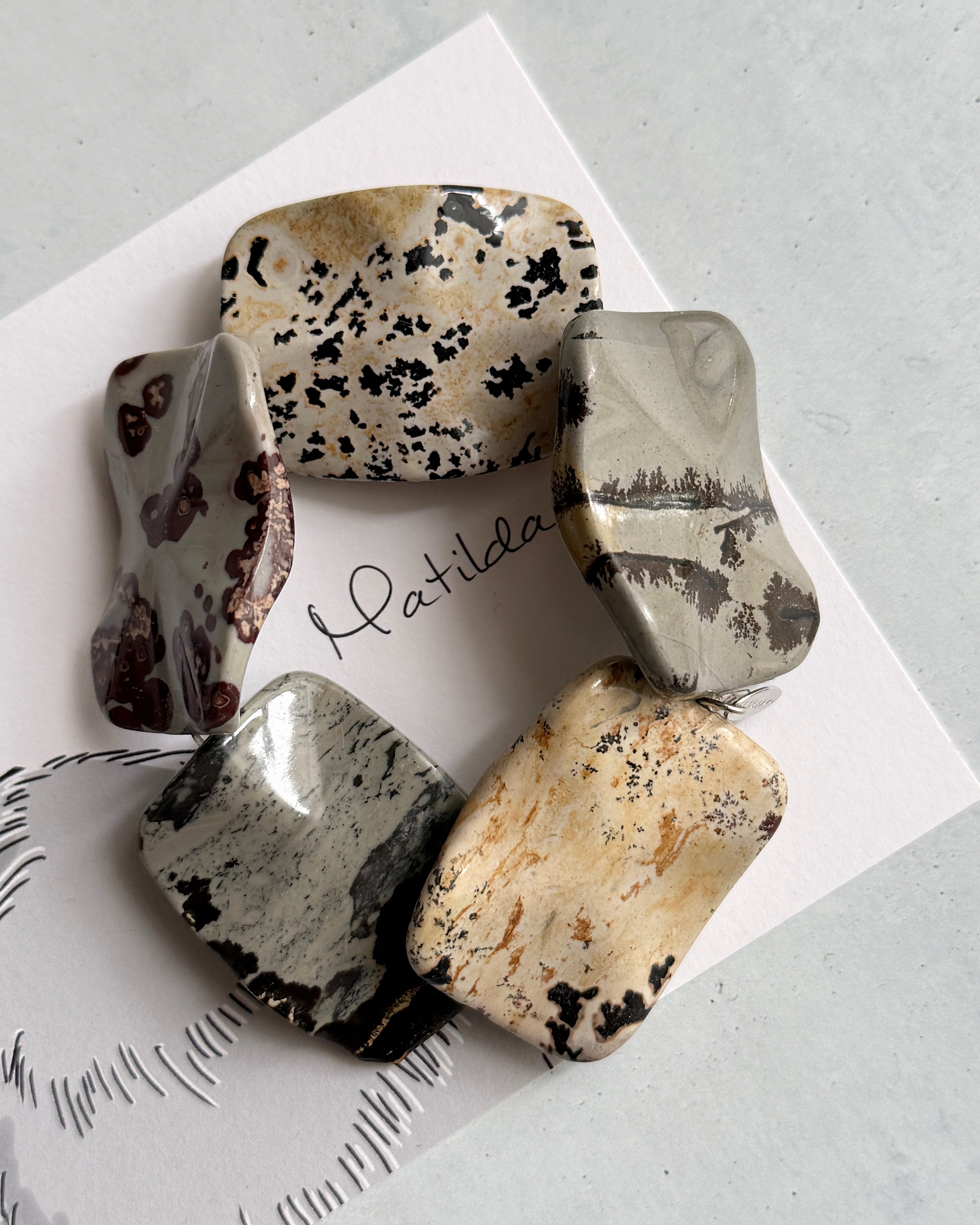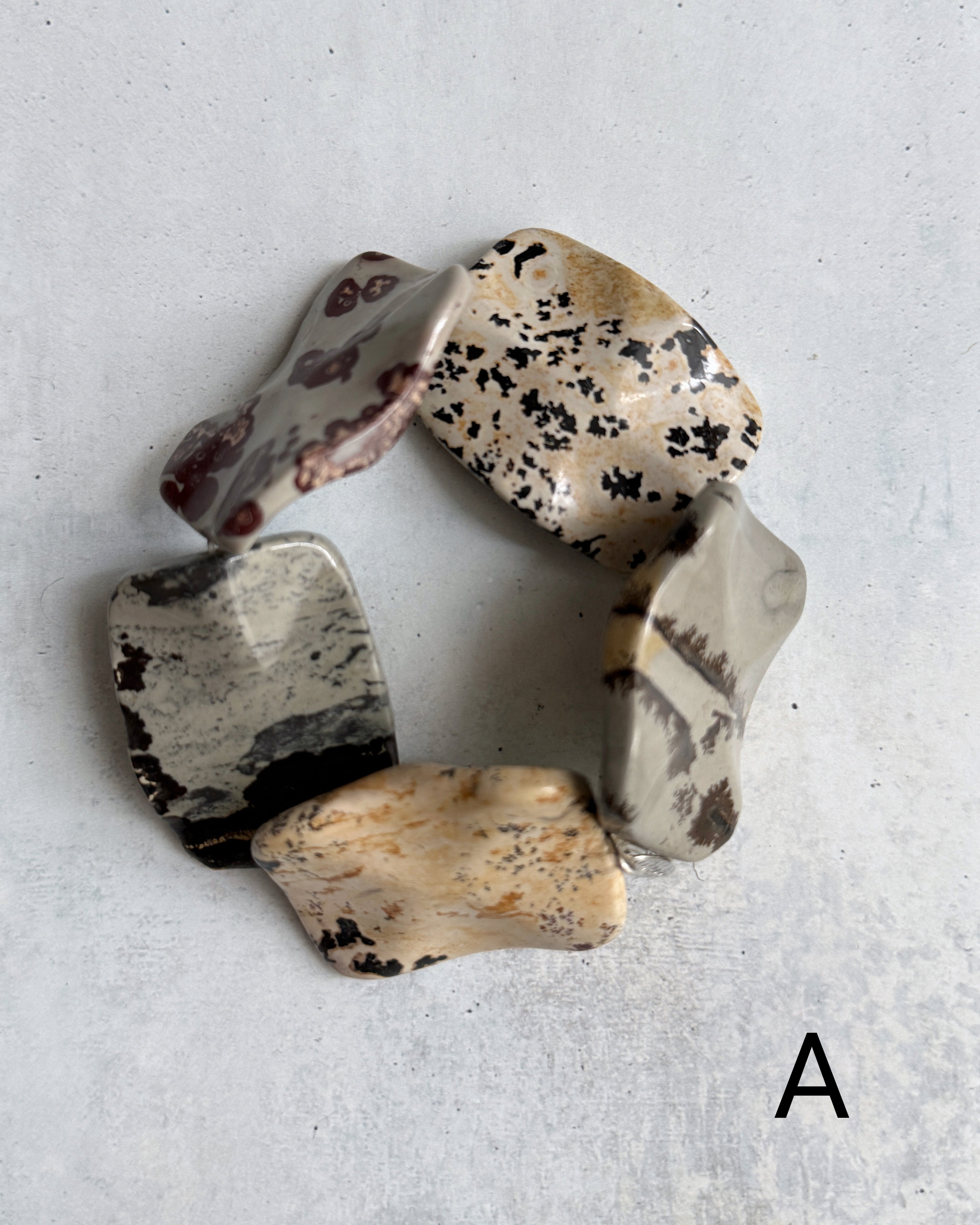 伸びやかに波打つジャスパーのプレートは5者5様の表情を浮かべ、それぞれの個性を活かした石模様が見るものの目を奪う。