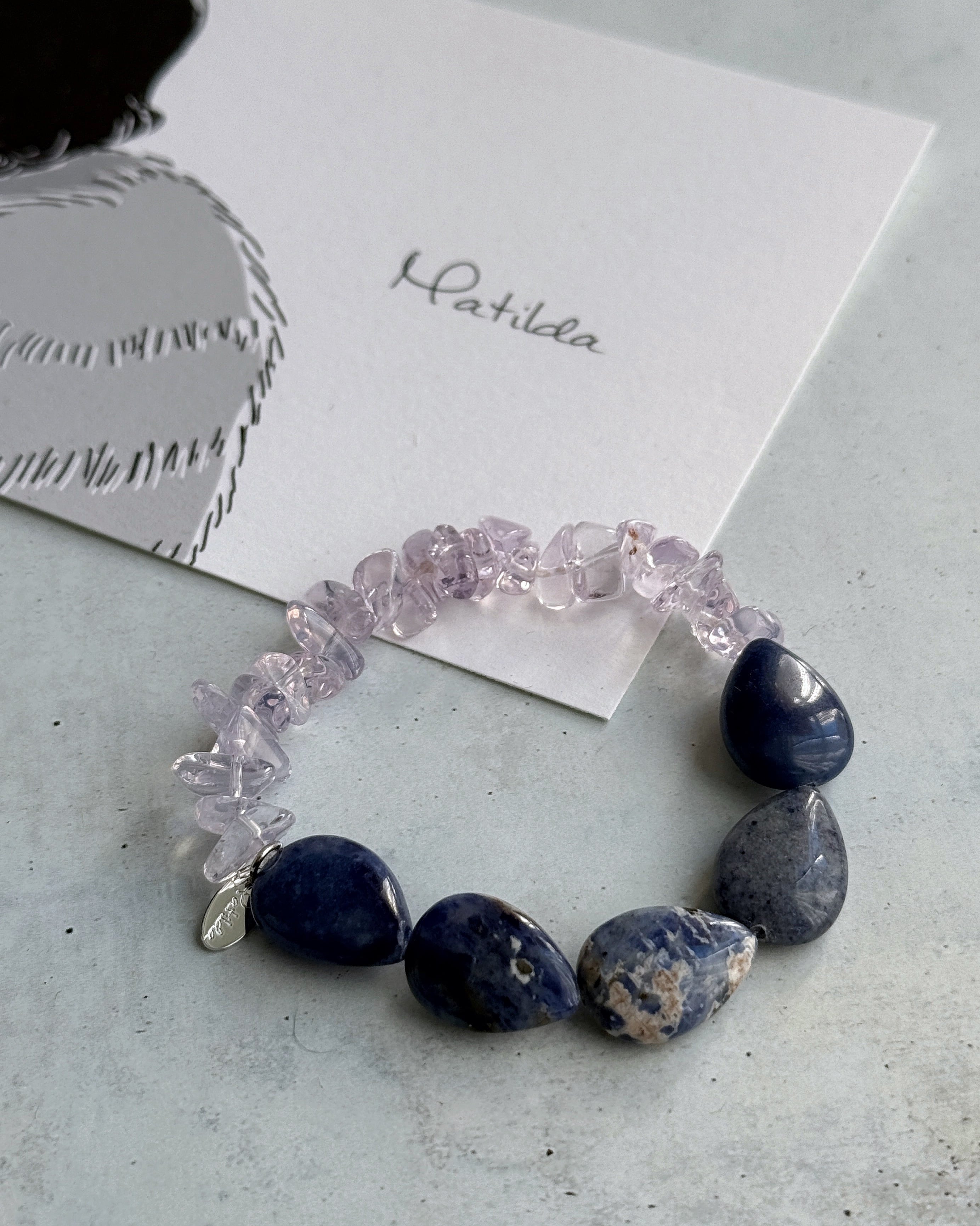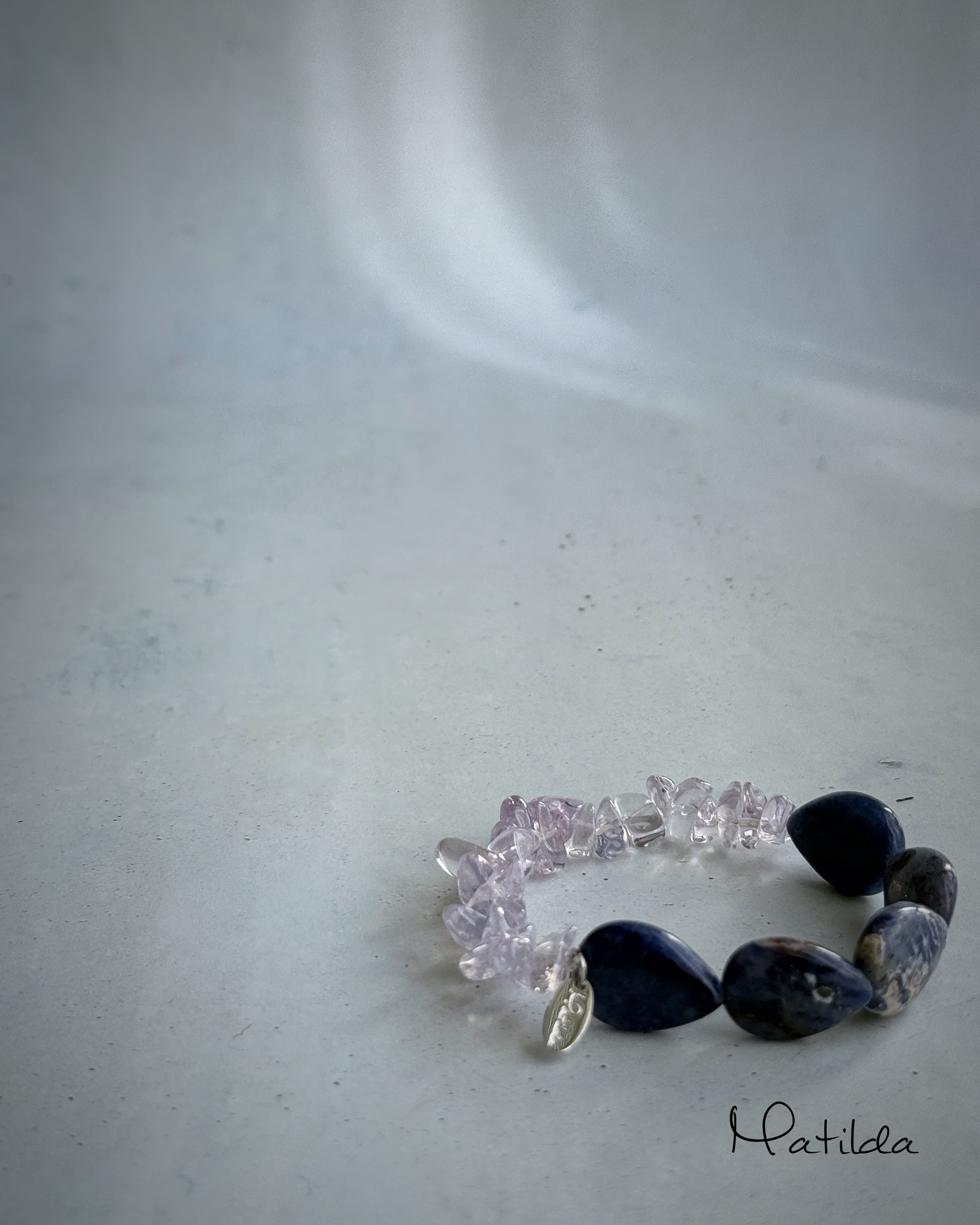 鮮麗なコバルトブルーが静謐な佇まいのソーダライトと、淡く透き通るラベンダーパープルが儚げで可憐なスコロライトをペアリング。